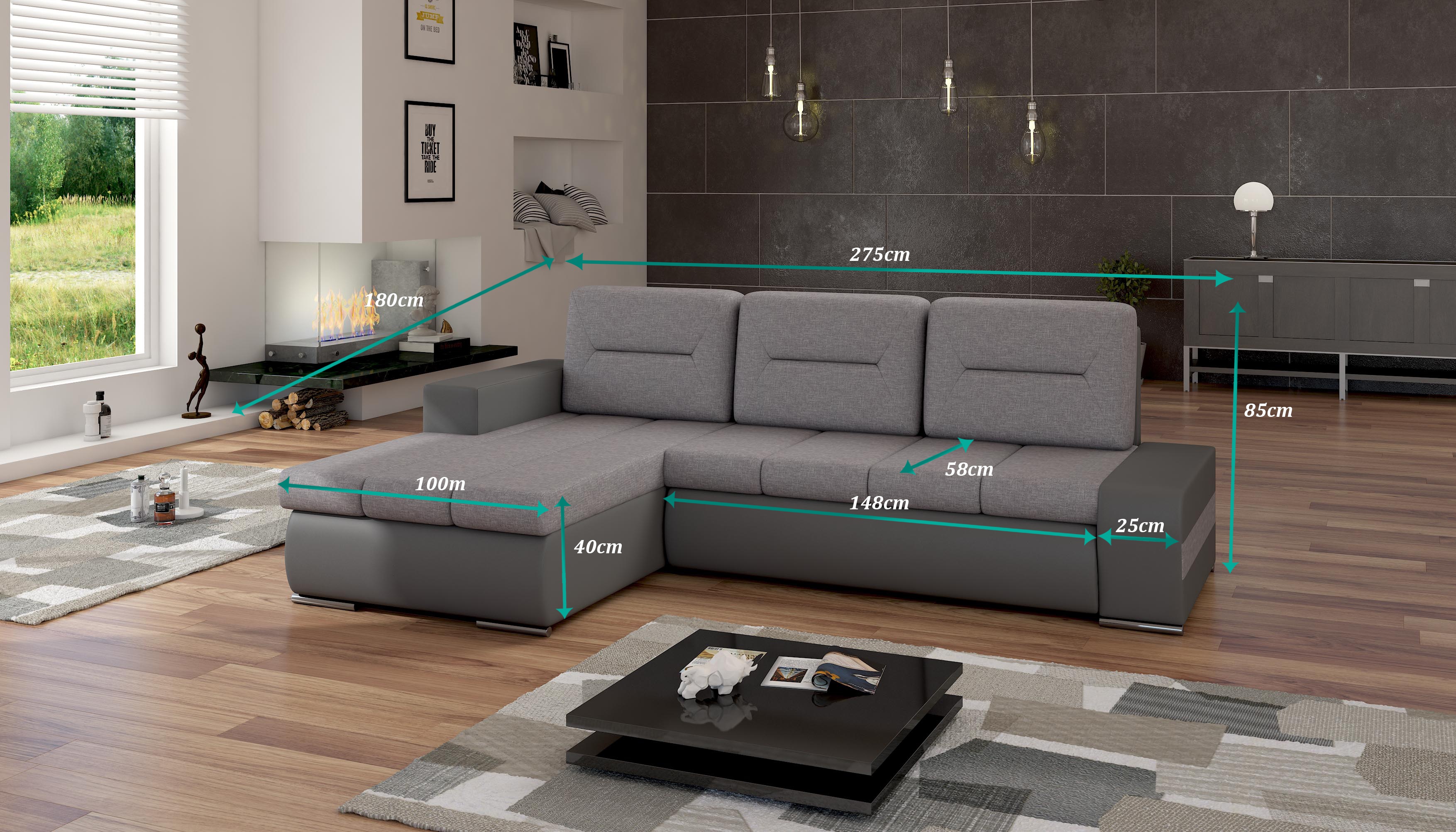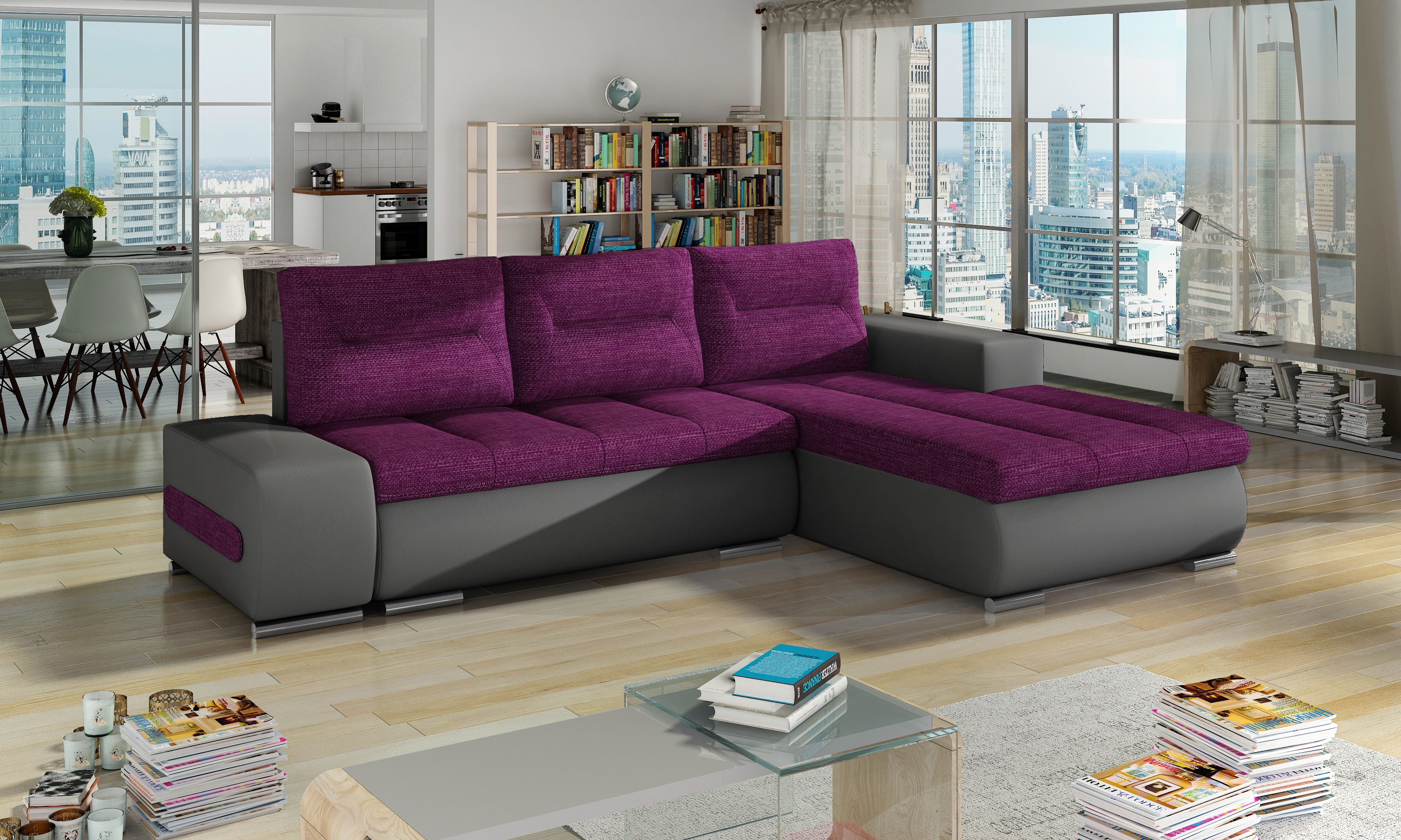 Rozkládací souprava s úložným prostorem v barevném provedení fialová/eko kůže Soft šedá. Spací plocha 195x135 cm. Výplň sedáků je vyrobena z vlnité pružiny a pěny T30 - tato kombinace zajišťuje měkkost, pružnost a dostatečnou oporu během odpočinku. Souprava zaujme díky jemným dekorativním prvkům v podobě elegantního prošívání na sedadlech a zádech. Potahová látka jako na hlavní fotografii, provedení pravé. Možnost výběru pravého/levého provedení.