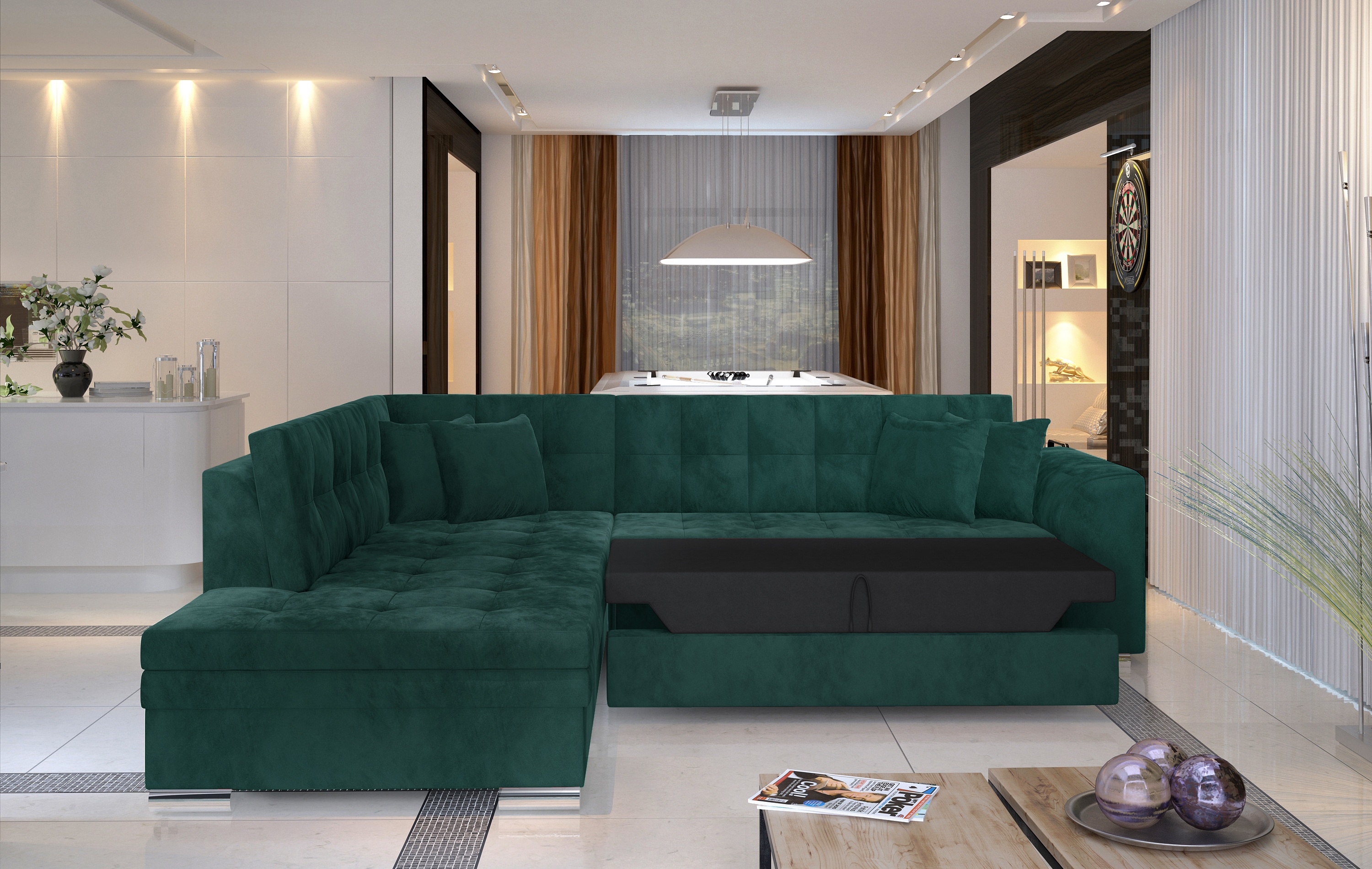 Rozkládací souprava v barevném provedení tmavě modrá. Spací plocha 200x126 cm. Výplň sedáků je vyrobena z vlnité pružiny a pěny T30 - tato kombinace zajišťuje měkkost, pružnost a dostatečnou oporu během odpočinku. Přesné šití a čalouněná tkanina nejvyšší kvality činí nábytek velmi elegantním. Potahová látka jako na hlavní fotografii, provedení pravé. Možnost výběru pravého/levého provedení.