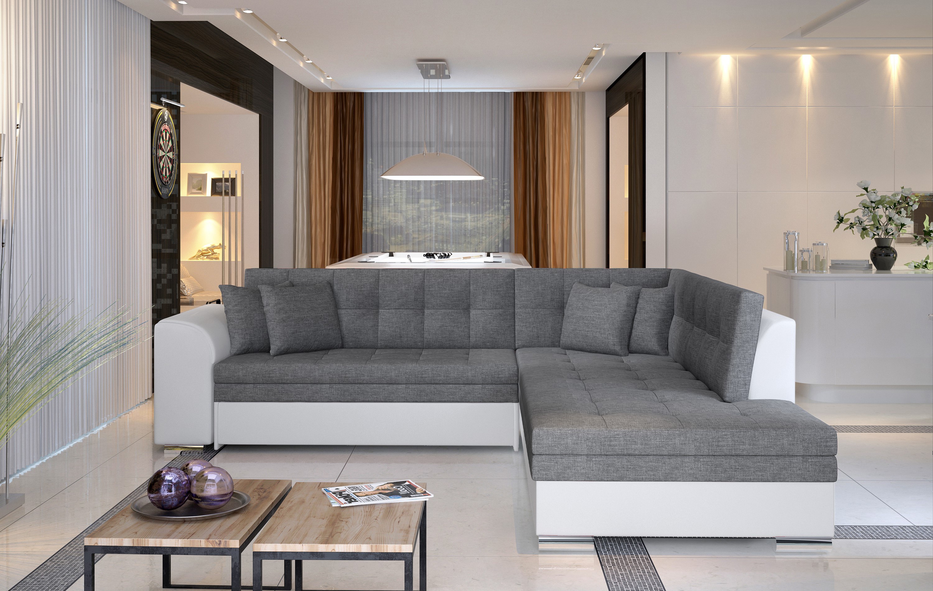 Rozkládací souprava v barevném provedení šedá/eko kůže bílá. Spací plocha 200x126 cm. Výplň sedáků je vyrobena z vlnité pružiny a pěny T30 - tato kombinace zajišťuje měkkost, pružnost a dostatečnou oporu během odpočinku. Přesné šití a čalouněná tkanina nejvyšší kvality činí nábytek velmi elegantním. Potahová látka jako na hlavní fotografii, provedení pravé. Možnost výběru pravého/levého provedení.