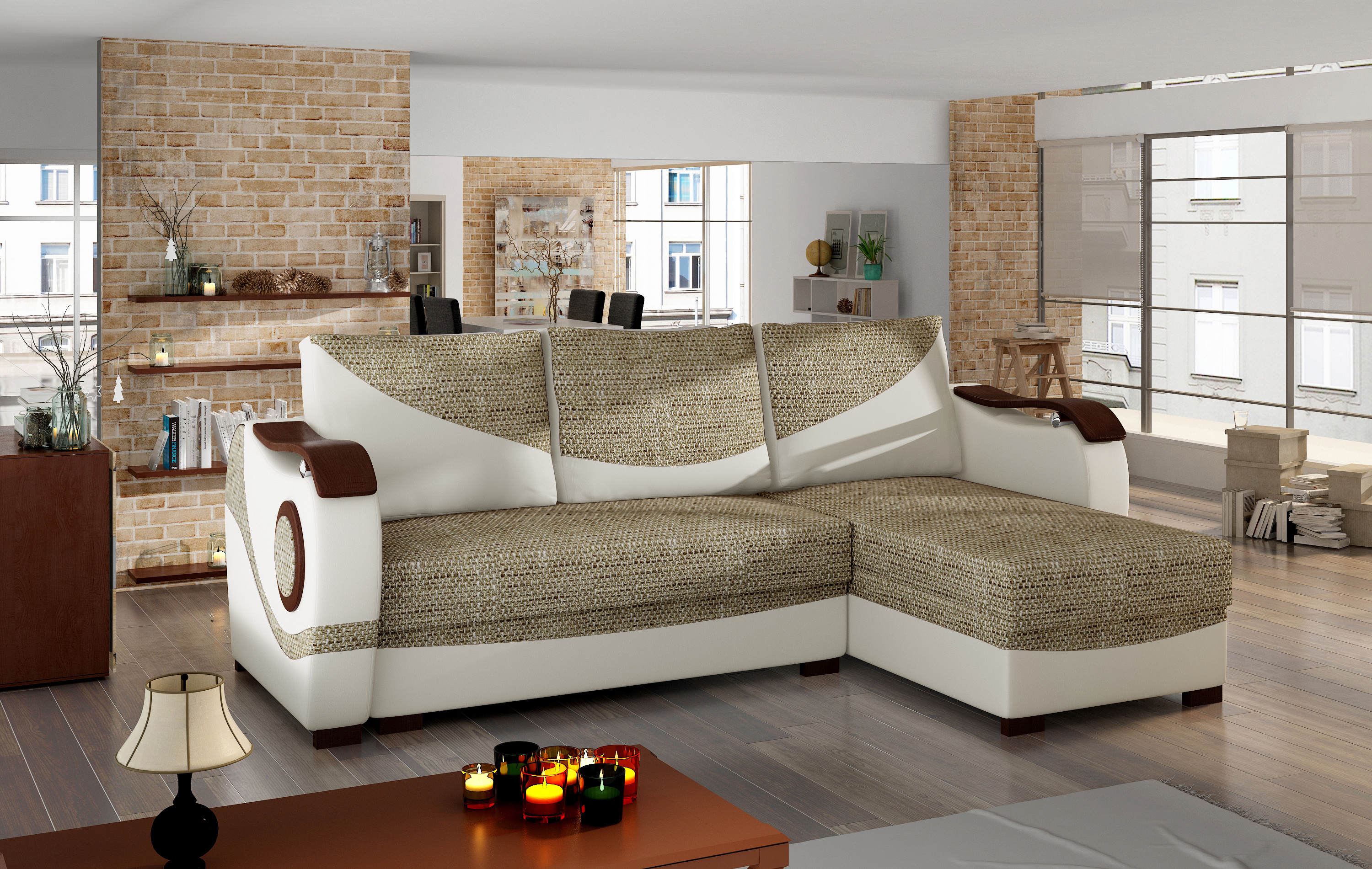 Rozkládací souprava Puerto v barevném provedení látka Berlin 03/eko kůže Soft 33. Výplň sedáků je vyrobena z bonelu a T25 pěny. Rozkládem v podobě výsuvné spodní části a výklopného opěradla vznikne spací plocha 195x125 cm. Souprava má dva prostorné úložné prostory na ložní prádlo - jeden z nich se nachází v podnožce, zatímco druhý je k dispozici po nastavení nábytku do noční funkce. Doplňkové dekorace v podobě dřevěných prvků na područkách, bočnicích a nohách. Potahová látka jako na hlavní fotografii.