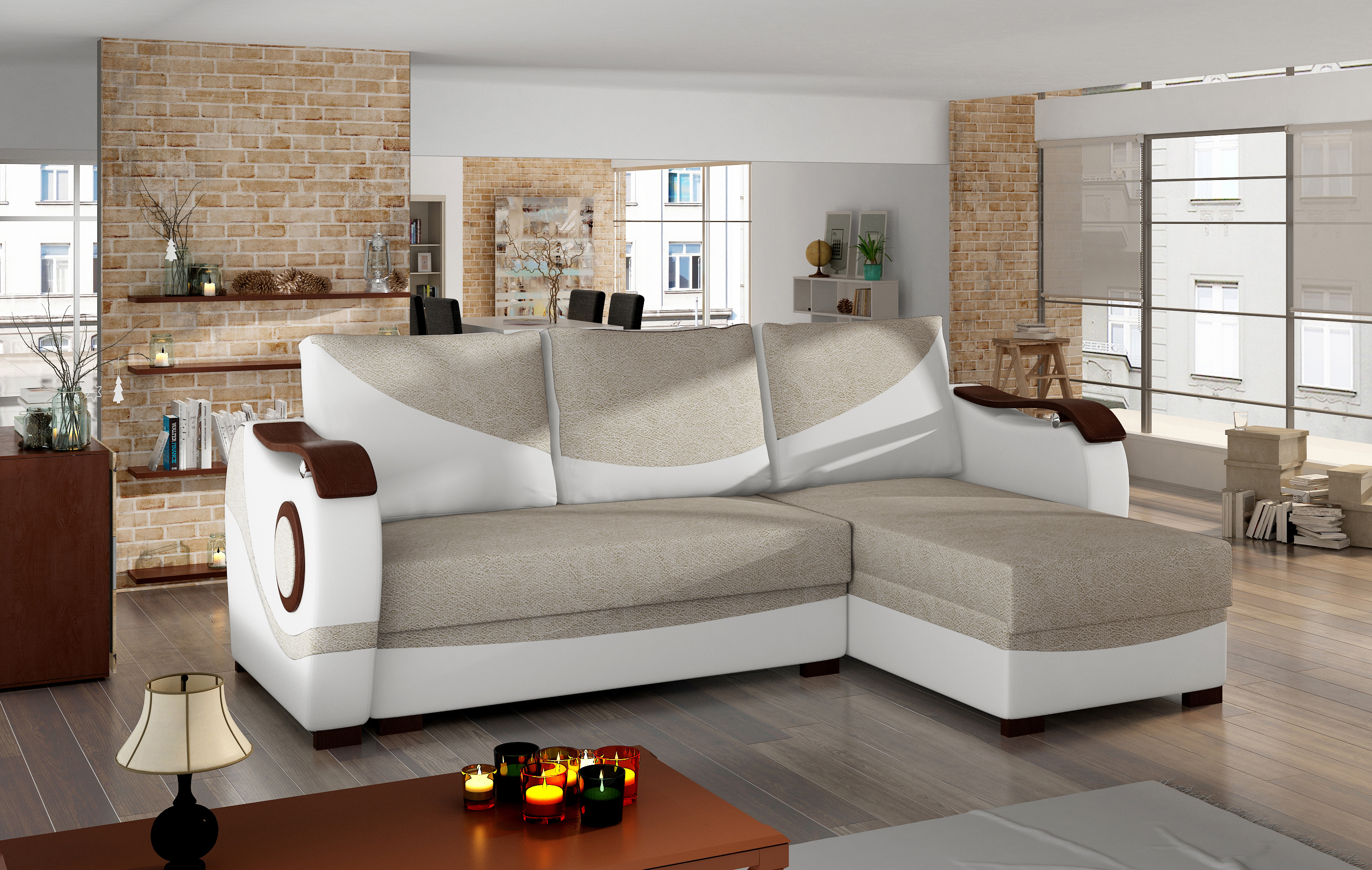 Rozkládací souprava Puerto v barevném provedení látka Dora 21/eko kůže Soft 17. Výplň sedáků je vyrobena z bonelu a T25 pěny. Rozkládem v podobě výsuvné spodní části a výklopného opěradla vznikne spací plocha 195x125 cm. Souprava má dva prostorné úložné prostory na ložní prádlo - jeden z nich se nachází v podnožce, zatímco druhý je k dispozici po nastavení nábytku do noční funkce. Doplňkové dekorace v podobě dřevěných prvků na područkách, bočnicích a nohách. Potahová látka jako na hlavní fotografii.