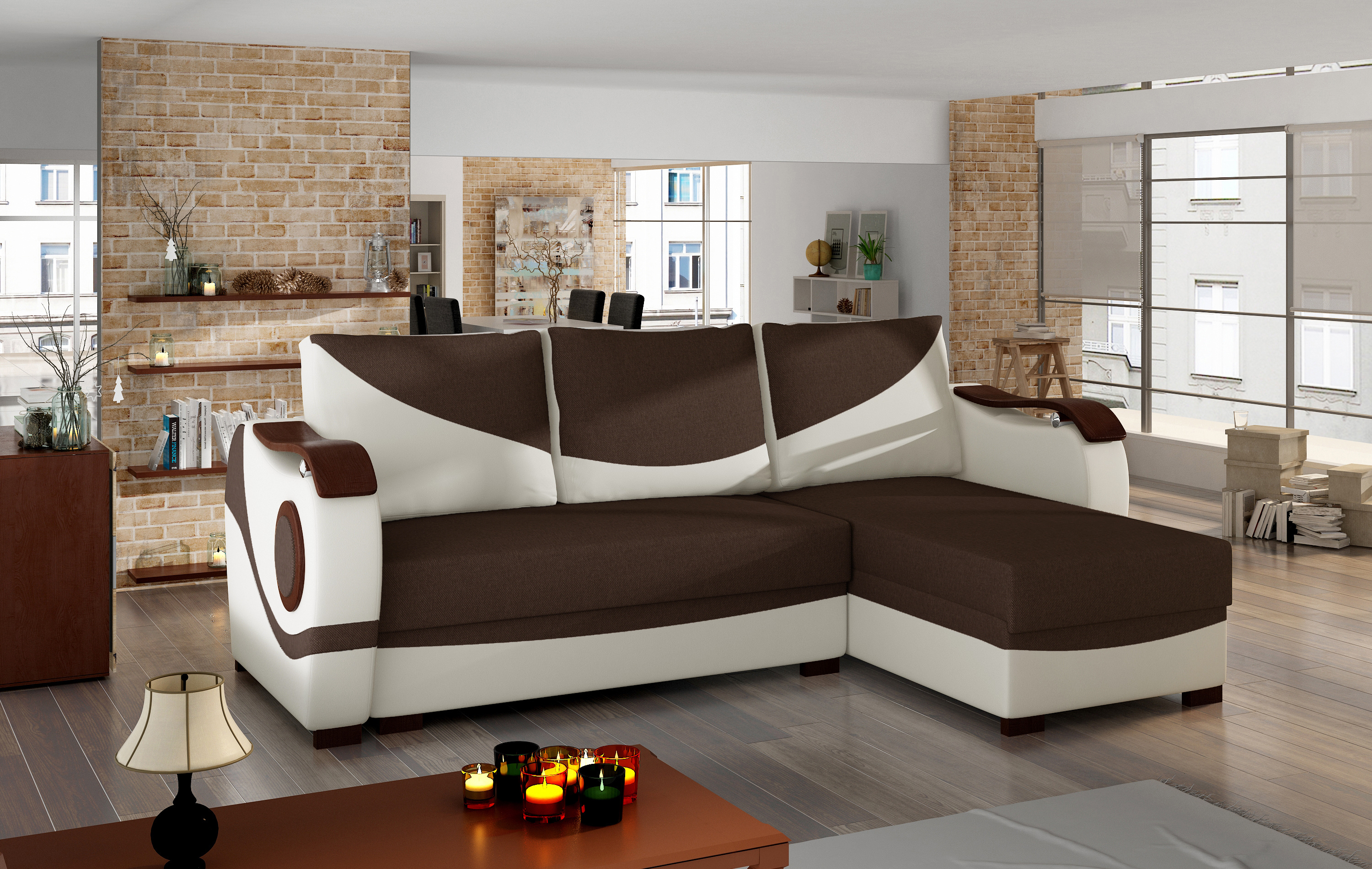 Rozkládací souprava Puerto v barevném provedení látka Sawana 26/eko kůže Soft 33. Výplň sedáků je vyrobena z bonelu a T25 pěny. Rozkládem v podobě výsuvné spodní části a výklopného opěradla vznikne spací plocha 195x125 cm. Souprava má dva prostorné úložné prostory na ložní prádlo - jeden z nich se nachází v podnožce, zatímco druhý je k dispozici po nastavení nábytku do noční funkce. Doplňkové dekorace v podobě dřevěných prvků na područkách, bočnicích a nohách. Potahová látka jako na hlavní fotografii.