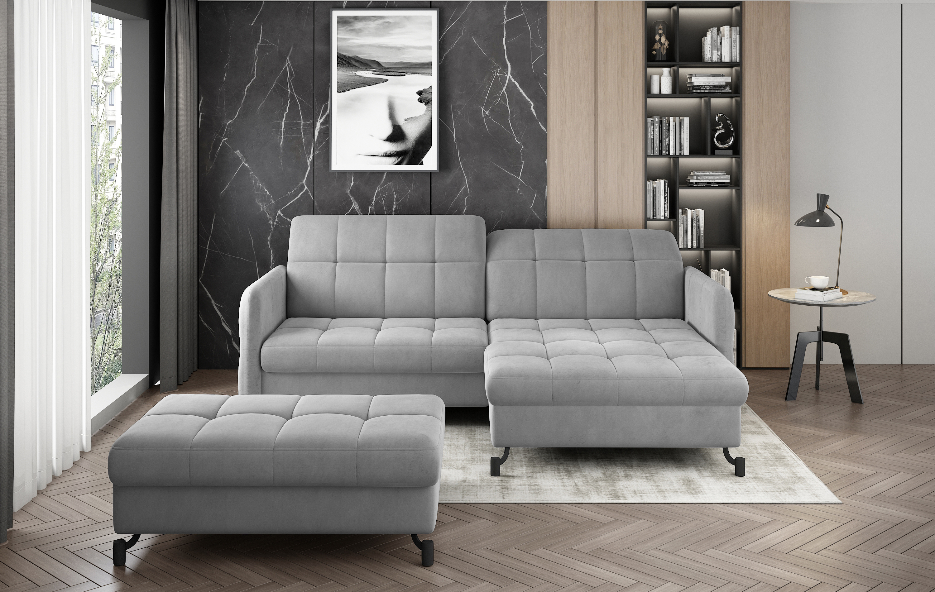 Sedací souprava s taburetem v dezénu Monolith 84 má sedák vyplněný HR pěnou a opěradlo pěnou T25. Potahová látka Monolith: příjemná látka s vysokou odolností, voděodolná, odolná proti vyblednutí a žmolkování, látka po přejetí rukou stínuje. Sedací souprava disponuje úložným prostorem a rozkladem vznikne spací plocha 110x200 cm. Předností jsou vyšší područky a polohovatelné opěrky hlavy. Nožky jsou chromované v černé barvě o výšce 13 cm.