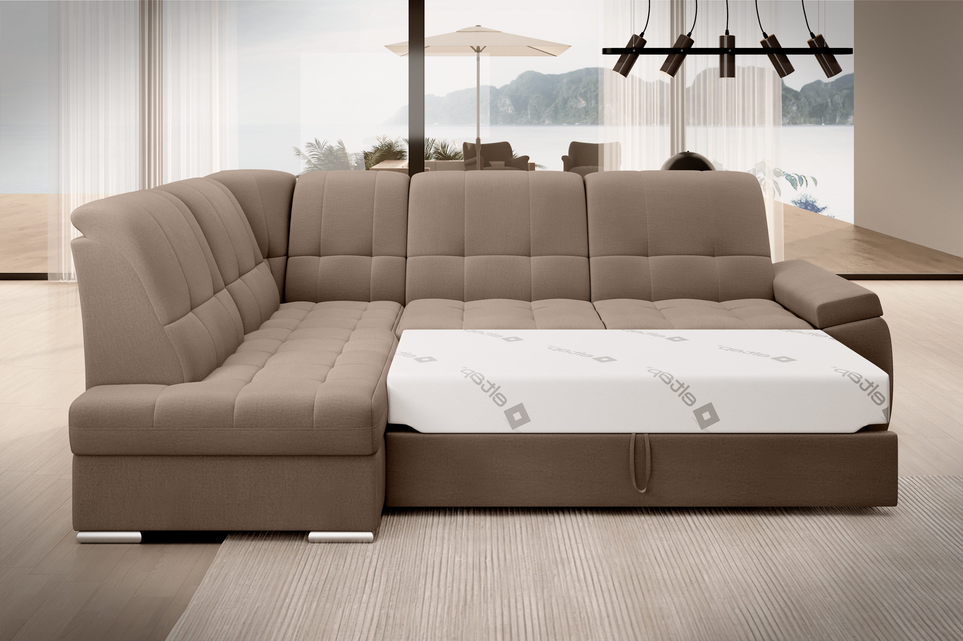 Sedací souprava Sado v provedení Nube 20 má rám z borovicového dřeva. Sedák má vyrobený z odolné vysoce flexibilní HR pěny T30. Rozkladem DL vznikne spací plocha 207x130 cm. Sedací souprava disponuje úložným prostorem a nastavitelným opěradlem. Nosnost pohovky 315 kg. Nohy jsou dřevěné stříbrné o výšce 4 cm. Provedení rohu levé. Zboží je částečně smontováno.