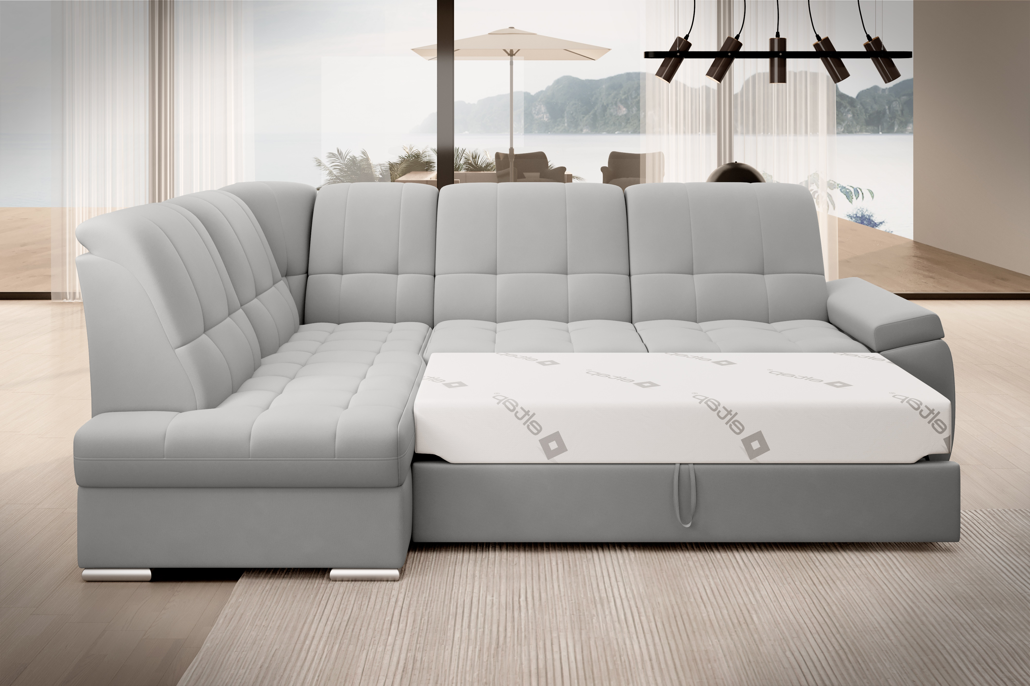 Sedací souprava Sado v provedení Sola 4 má rám z borovicového dřeva. Sedák má vyrobený z odolné vysoce flexibilní HR pěny T30. Rozkladem DL vznikne spací plocha 207x130 cm. Sedací souprava disponuje úložným prostorem a nastavitelným opěradlem. Nosnost pohovky 315 kg. Nohy jsou dřevěné stříbrné o výšce 4 cm. Provedení rohu levé. Zboží je částečně smontováno.