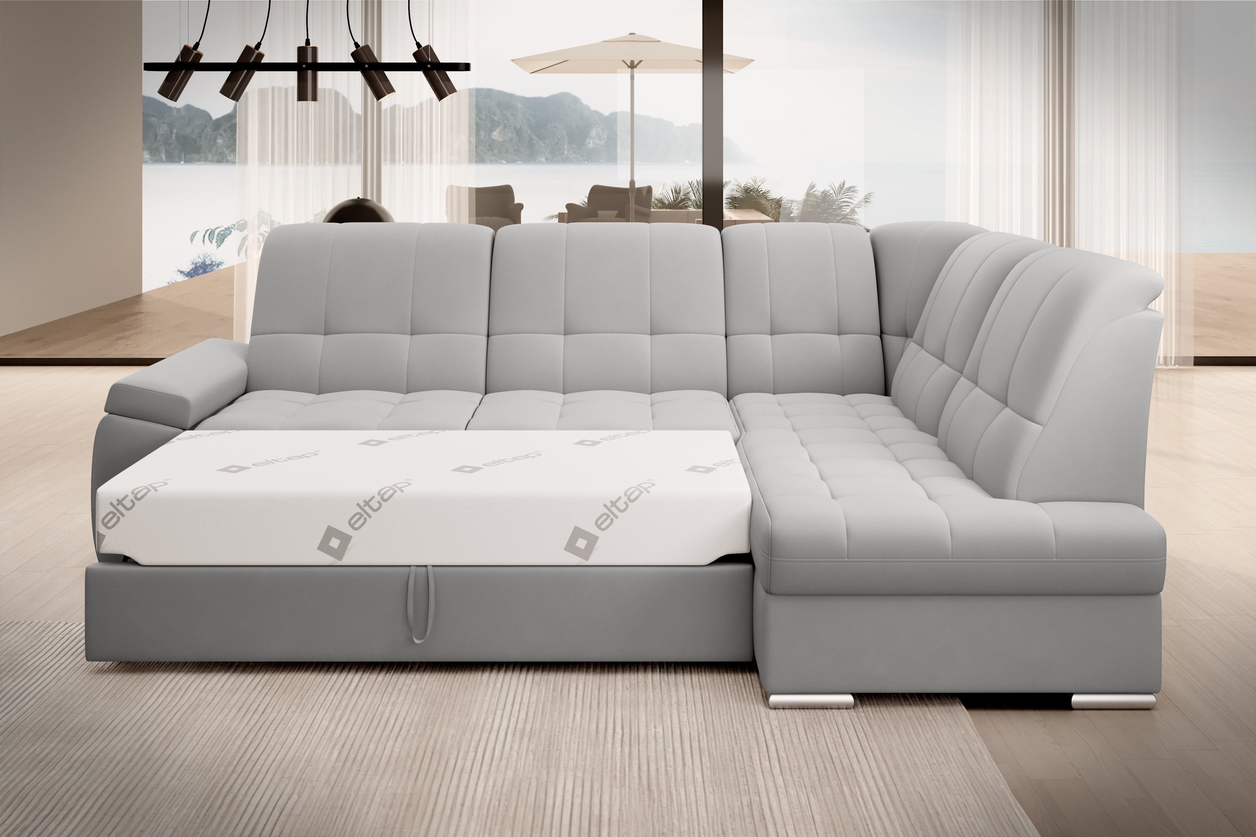Sedací souprava Sado v provedení Sola 4 má rám z borovicového dřeva. Sedák má vyrobený z odolné vysoce flexibilní HR pěny T30. Rozkladem DL vznikne spací plocha 207x130 cm. Sedací souprava disponuje úložným prostorem a nastavitelným opěradlem. Nosnost pohovky 315 kg. Nohy jsou dřevěné stříbrné o výšce 4 cm. Provedení rohu pravé. Zboží je částečně smontováno.