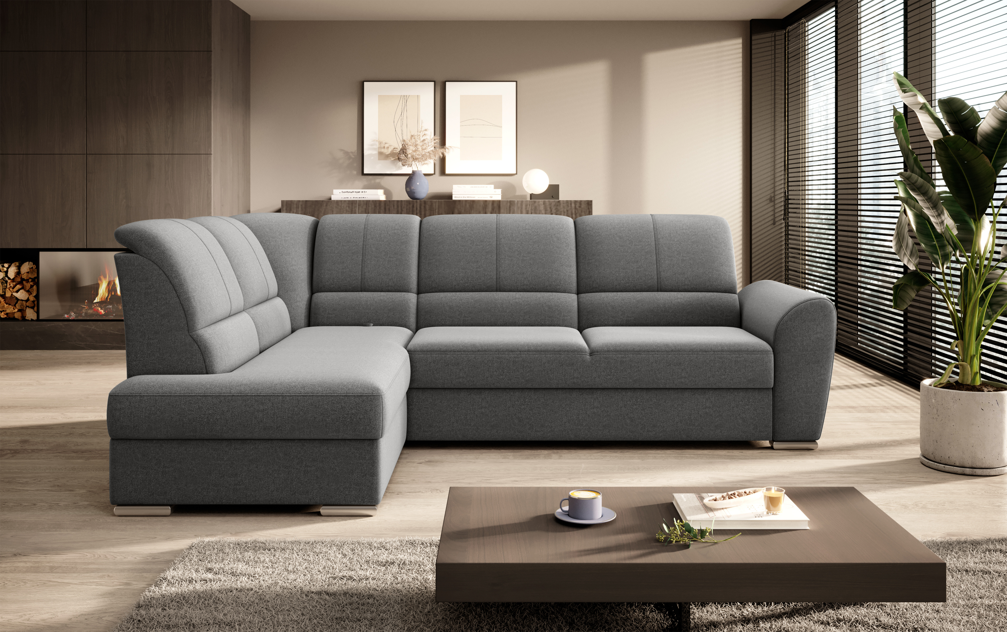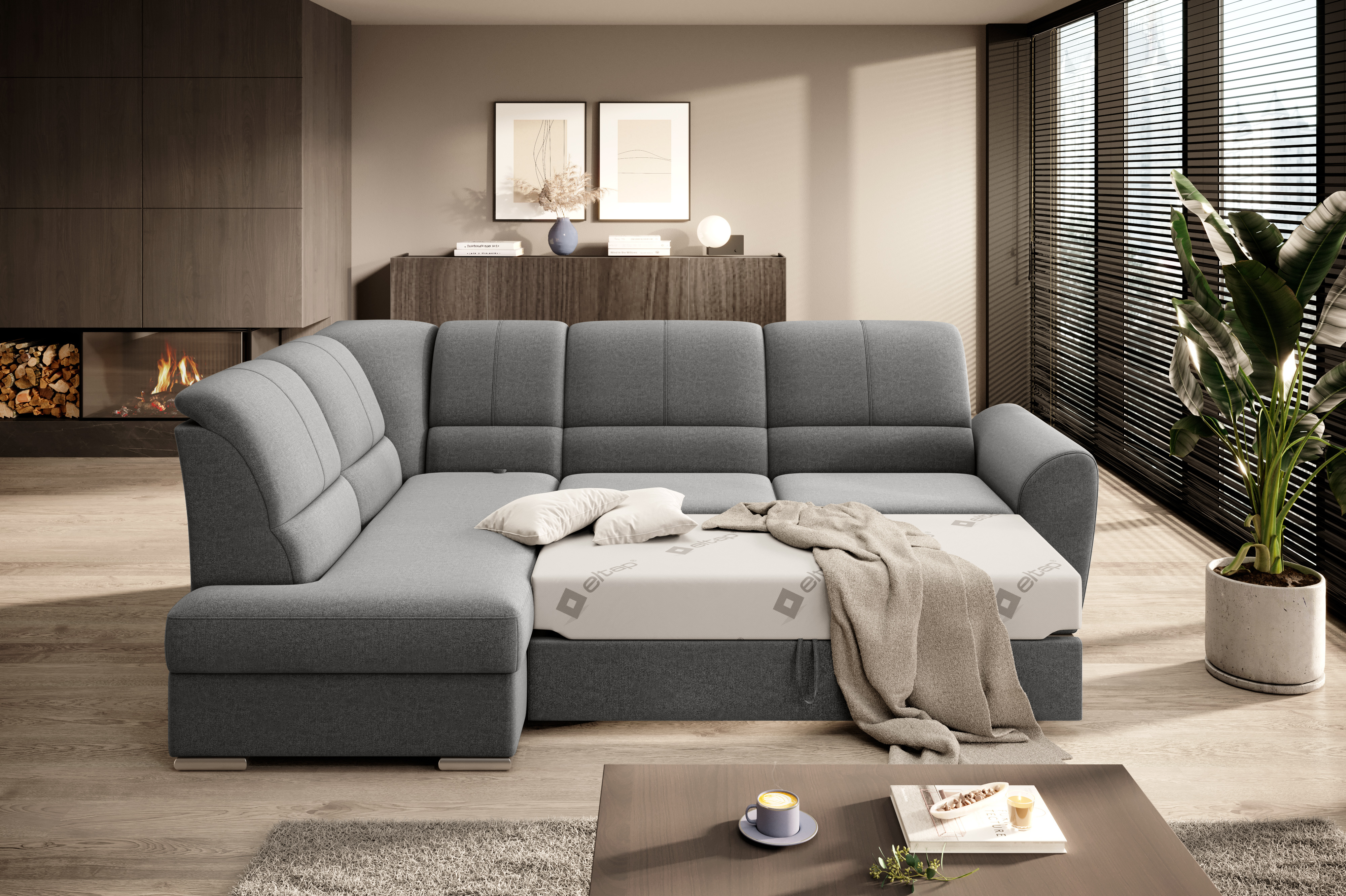 Sedací souprava Siber v provedení Gojo 5 má rám z borovicového dřeva. Sedák má vyrobený z odolné vysoce flexibilní HR pěny T3030. Rozkladem DL vznikne spací plocha 205x125 cm. Sedací souprava s vysokými, tvarovanými, nastavitelnými opěradly zdobenými stylovým prošíváním disponuje úložným prostorem. Nosnost pohovky 315 kg. Nohy jsou dřevěné stříbrné o výšce 5 cm. Provedení rohu levé. Zboží je částečně smontováno.