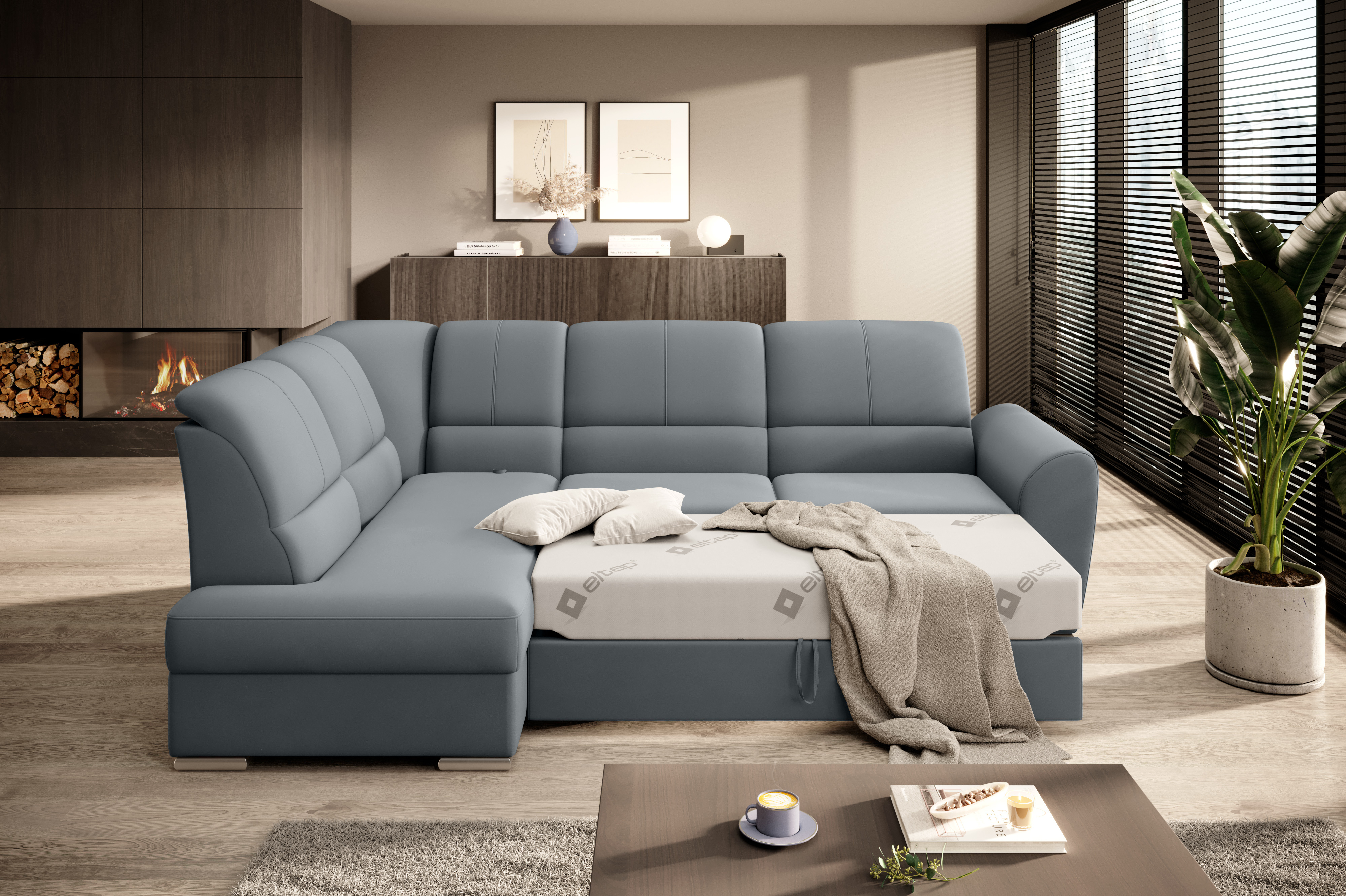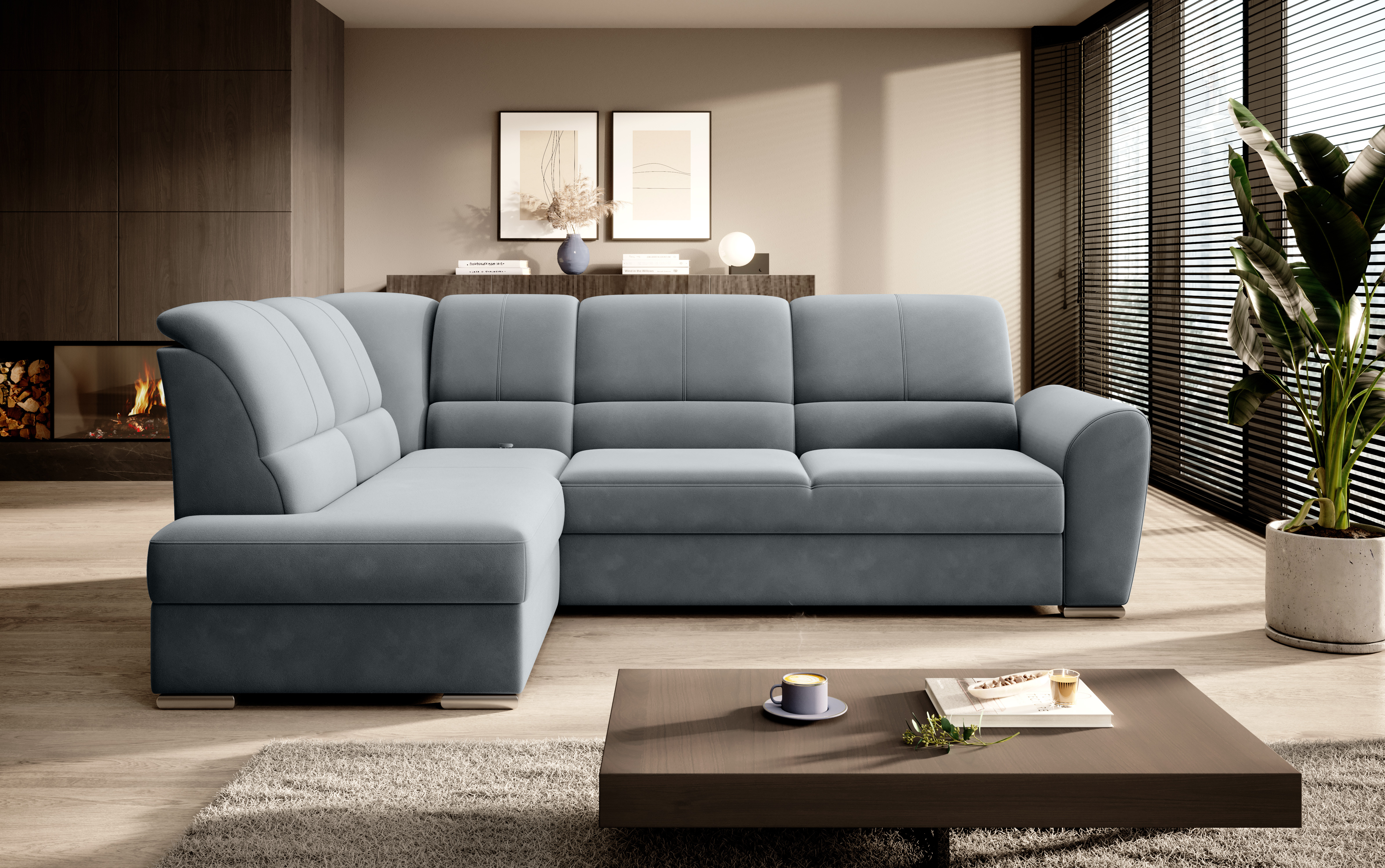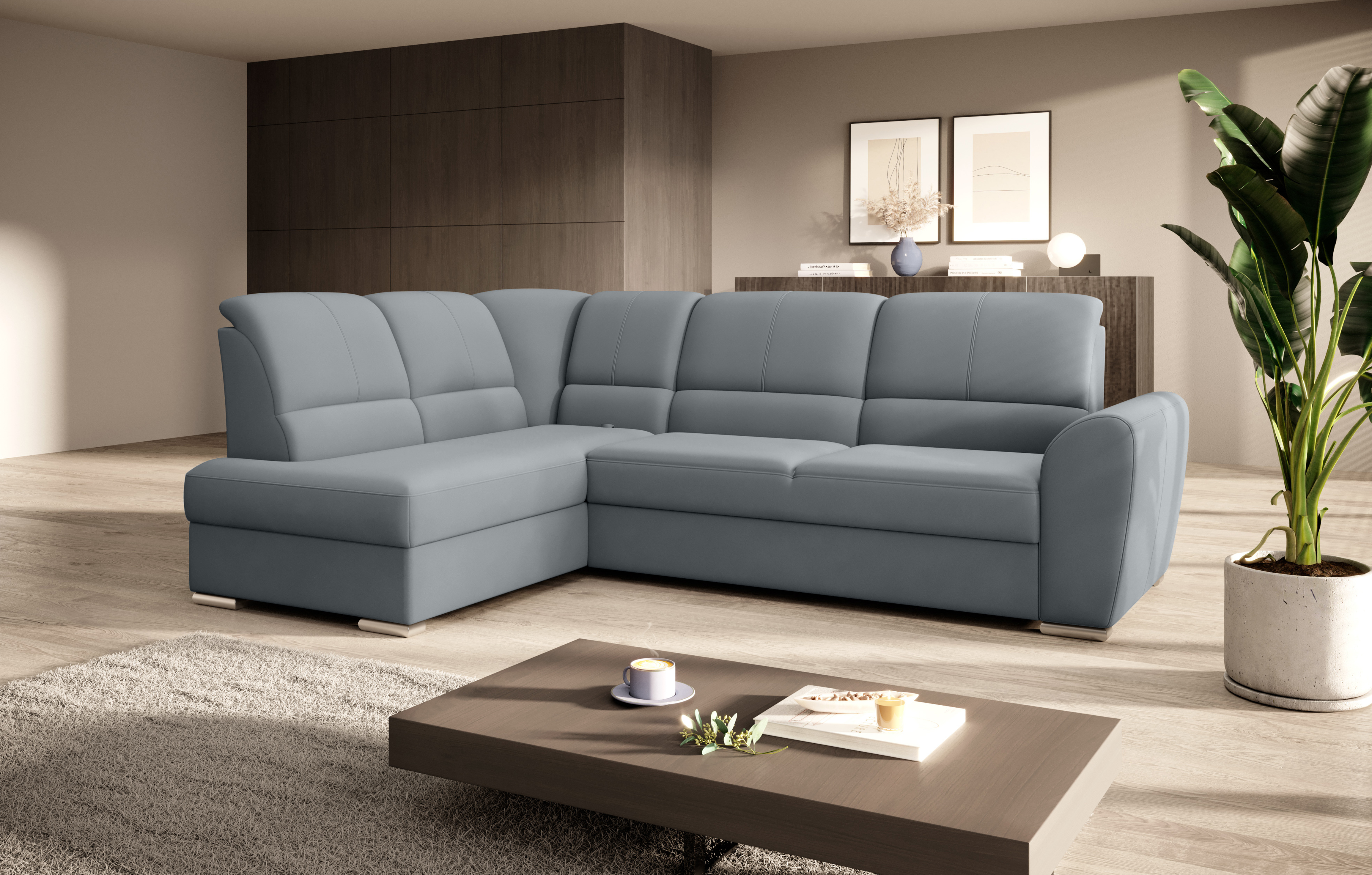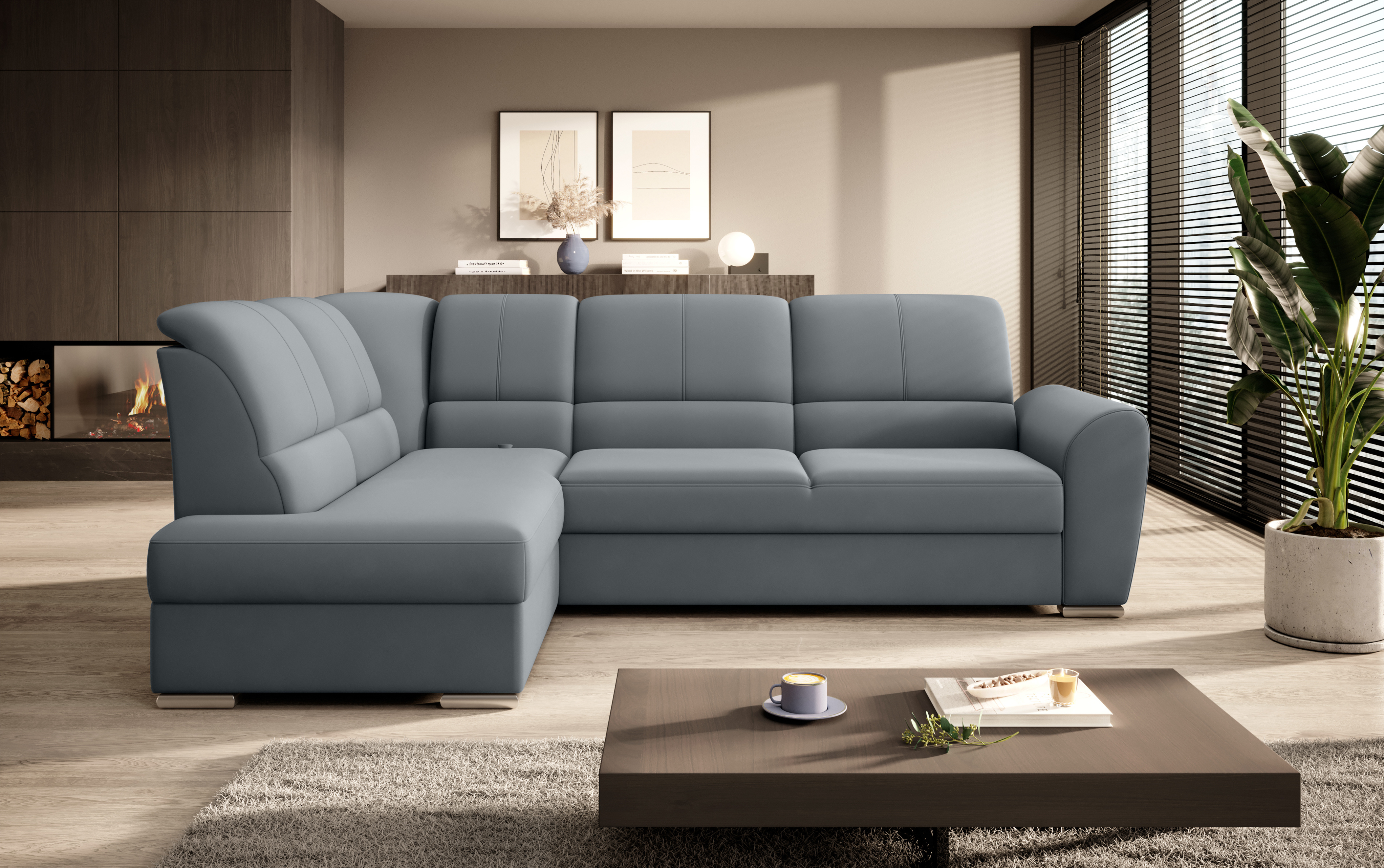 Sedací souprava Siber v provedení Velvetmat 4 má rám z borovicového dřeva. Sedák má vyrobený z odolné vysoce flexibilní HR pěny T3030. Rozkladem DL vznikne spací plocha 205x125 cm. Sedací souprava s vysokými, tvarovanými, nastavitelnými opěradly zdobenými stylovým prošíváním disponuje úložným prostorem. Nosnost pohovky 315 kg. Nohy jsou dřevěné stříbrné o výšce 5 cm. Provedení rohu levé. Zboží je částečně smontováno.