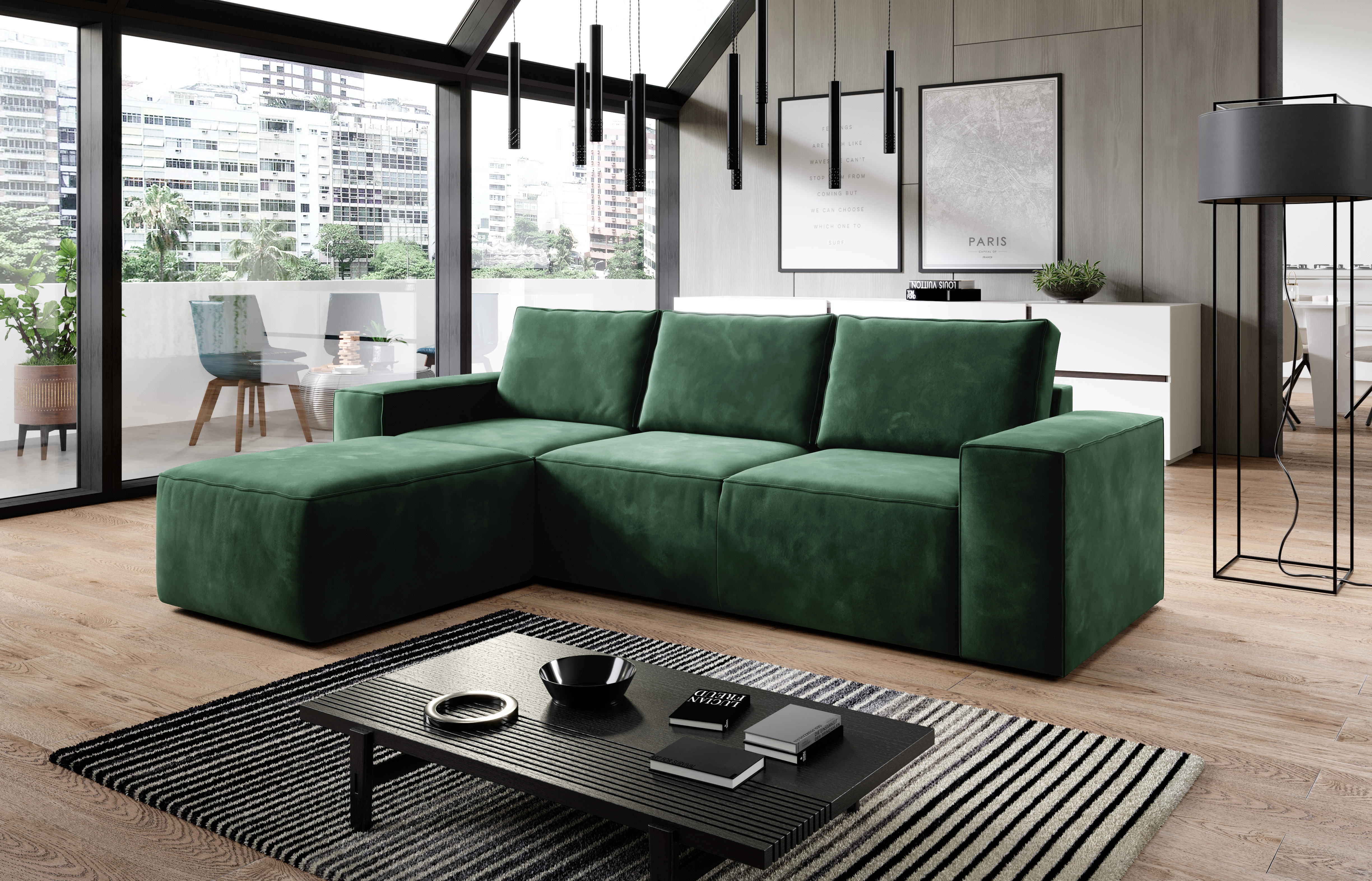 Sedací souprava Silla v provedení Loco 35 - látka příjemná na dotek, připomíná samet, nevybledne, stínový vzhled, mírný lesk. Souprava má sedáky vyplněné HR pěnou a zádové polštáře pěnou T25. Rozkladem vznikne ložná plocha 243x128 cm. Sedací souprava je  vybavena úložným prostorem o rozměrech: 158 x 54 x 19 cm.