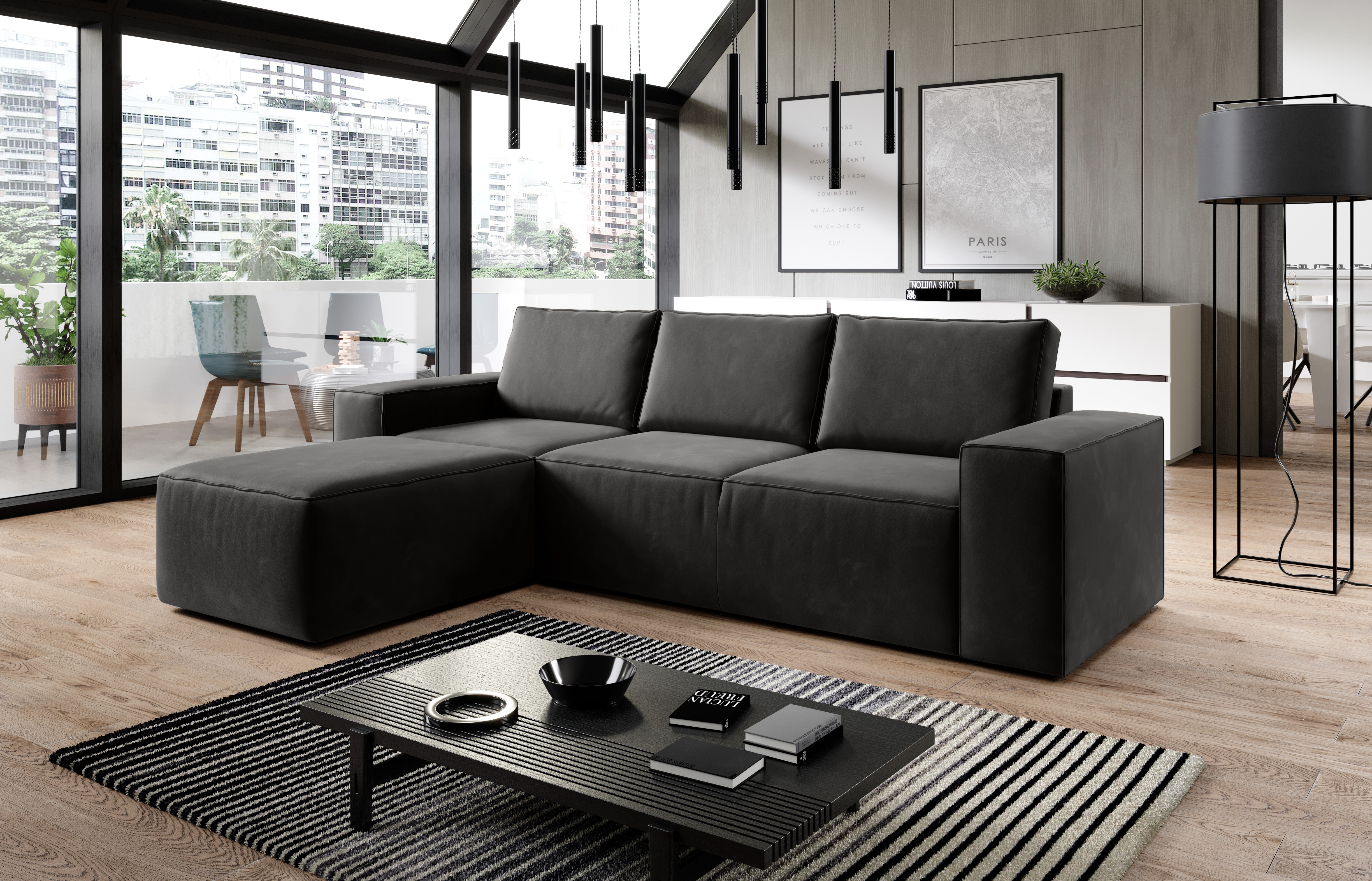 Sedací souprava Silla v provedení Lukso 10 - pevná látka, snadná údržba, nevybledne, bez stínového efektu po přejetí rukou. Souprava má sedáky vyplněné HR pěnou a zádové polštáře pěnou T25. Rozkladem vznikne ložná plocha 243x128 cm. Sedací souprava je  vybavena úložným prostorem o rozměrech: 158 x 54 x 19 cm.