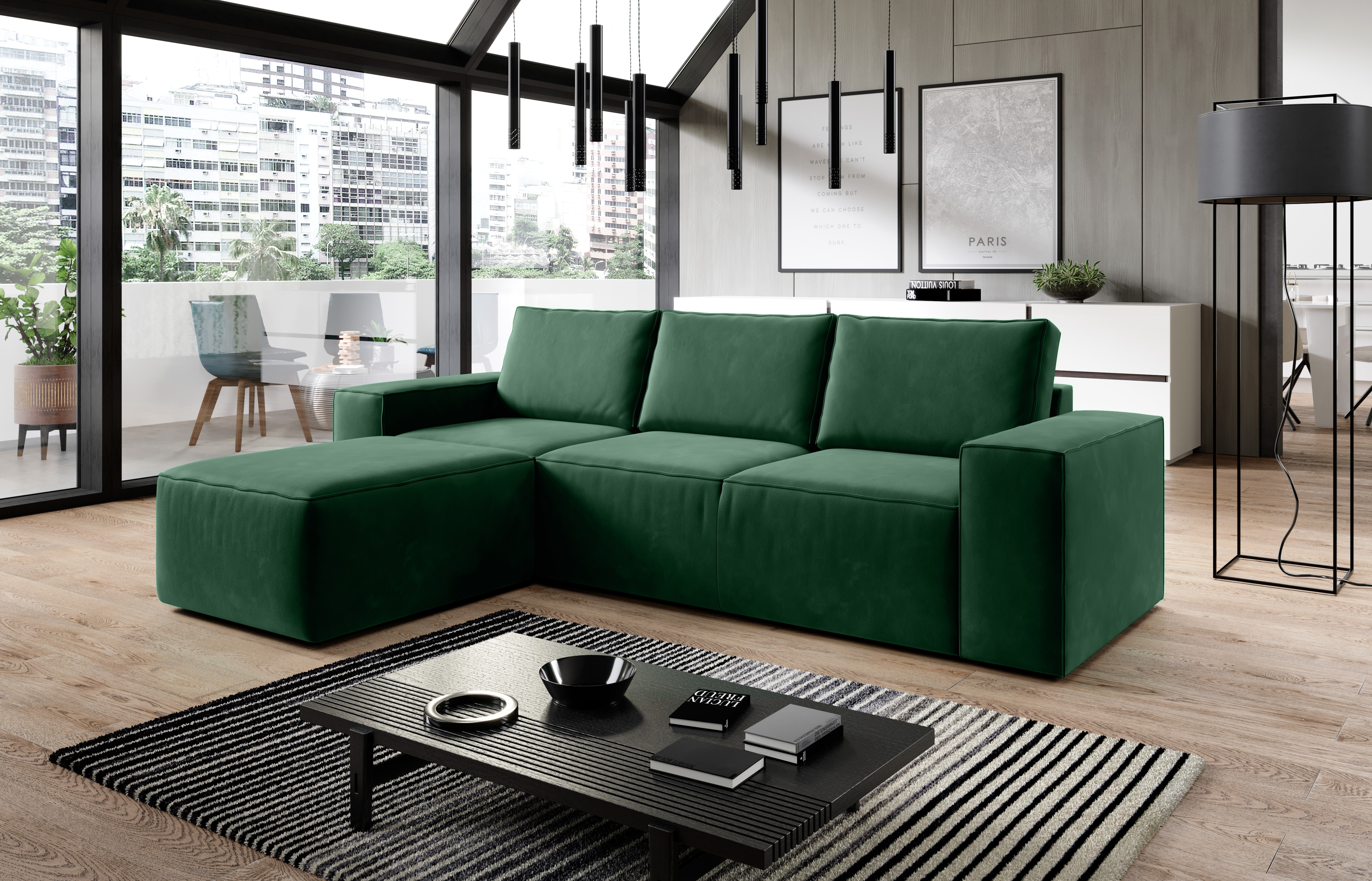 Sedací souprava Silla v provedení Lukso 35 - pevná látka, snadná údržba, nevybledne, bez stínového efektu po přejetí rukou. Souprava má sedáky vyplněné HR pěnou a zádové polštáře pěnou T25. Rozkladem vznikne ložná plocha 243x128 cm. Sedací souprava je  vybavena úložným prostorem o rozměrech: 158 x 54 x 19 cm.