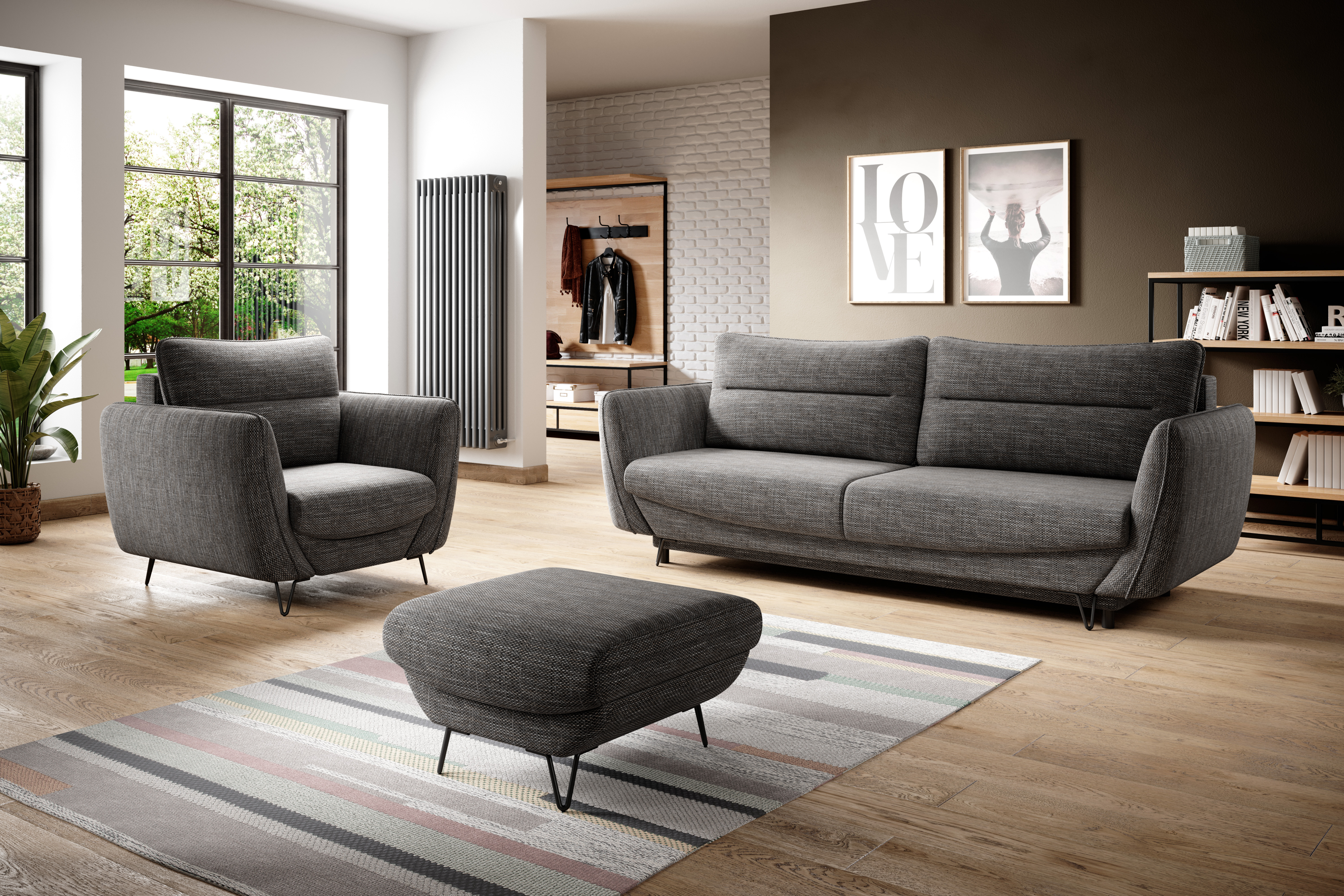 Sedací souprava v dezénu Marte 130 se skládá z pohovky, křesla a taburetu. Sedáky jsou vyrobeny z vysoce elastické HR pěny a opěradlo pohovky je vyrobeno z pěny T25. Pohovka se pomocí DL mechanismu dá rozložit na spací plochu 200x145 cm a disponuje úložným prostorem. Nohy pohovky, taburetu a křesla jsou z černé oceli s výškou až 13 centimetrů. Každý prvek setu lze zakoupit i samostatně.