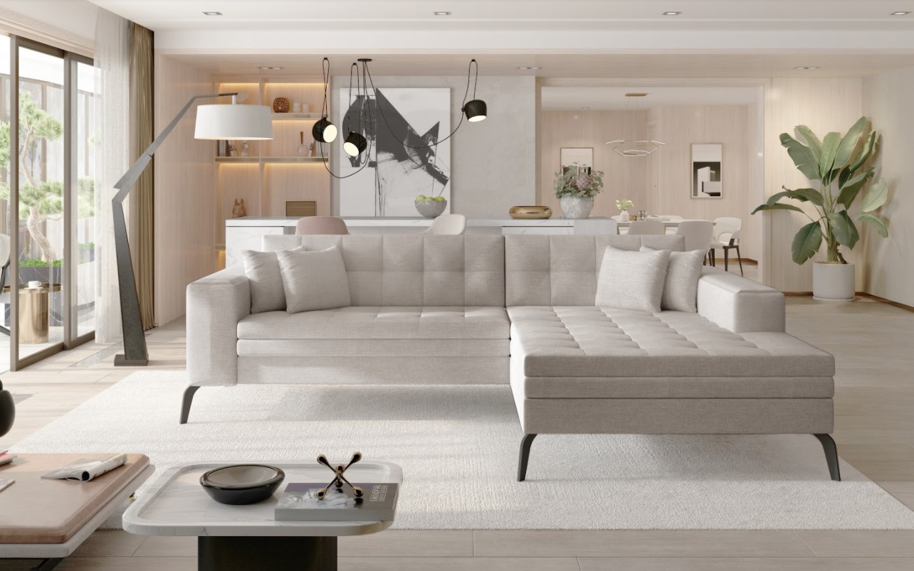 Moderní rohová sedací souprava Solange je elegantní a pohodlný kus nábytku v dezenu Cover 02 (krémová). Hluboká sedadla s dlouhým otomanem, vyplněná vlnovou pružinou a pěnou T30 umožňují správnou oporu těla a jsou vysoce odolná proti deformaci. Mírně šikmé opěradlo navíc udržuje záda ve zdravé poloze a výrazně ovlivňuje použití tohoto modelu. Solange je model na dlouhých, štíhlých, černých nohách vysoké 13 cm, které udržují roh stabilní a dodávají dílu lehký vzhled. Nemá úložný prostor. Potahová látka jako na hlavní fotografii.