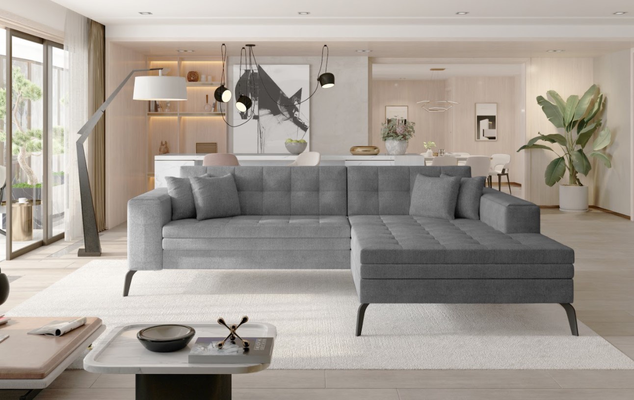 Moderní rohová sedací souprava Solange je elegantní a pohodlný kus nábytku v dezenu Omega 13 (šedá). Hluboká sedadla s dlouhým otomanem, vyplněná vlnovou pružinou a pěnou T30 umožňují správnou oporu těla a jsou vysoce odolná proti deformaci. Mírně šikmé opěradlo navíc udržuje záda ve zdravé poloze a výrazně ovlivňuje použití tohoto modelu. Solange je model na dlouhých, štíhlých, černých nohách vysoké 13 cm, které udržují roh stabilní a dodávají dílu lehký vzhled. Nemá úložný prostor.  Potahová látka jako na hlavní fotografii.