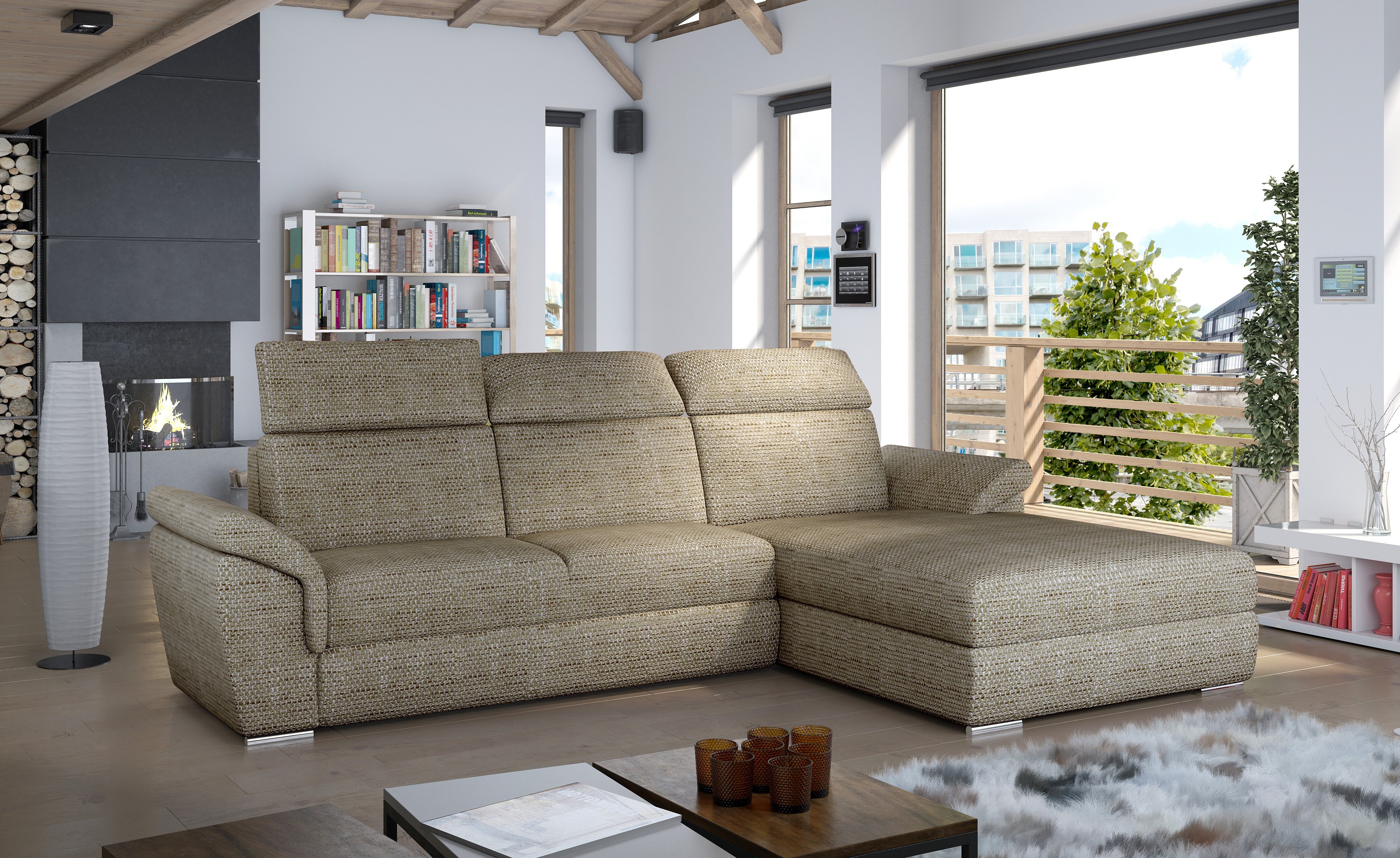 Rozkládací souprava s úložným prostorem v barevném provedení světle hnědá. Spací plocha 127x210 cm. Výplň sedáků je vyrobena z vlnité pružiny a pěny T30 - tato kombinace zajišťuje měkkost, pružnost a dostatečnou oporu během odpočinku. Souprava je vybavena správně profilovaným opěradlem obohaceným o pohyblivé opěrky hlavy, které zvyšují komfort používání, stejně jako loketní opěrky umístěné v jemném úhlu. Přesné šití a čalouněná tkanina nejvyšší kvality činí nábytek velmi elegantním. Potahová látka jako na hlavní fotografii, provedení pravé. Možnost výběru pravého/levého provedení.