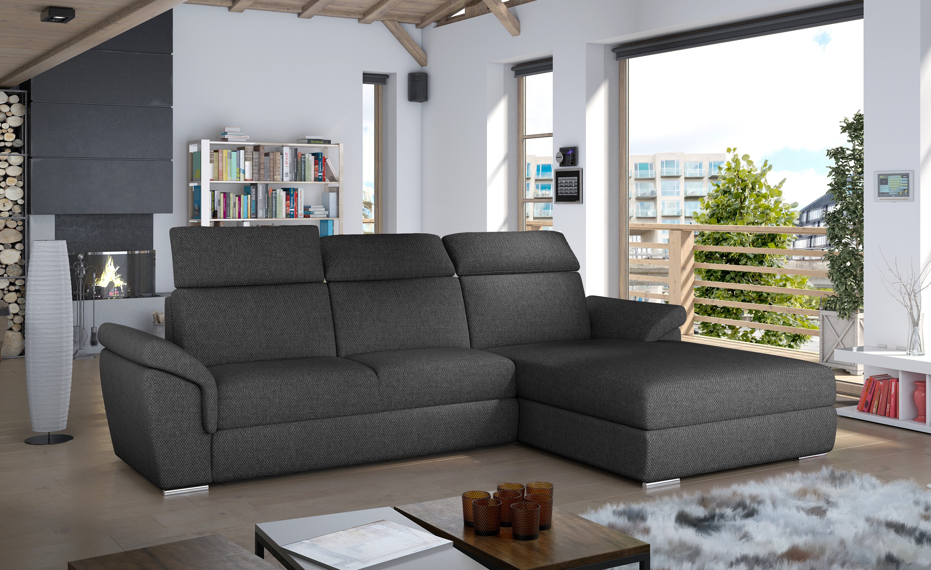 Rozkládací souprava s úložným prostorem v barevném provedení šedá. Spací plocha 127x210 cm. Výplň sedáků je vyrobena z vlnité pružiny a pěny T30 - tato kombinace zajišťuje měkkost, pružnost a dostatečnou oporu během odpočinku. Souprava je vybavena správně profilovaným opěradlem obohaceným o pohyblivé opěrky hlavy, které zvyšují komfort používání, stejně jako loketní opěrky umístěné v jemném úhlu. Přesné šití a čalouněná tkanina nejvyšší kvality činí nábytek velmi elegantním. Potahová látka jako na hlavní fotografii, provedení pravé. Možnost výběru pravého/levého provedení.
