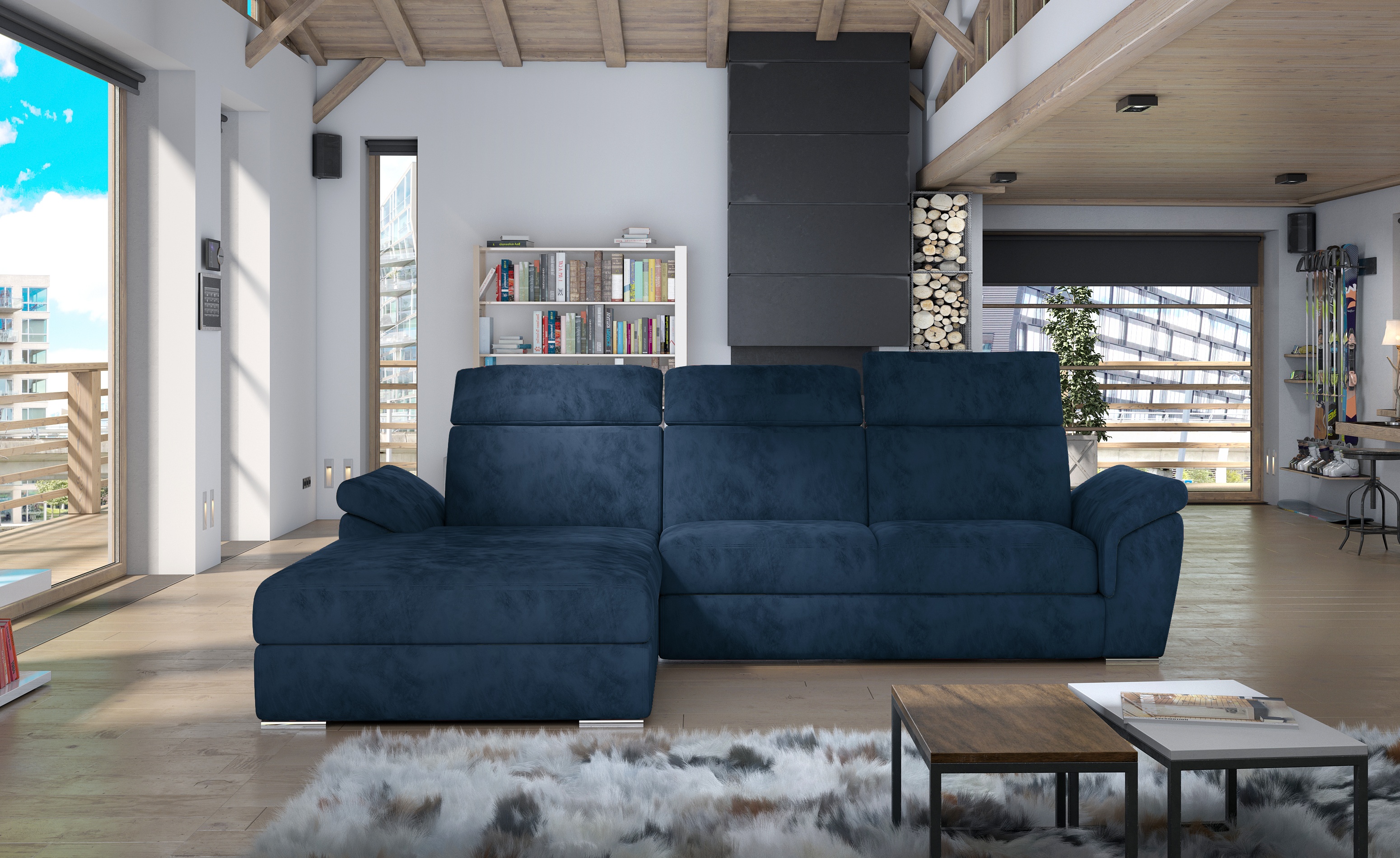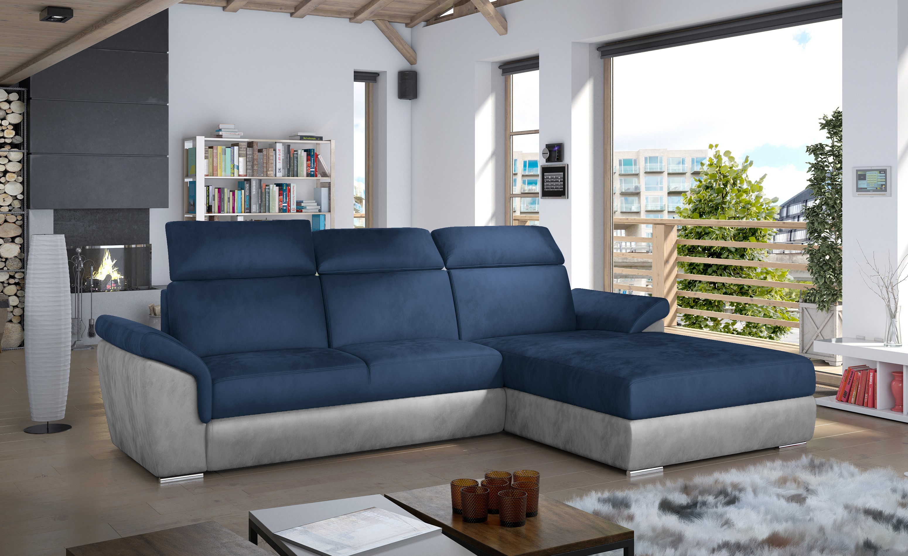 Rozkládací souprava s úložným prostorem v barevném provedení modrá/šedá. Spací plocha 127x210 cm. Výplň sedáků je vyrobena z vlnité pružiny a pěny T30 - tato kombinace zajišťuje měkkost, pružnost a dostatečnou oporu během odpočinku. Souprava je vybavena správně profilovaným opěradlem obohaceným o pohyblivé opěrky hlavy, které zvyšují komfort používání, stejně jako loketní opěrky umístěné v jemném úhlu. Přesné šití a čalouněná tkanina nejvyšší kvality činí nábytek velmi elegantním. Potahová látka jako na hlavní fotografii, provedení pravé. Možnost výběru pravého/levého provedení.