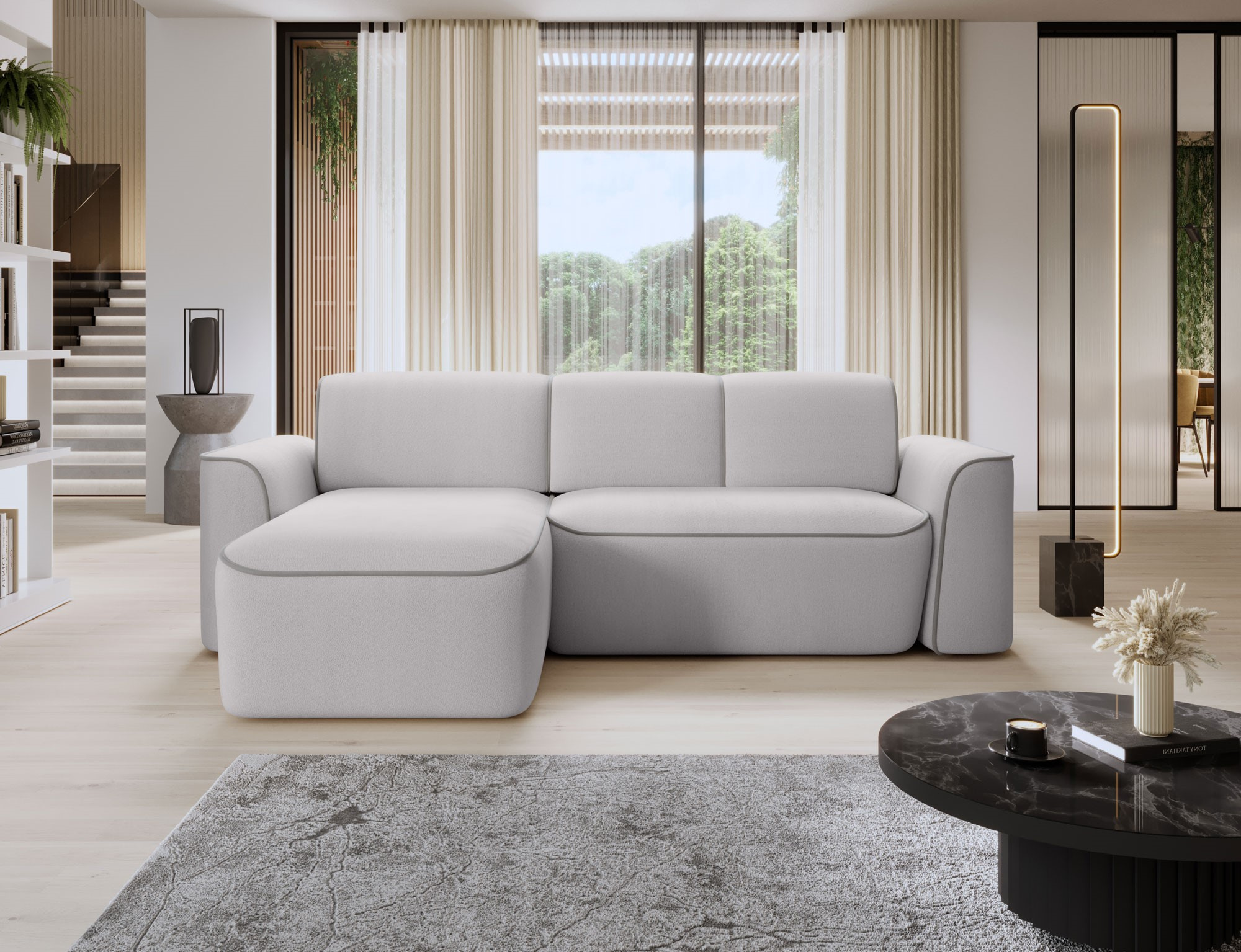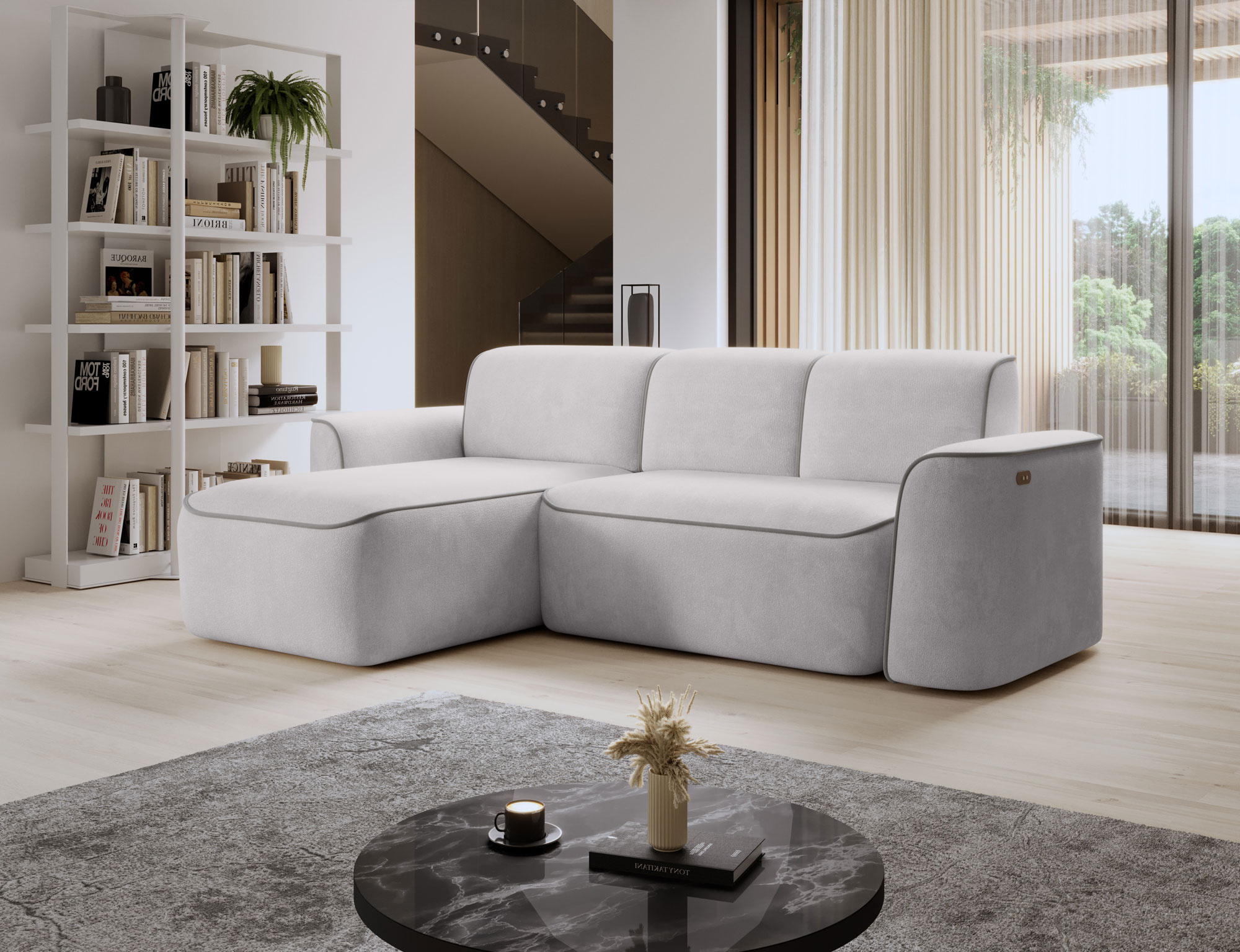 Sedací souprava Ume v provedení hlavní barva Amore 03/ obšití Paros 05 má rám z borovicového dřeva. Sedák má vyrobený z odolné vysoce flexibilní HR pěny T3030. Opěradlo je vyrobeno z pěny T2540 + T2315. Je vybavena elektricky výsuvným sedákem. Nosnost pohovky 270kg. Nohy jsou plastové černé o výšce 2,5 cm. Provedení rohu levé. Zboží je částečně smontováno.