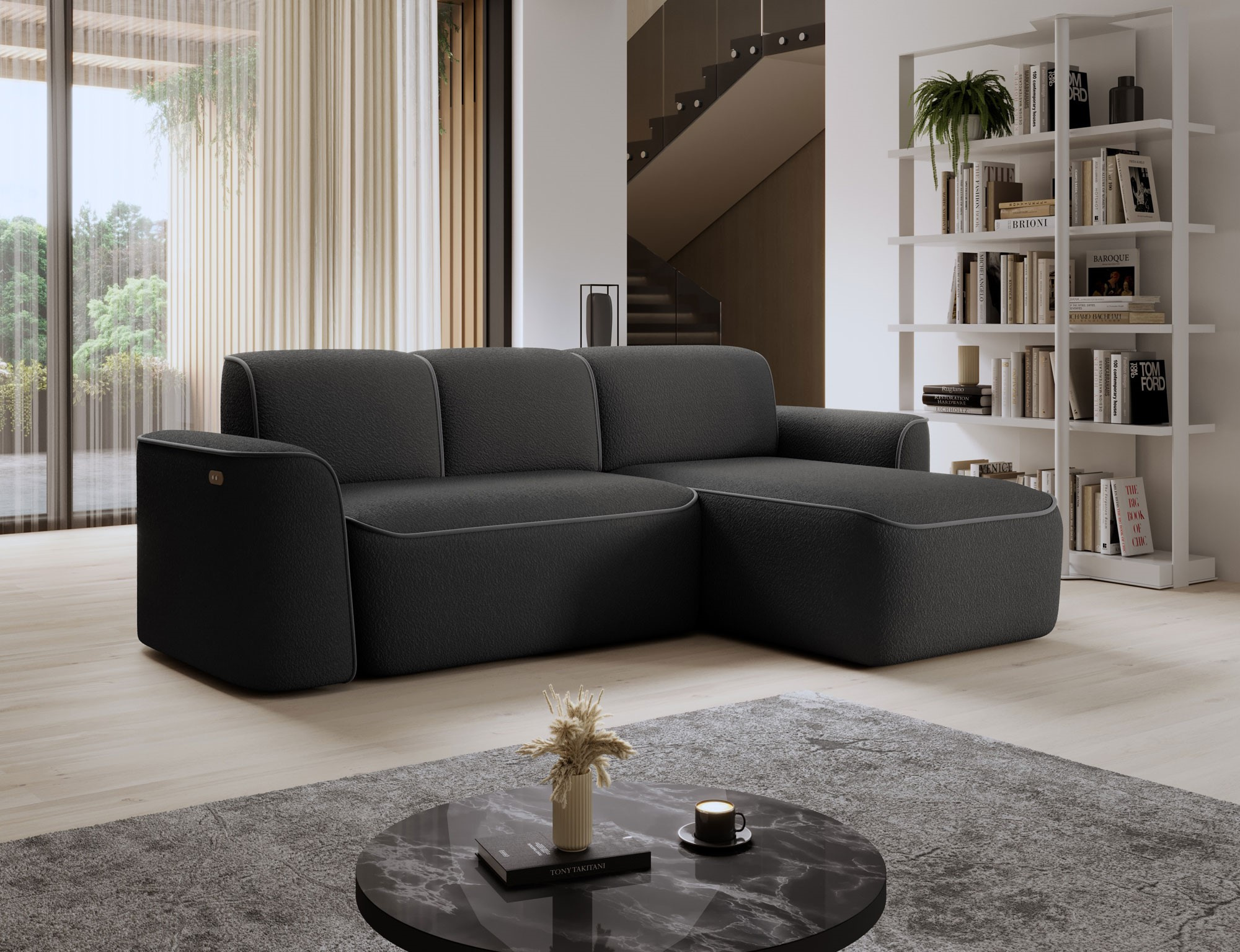Sedací souprava Ume v provedení hlavní barva Royal 05/ obšití Velvetmat 4 má rám z borovicového dřeva. Sedák má vyrobený z odolné vysoce flexibilní HR pěny T3030. Opěradlo je vyrobeno z pěny T2540 + T2315. Je vybavena elektricky výsuvným sedákem. Nosnost pohovky 270kg. Nohy jsou plastové černé o výšce 2,5 cm. Provedení rohu pravé. Zboží je částečně smontováno.