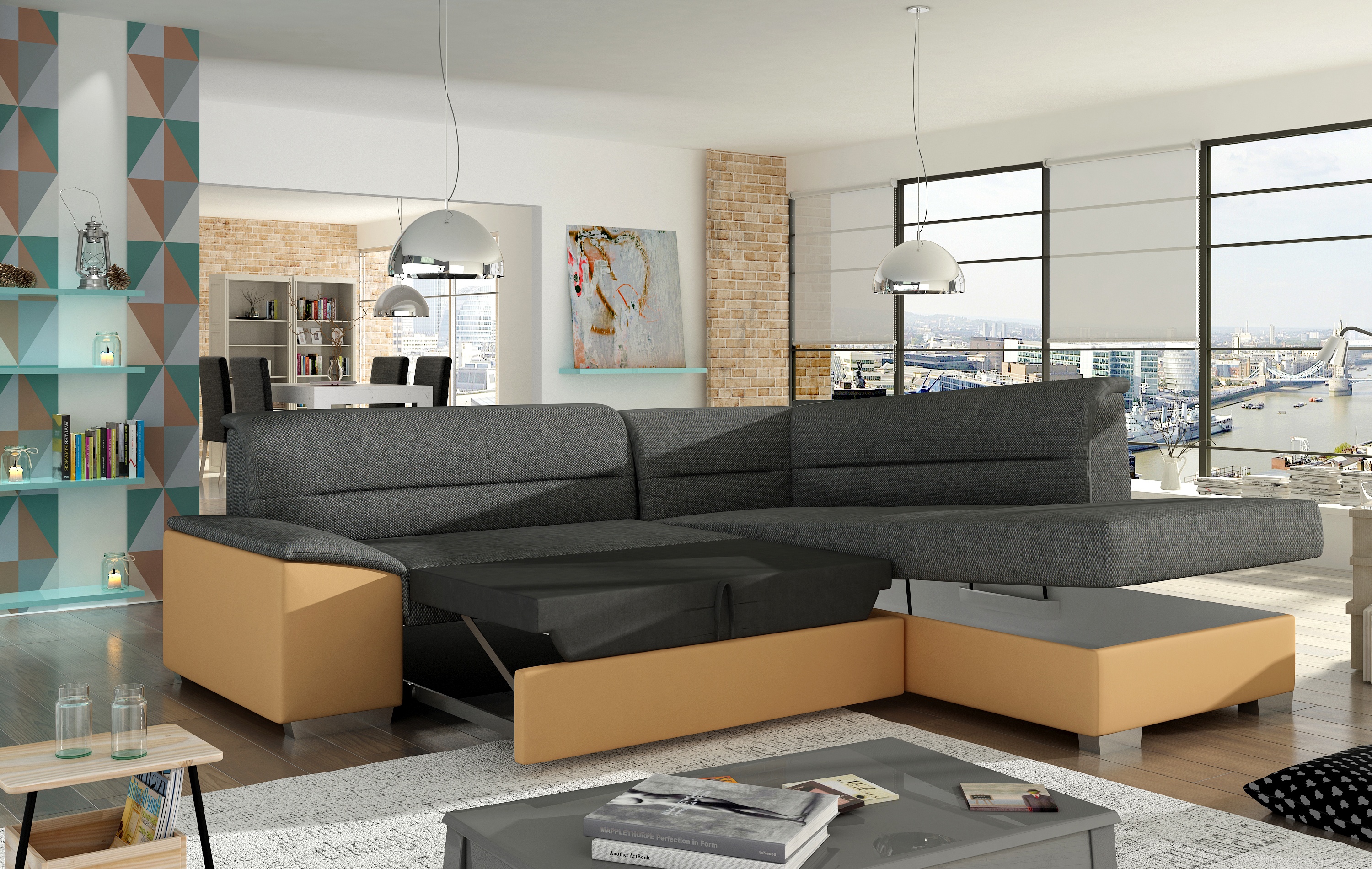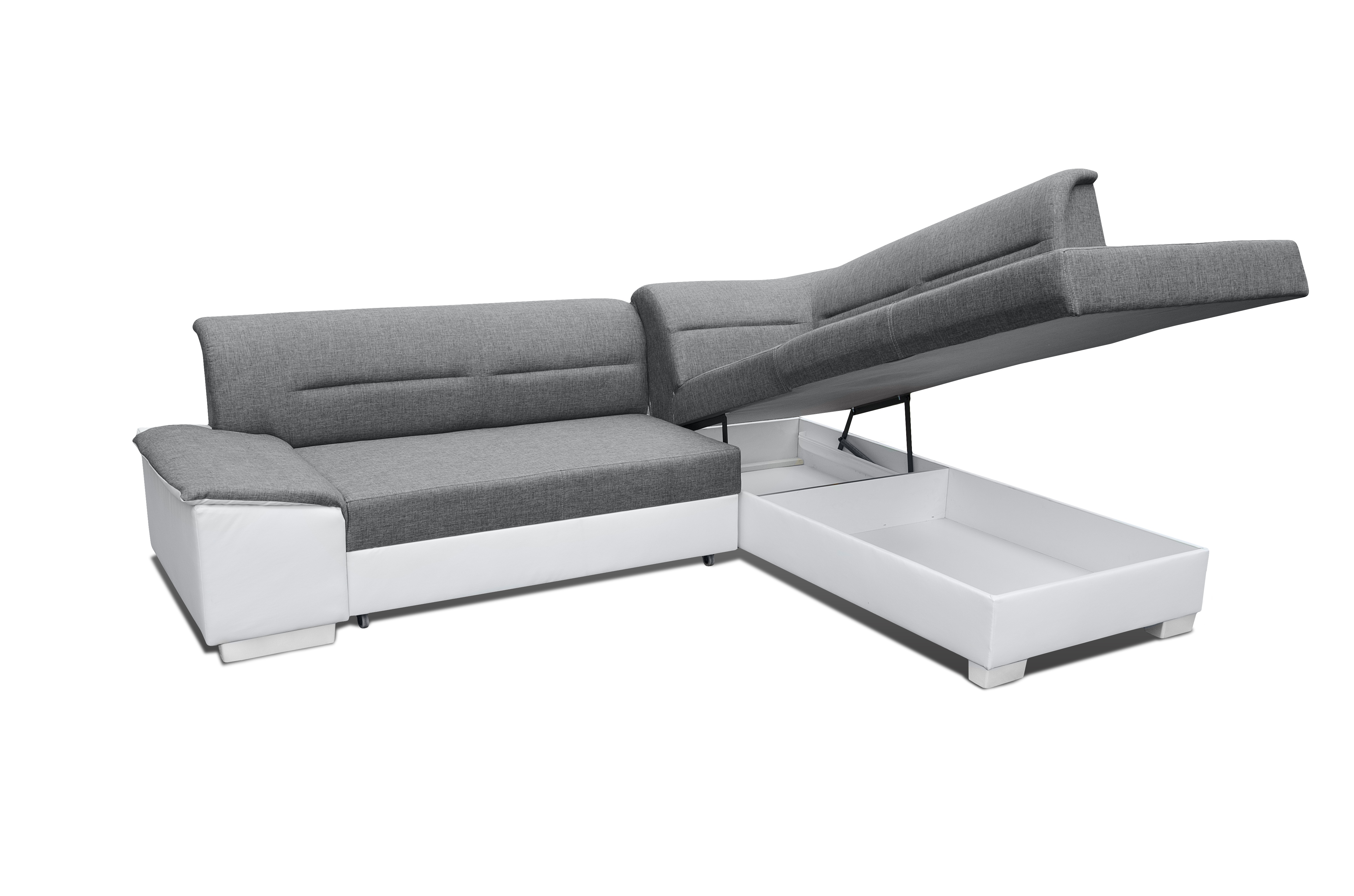 Elegantní rohová sedací souprava s funkcí rozkladu a úložným prostorem je vhodná na občasné přespání. Sedáky jsou plněny vlnitou pružinou a kvalitní PUR pěnou. Tato sedací souprava je vhodná do prostoru. Sedací soupravu lze vyrobit v pravém či levém provedení. Nožky jsou v barvě lesklý chrom. Potahová látka jako na hlavní fotografii, provedení pravé.