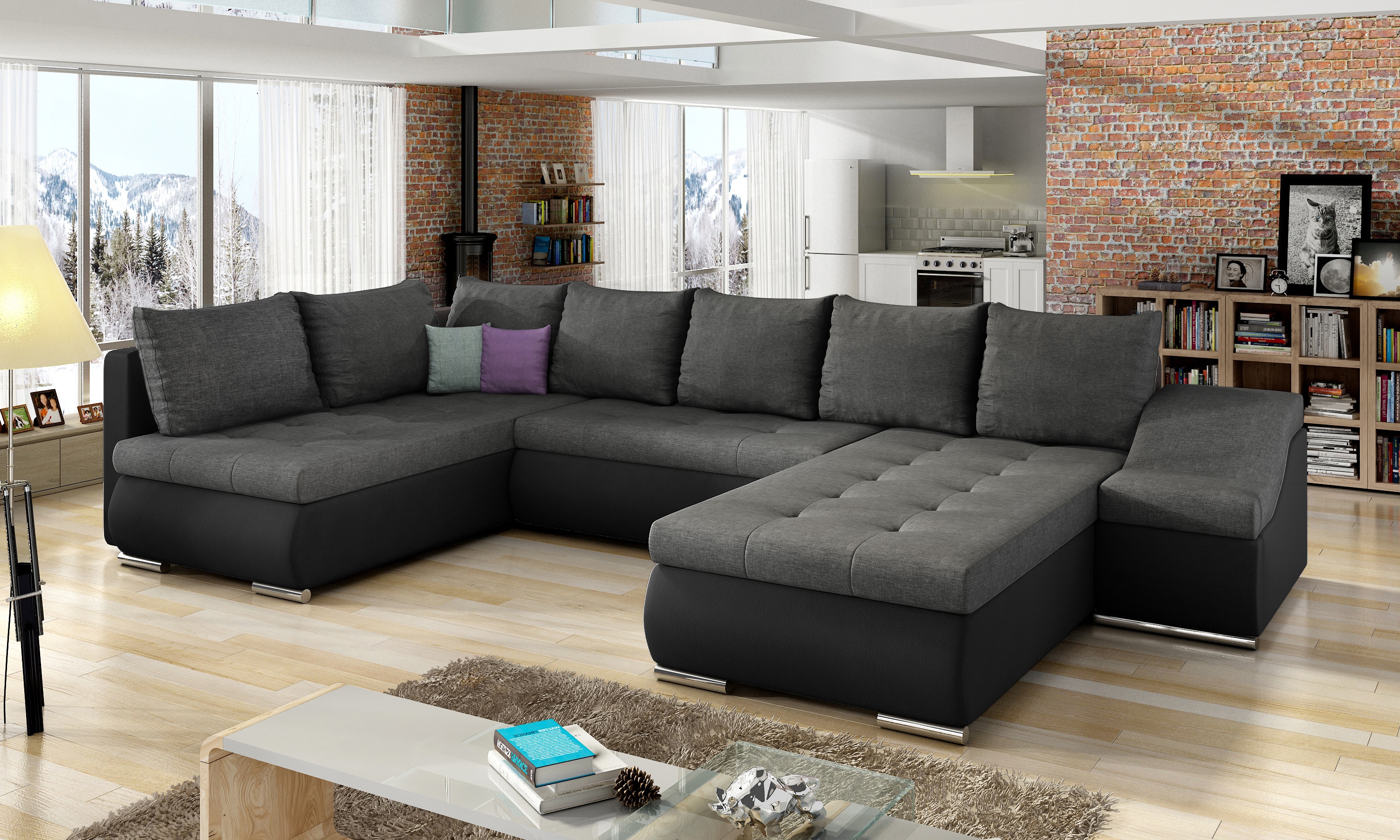 Moderní čalouněná sedací souprava Giovanni v dezénu látka šedá/eko tmavě šedá. Giovanni je velká, prostorná sedací souprava do tvaru U. Kostra sedací soupravy je vyrobena z kombinace tvrdého a měkkého dřeva. Výplň sedáku a opěrek je z kvalitní polyuretanové PUR pěny T30, která zaručuje maximální pohodlí. Sedačka je rozkládací a disponuje velkým úložným prostorem. Po rozložení se nábytek změní na postel 295x120. Pro zvýšení pohodlí při používání je roh vybaven další funkcí pro spaní. Po rozložení dostane uživatel další kontejner na ložní prádlo. Rohová s.s. Giovanni je zárukou pohodlného odpočinku. Potahová látka jako na hlavní fotografii, provedení pravé.