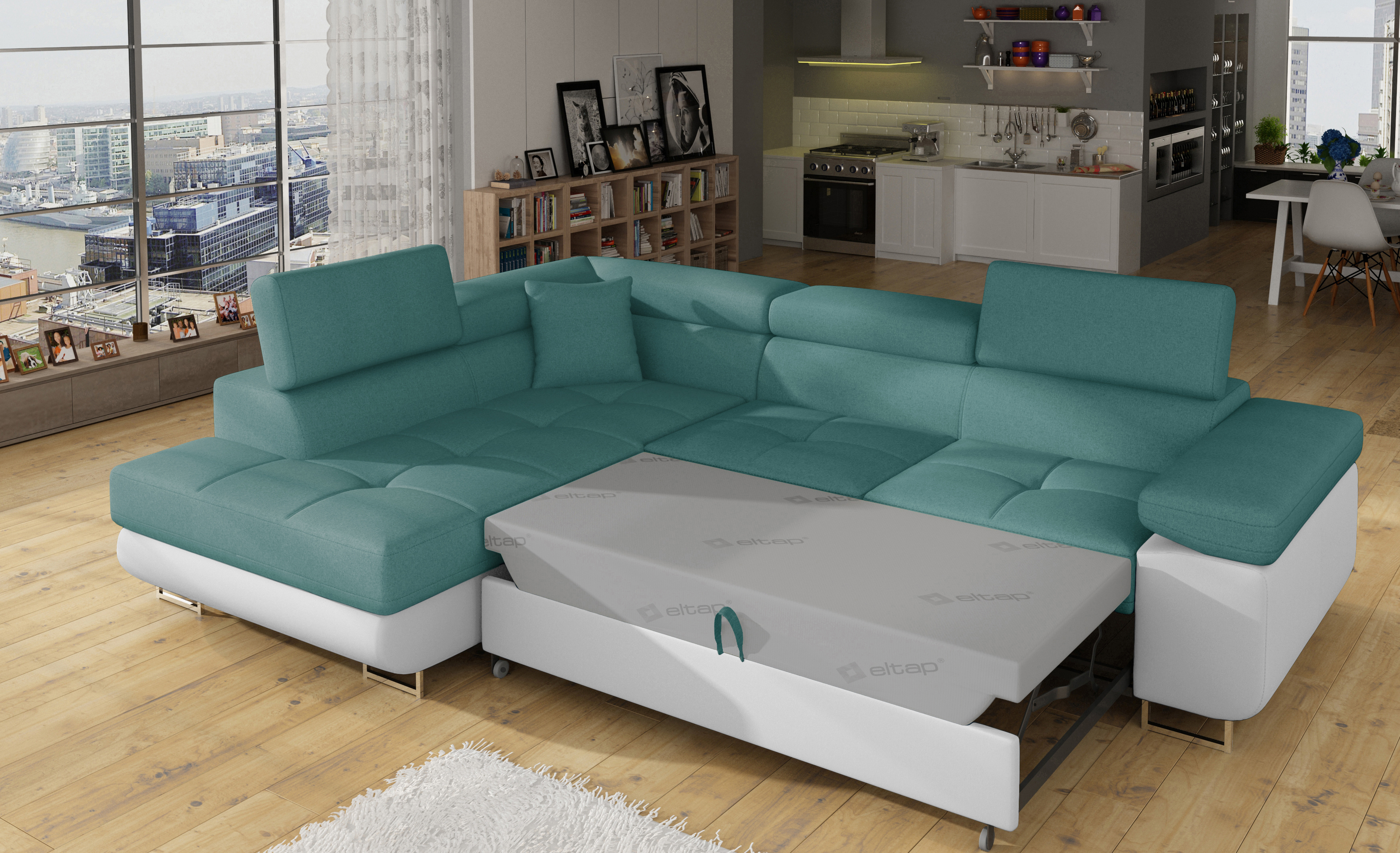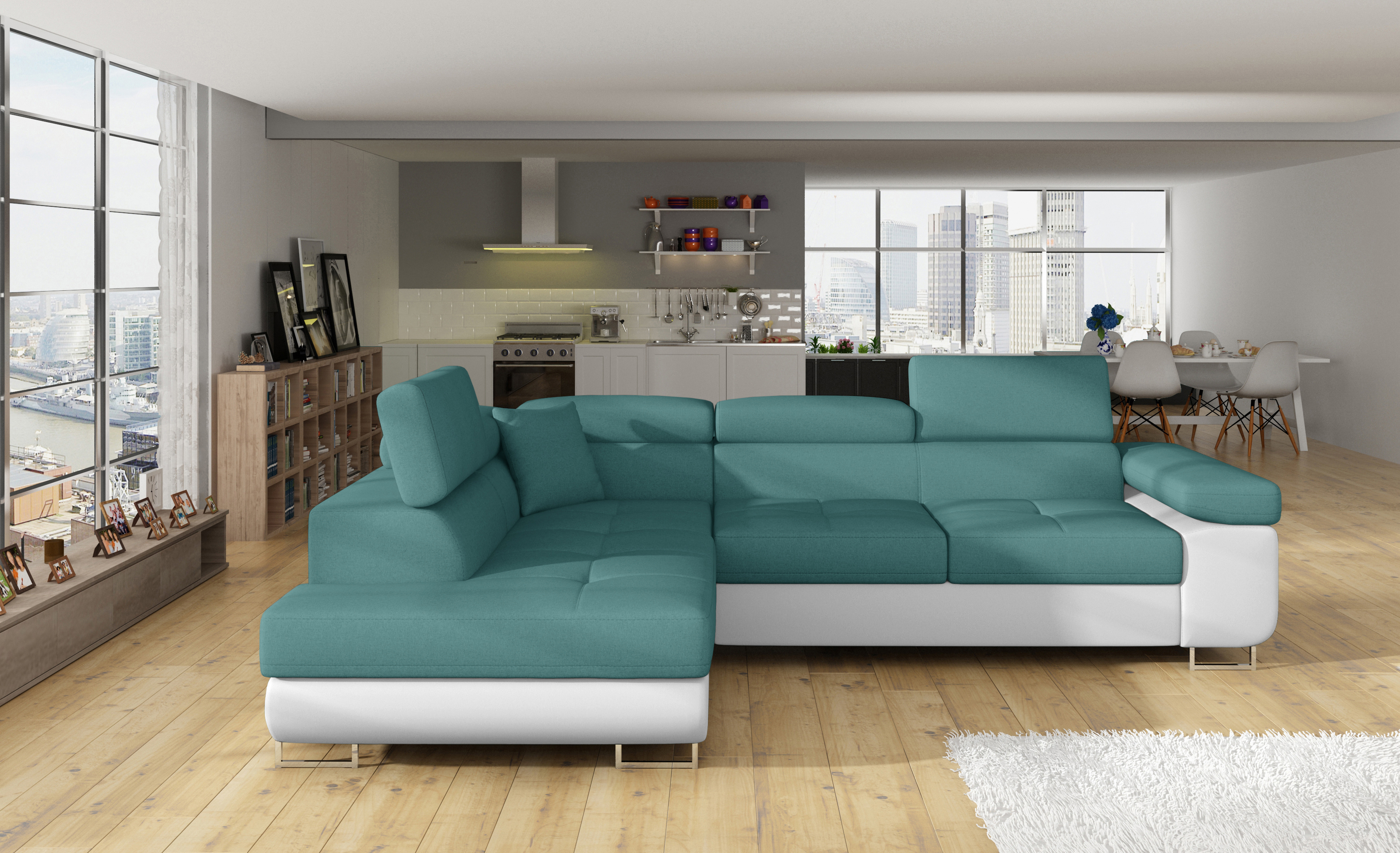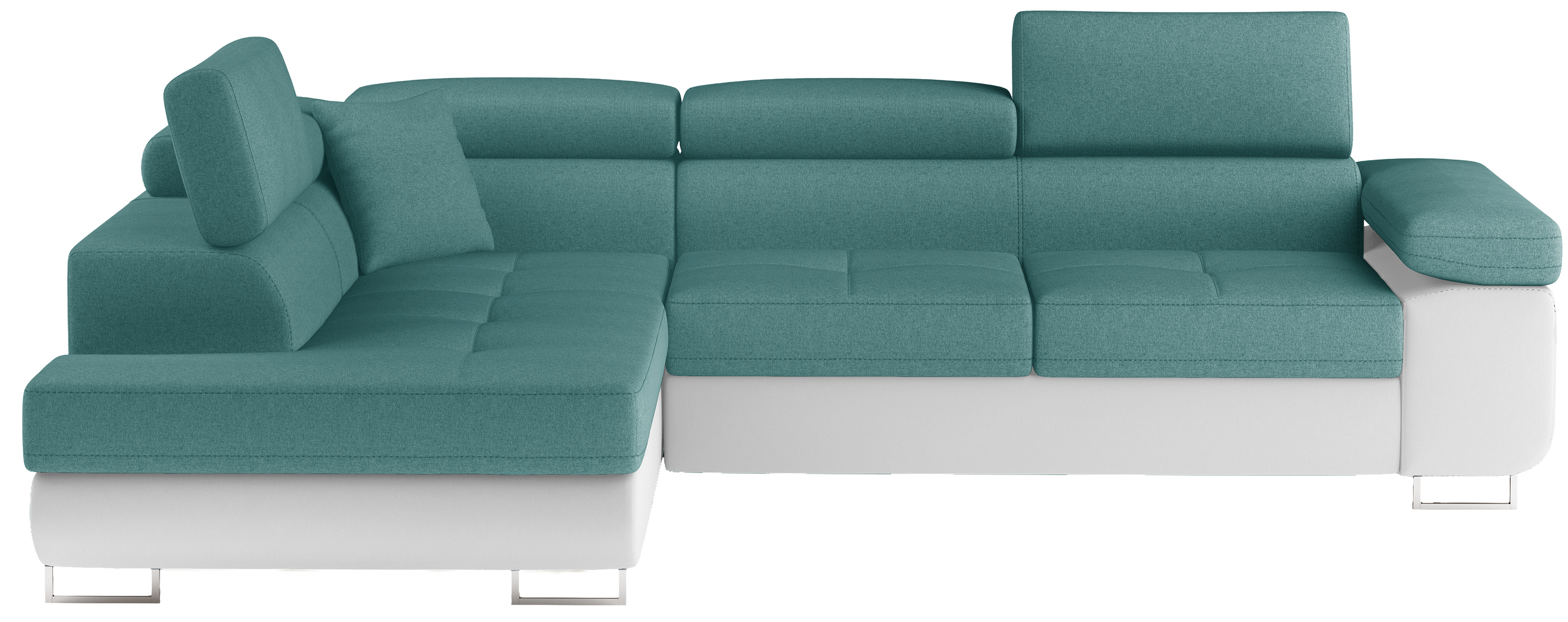 Rozkládací souprava Anton v barevném provedení látka Ontario 83/ eko kůže Soft 17. Výplň sedáků je vyrobena z vlnité pružiny a kvalitní PUR pěny T30. Souprava disponuje nastavitelnými opěrkami hlavy a úložným prostorem. Vytažení spodní části vznikne spací plocha 123x210 cm. Šířka područky 31 cm. Kovové nožky o šířce 20 cm a výšce 9 cm. Provedení levé.