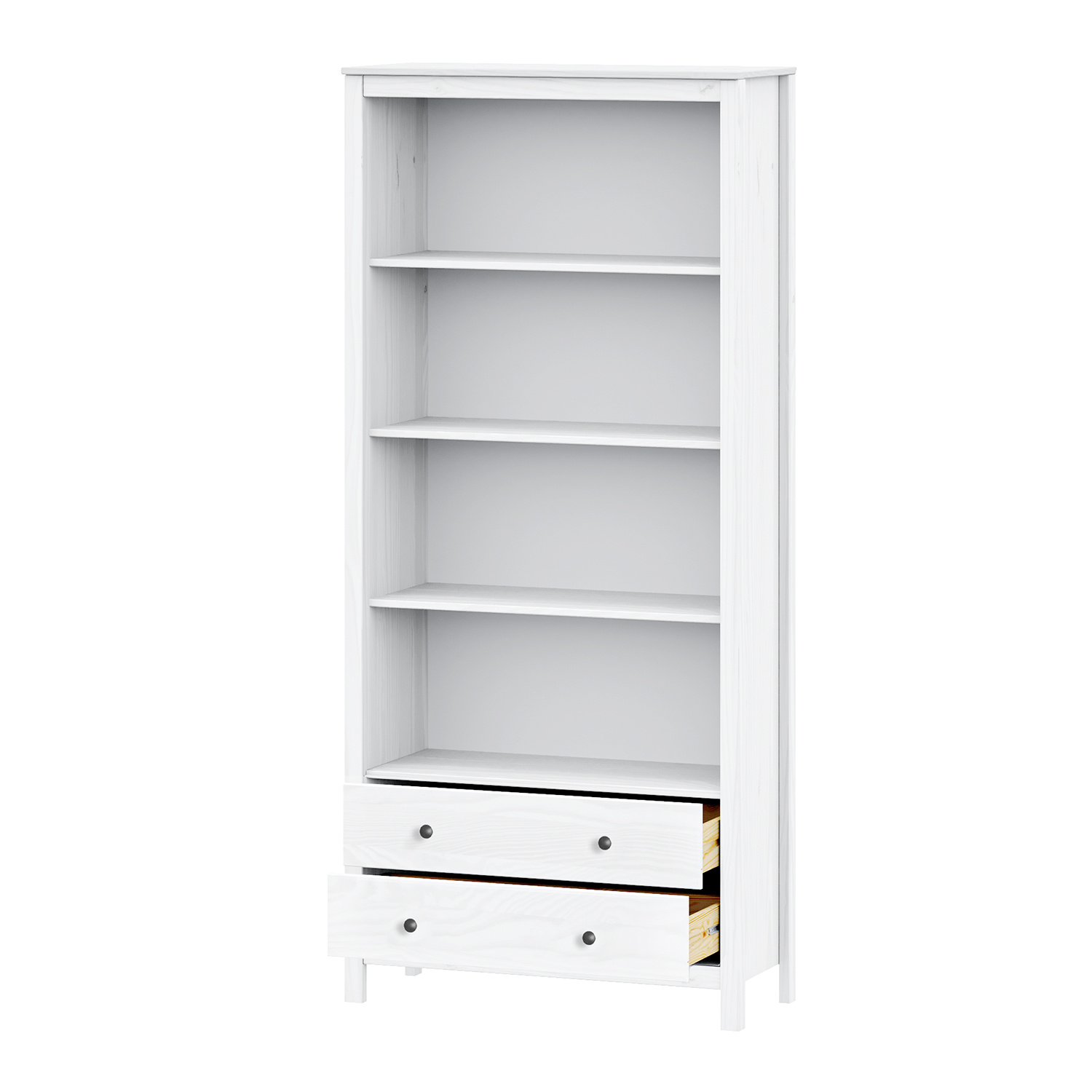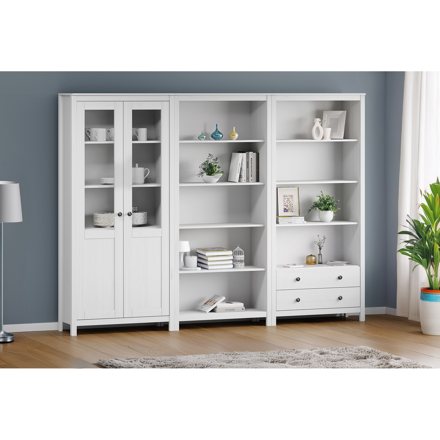 sestava knihoven TORINO 8070B a 8071BK a vitríny TORINO 8072BK materiál masiv borovice, barevné provedení bílý lak, kovové úchytky knihovna 8070B: čtyři police knihovna 8071BK: tři police, dvě zásuvky s kovovými pojezdy vitrína 8072BK: dvoje částečně prosklené dveře, čtyři police rozměr knihovny 8070B (š/h/v) 85 × 37 × 190 cm rozměr knihovny 8071BK (š/h/v) 85 × 37 × 190 cm rozměr vitríny 8072BK (š/h/v) 85 × 37 × 190 cm