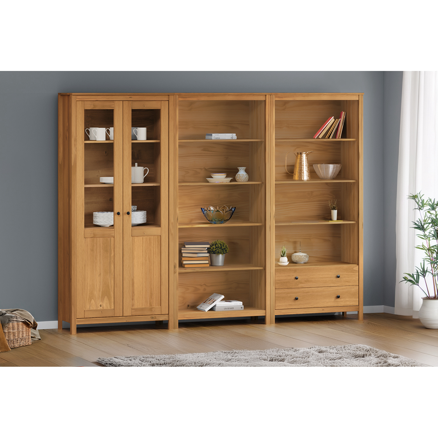 sestava knihoven TORINO 8070V a 8071V a vitríny TORINO 8072V materiál masiv borovice voskovaná v medovém odstínu kovové úchytky v barevném provedení černěná mosaz knihovna 8070V: čtyři police knihovna 8071V: tři police, dvě zásuvky s kovovými pojezdy vitrína 8072V: dvoje částečně prosklené dveře, čtyři police rozměr knihovny 8070V (š/h/v) 85 × 37 × 190 cm rozměr knihovny 8071V (š/h/v) 85 × 37 × 190 cm rozměr vitríny 8072V (š/h/v) 85 × 37 × 190 cm