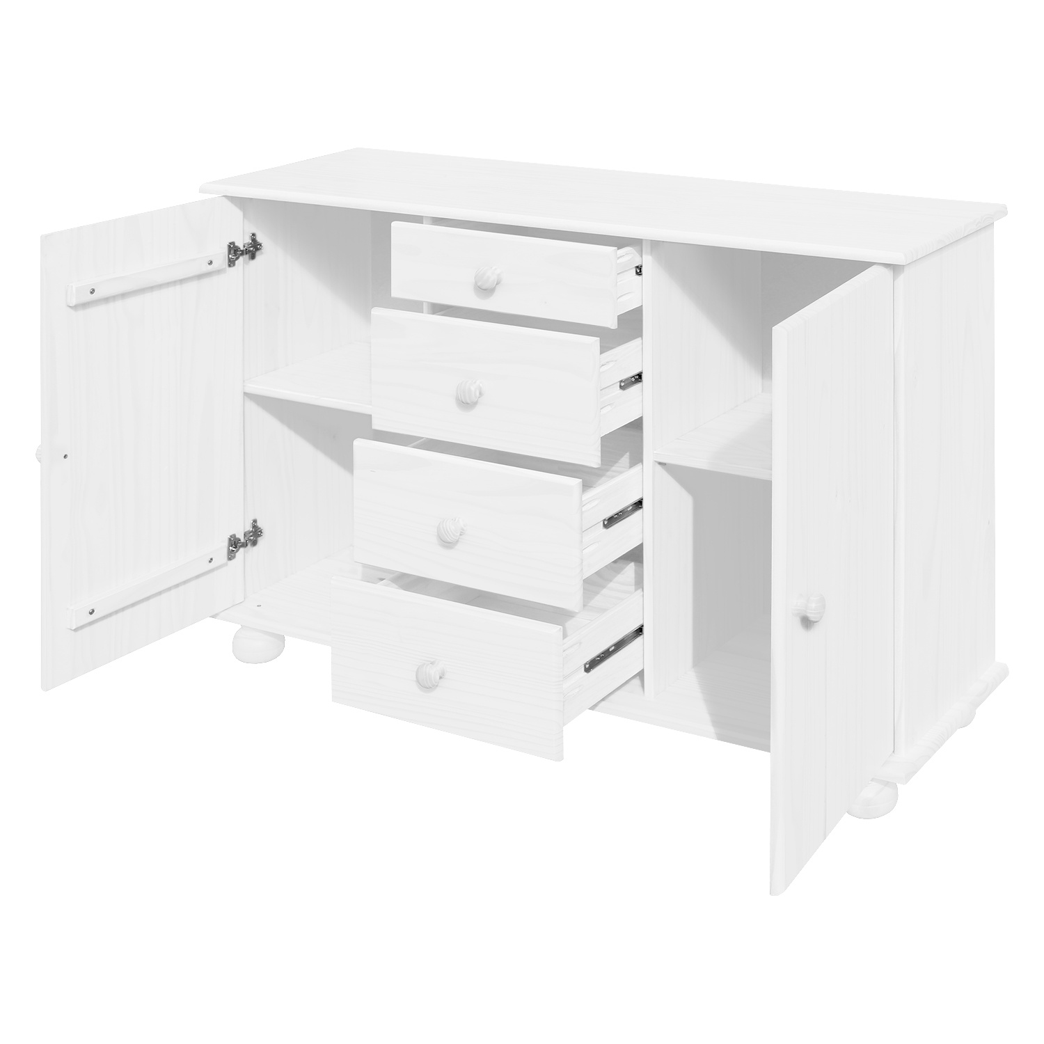 sestava příborníku 8045B a nástavce 8046B materiál masiv borovice, barevné provedení bílý lak příborník: 4 zásuvky s kovovými pojezdy, 2 skříňky s dvířky vybavené policí nástavec: 2 prosklená dvířka rozměr příborníku (š/h/v) 119 × 38 × 81 cm rozměr nástavce (š/h/v) 119 × 30 × 108 cm