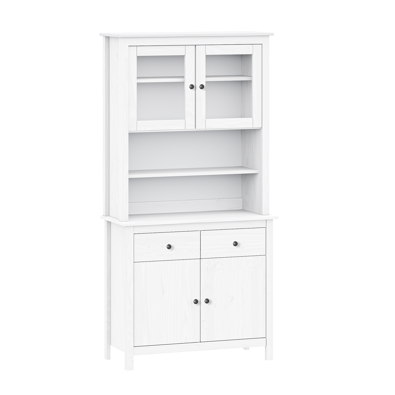 sestava příborníku TORINO 8095BK a nástavce TORINO 8096BK materiál masiv borovice, barevné provedení bílý lak, kovové úchytky příborník: 2 zásuvky s kovovými pojezdy, 2 plné dveře, 1 police nástavec: 2 prosklené dveře, 1 police rozměr příborníku (š/h/v) 90 × 40 × 80 cm rozměr nástavce (š/h/v) 90 × 33 × 100 cm