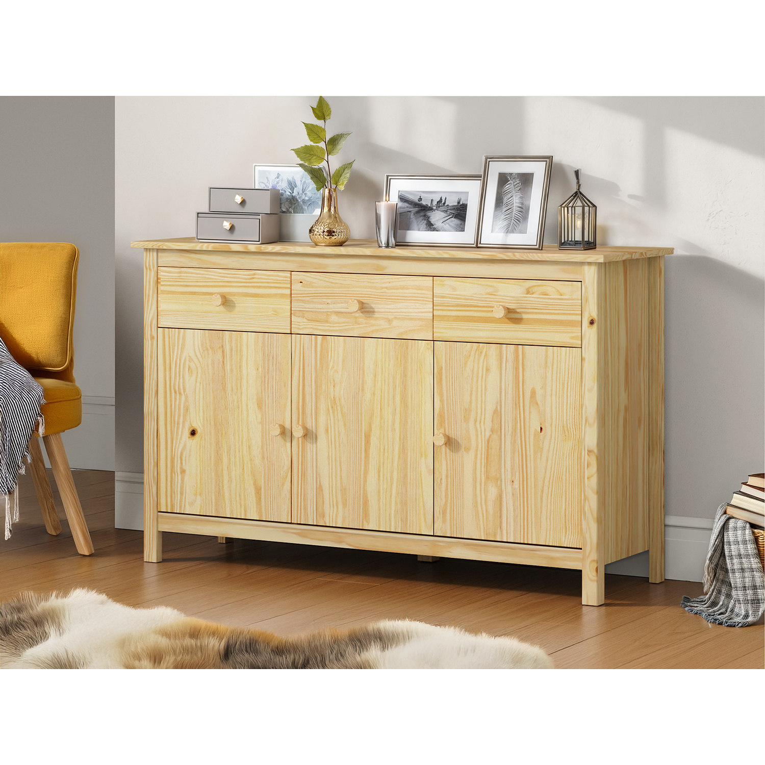 sestava příborníku TORINO 8062 a nástavce TORINO 8063 materiál masiv borovice, lakované provedení příborník: 3 dveře, 3 zásuvky s kovovými pojezdy nástavec: dvoje prosklená dvířka rozměr příborníku (š/h/v) 129 × 40 × 80 cm rozměr nástavce (š/h/v) 129 × 33 × 100 cm