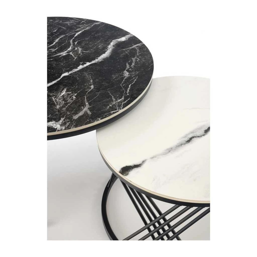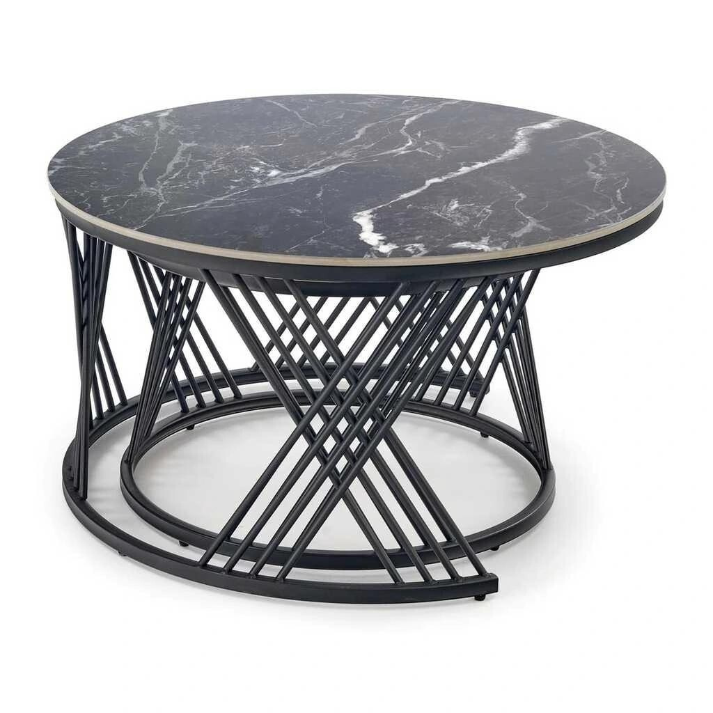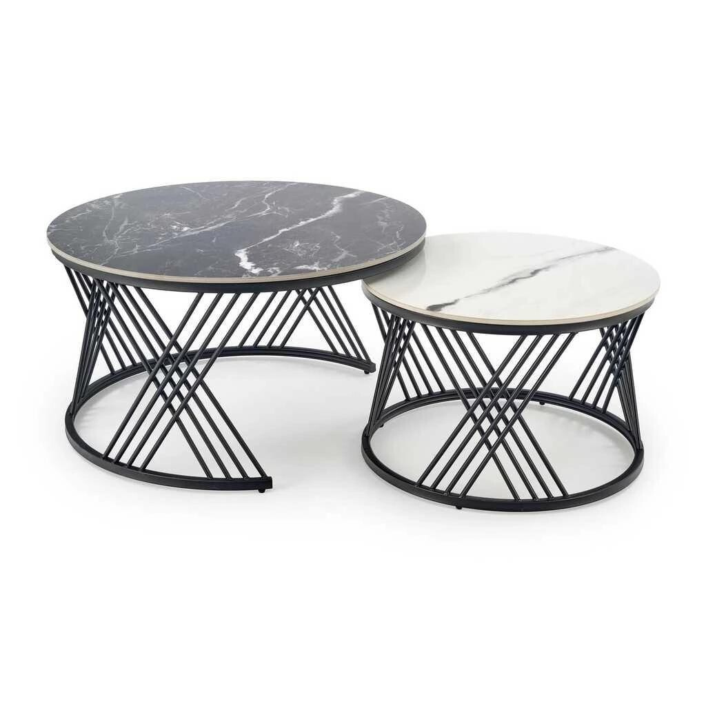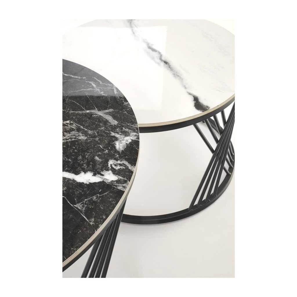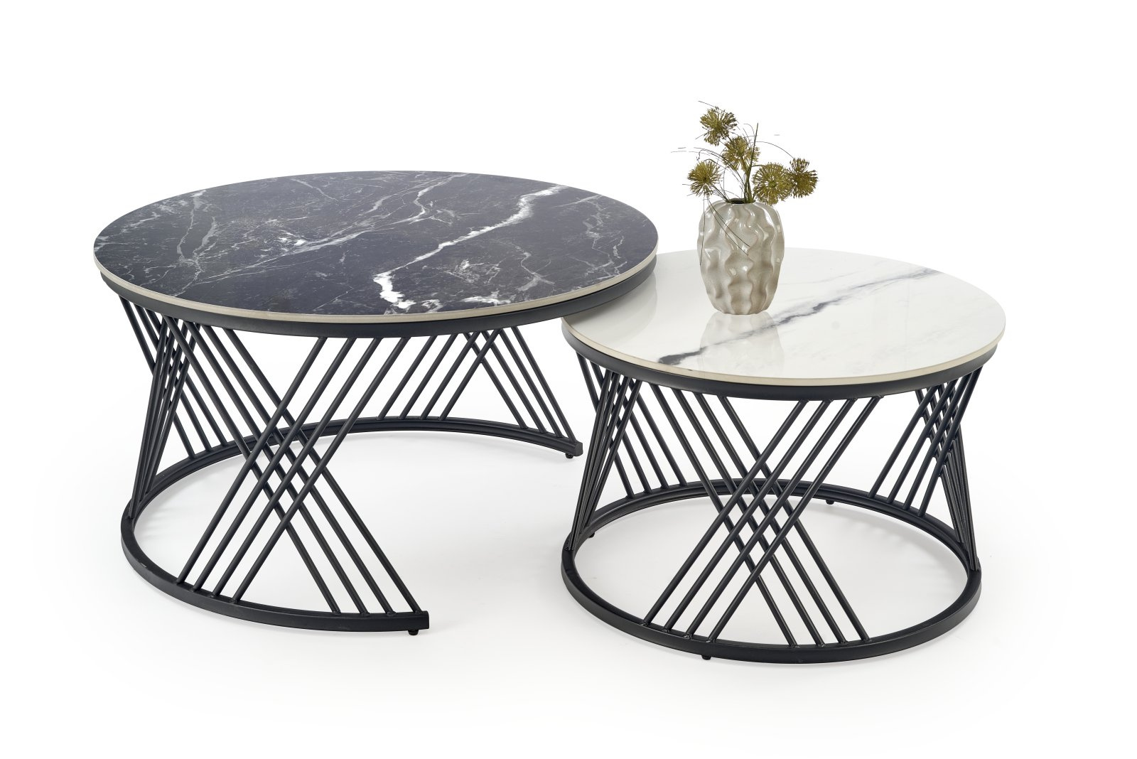 Elegantní set konferenčních stolků FLAMINGO má konstrukci vyrobenou z lakované oceli v černé barvě. Stolová deska je z slinutého kamene v dekoru bílý mramor/ černý mramor. Zboží dodáváme v demontu.