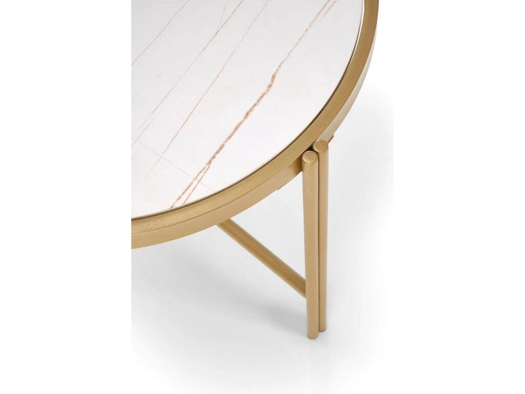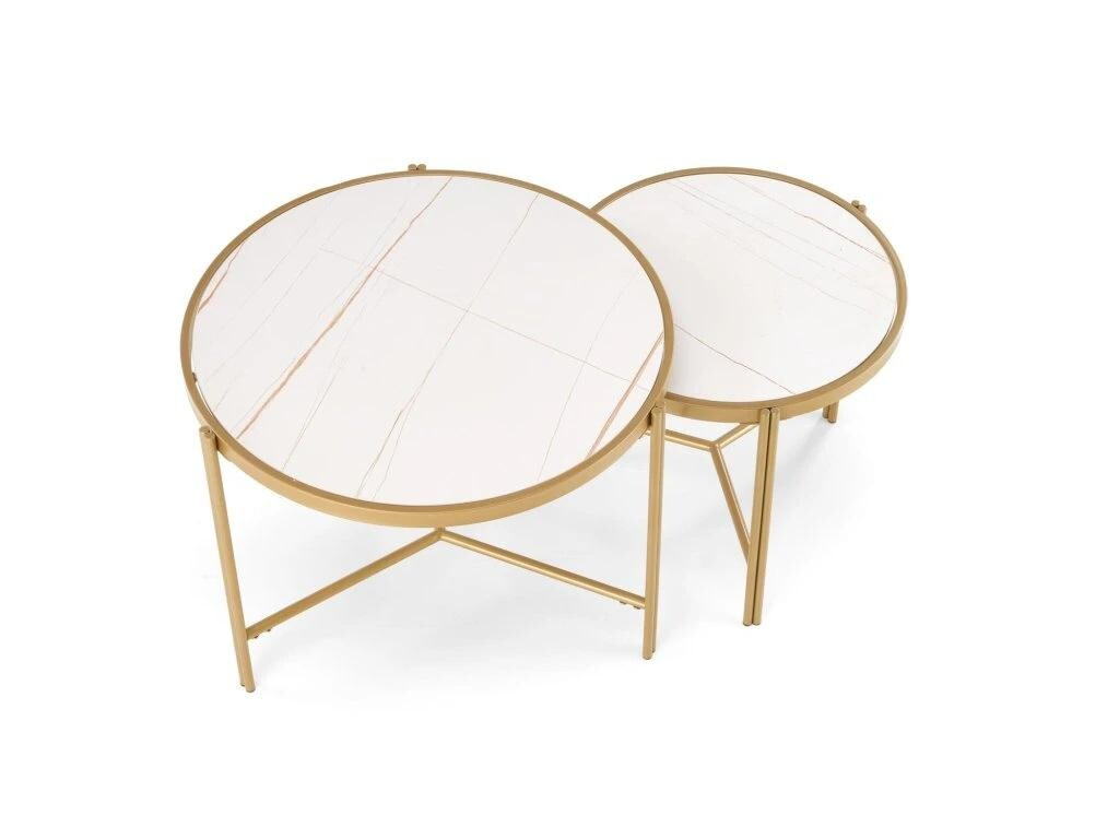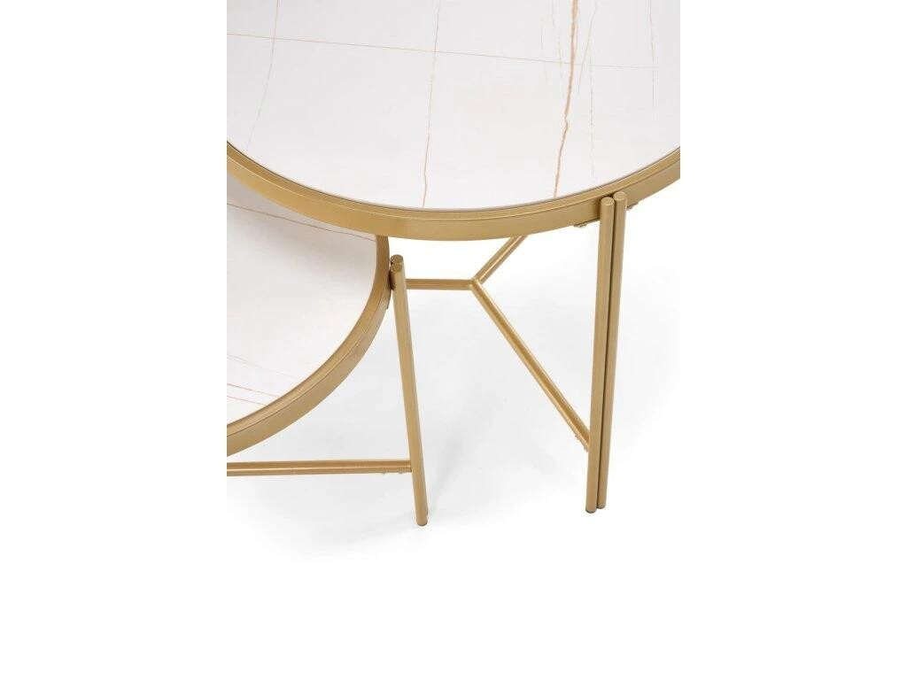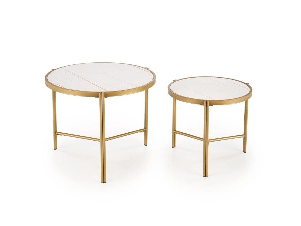 Sada dvou konferenčnícxh stolů má konstrukci z elegantní nerezové ocel s práškově lakovanou úpravou ve zlaté barvě. Jeho deska je vyrobena ze slinutého kamene v barvě bílý mramor. ZBoží dodáváme v demontu.