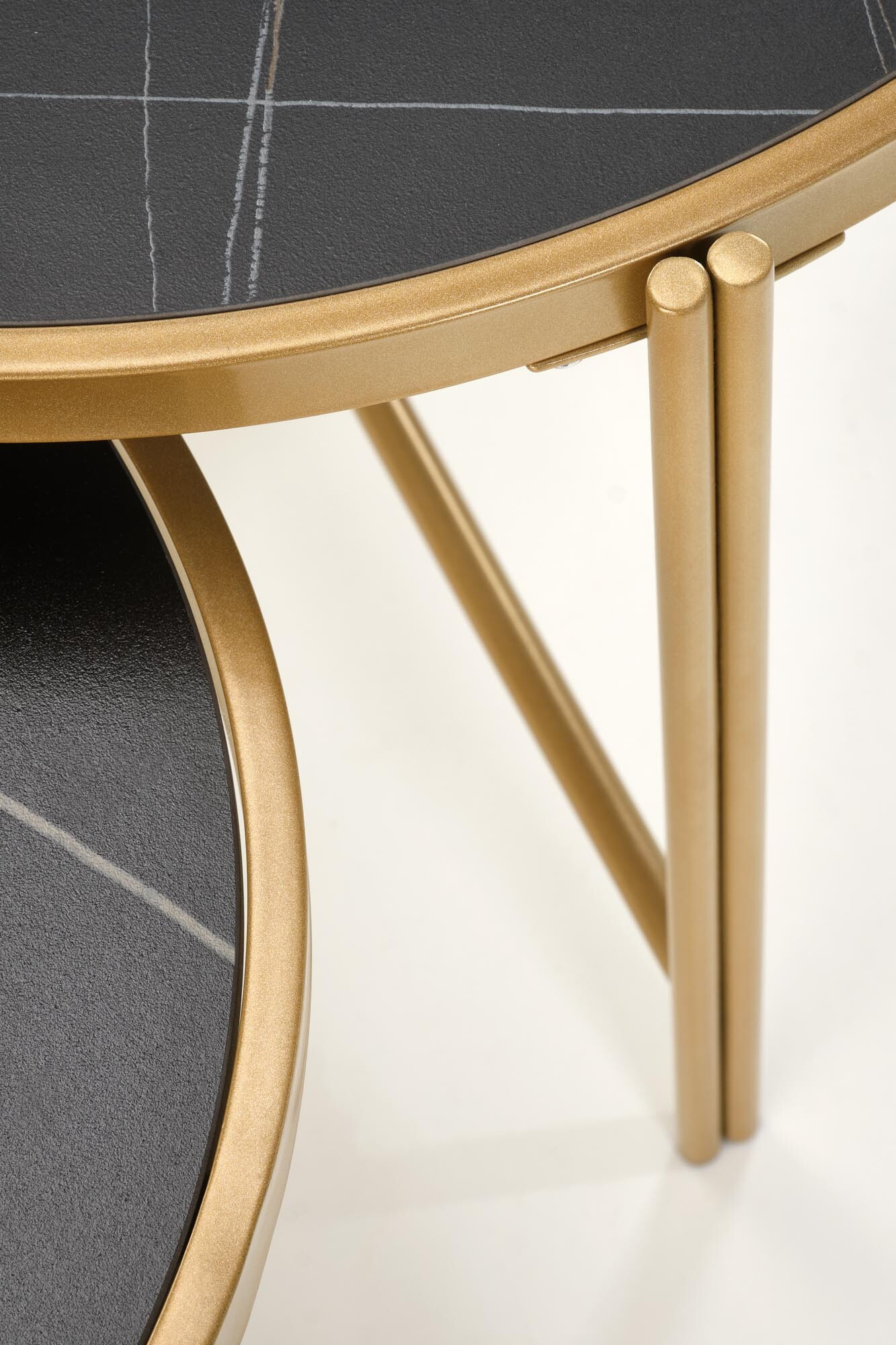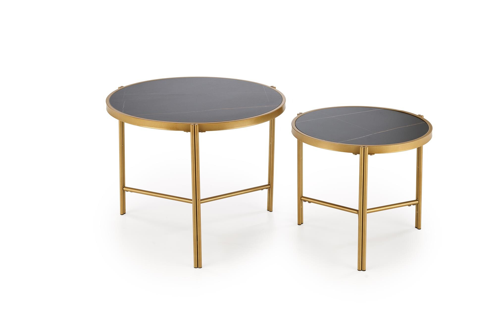 Sada dvou konferenčnícxh stolů má konstrukci z elegantní nerezové ocel s práškově lakovanou úpravou ve zlaté barvě. Jeho deska je vyrobena ze slinutého kamene v barvě černý mramor. ZBoží dodáváme v demontu.
