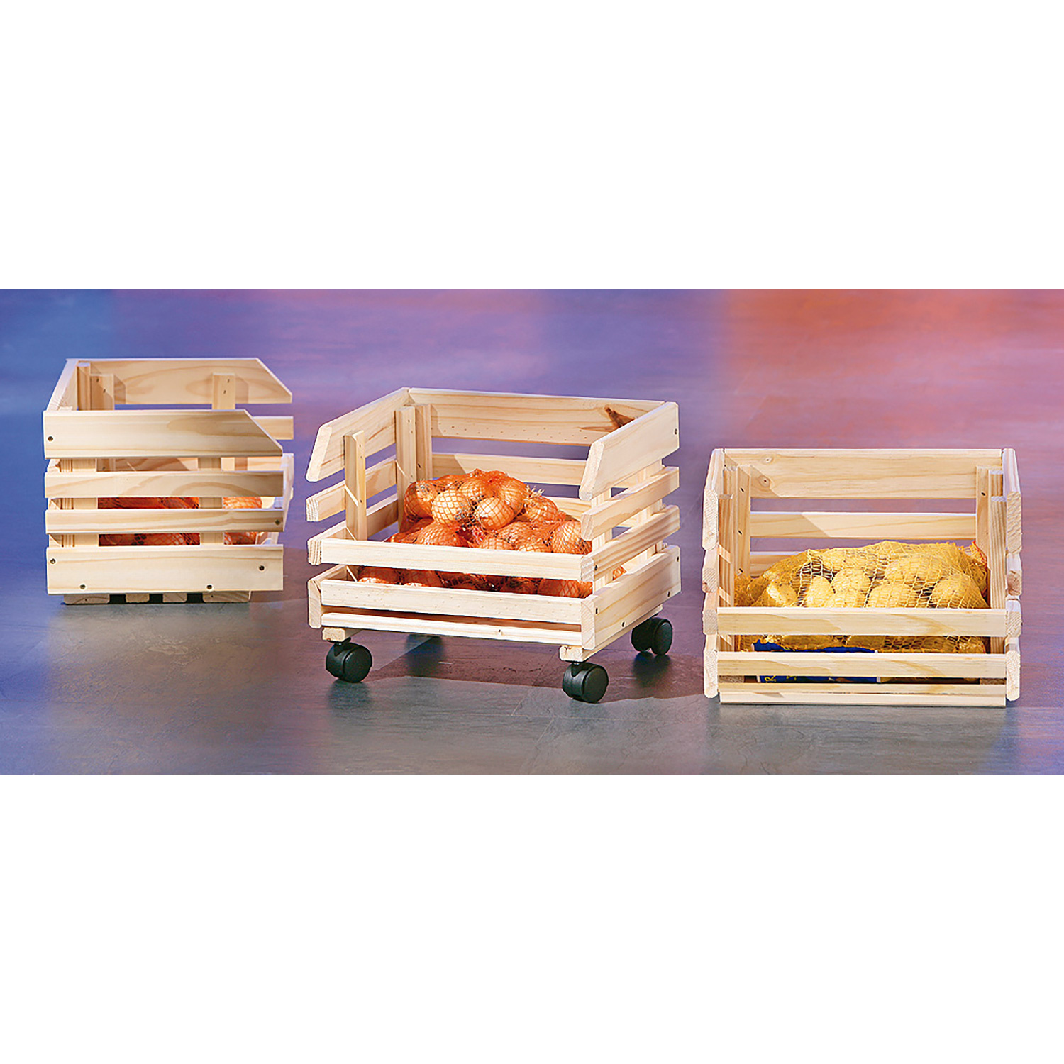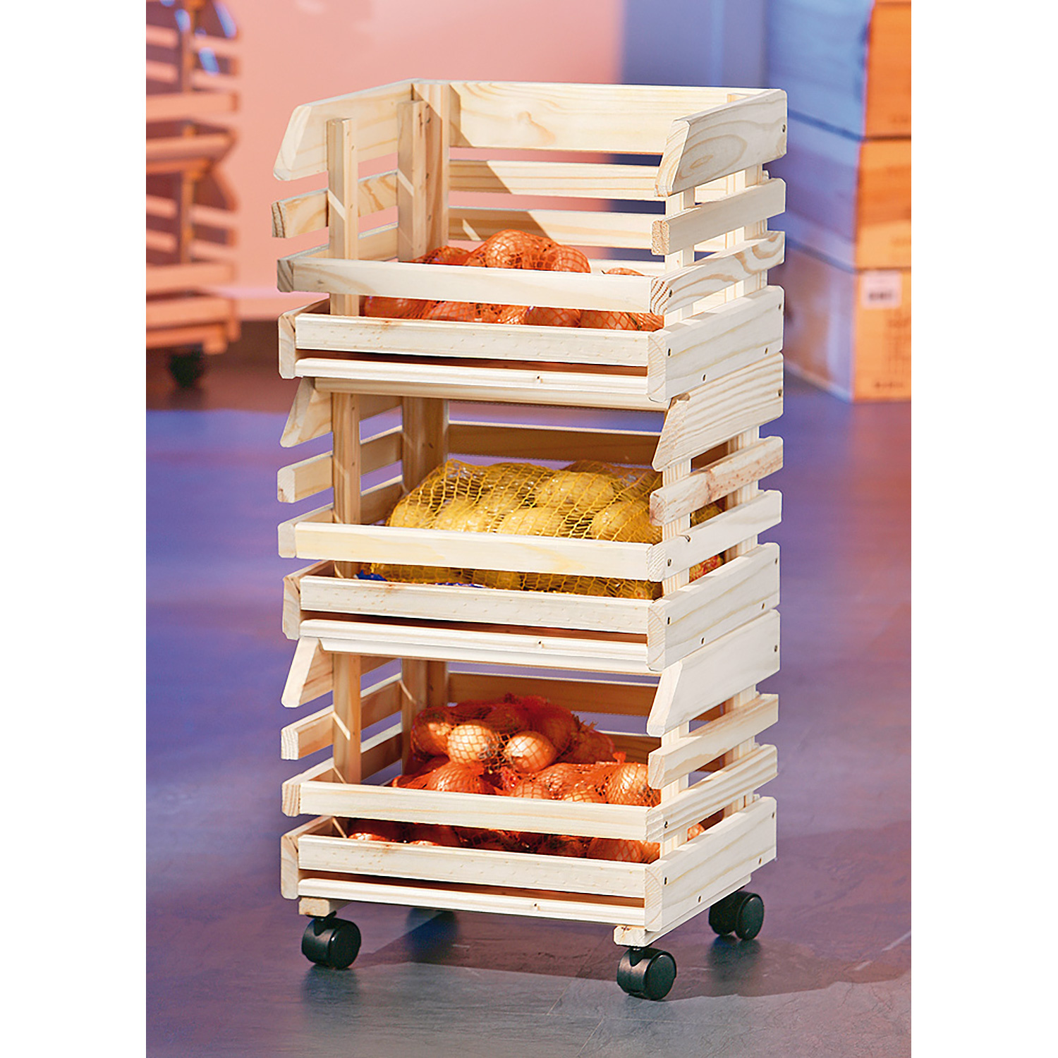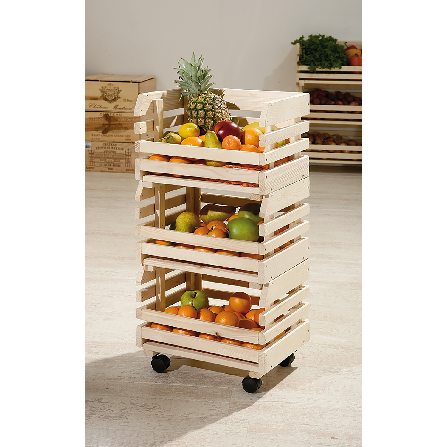 Skládací regál FRUITS v provedení masiv jsou skvělou pomůckou při skladování potravin. Dřevěné bedýnky jsou prodyšné, takže v nich ovoce a zelenina vydrží déle svěží. Tento regál je složen ze tří stohovatelných bedýnek. Spodní bedýnka je opatřena kolečky, takže i plný regál snadno přesunete do kuchyně, kde vám bude nápomocen při vaření. Zboží dodáváme v demontu.