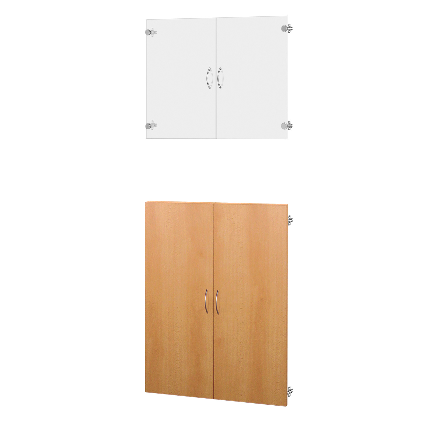 2 kusy skleněných dvířek 39,5 × 65 cm, 2 kusy plných dvířek bílá 40 × 97 cm v barvě