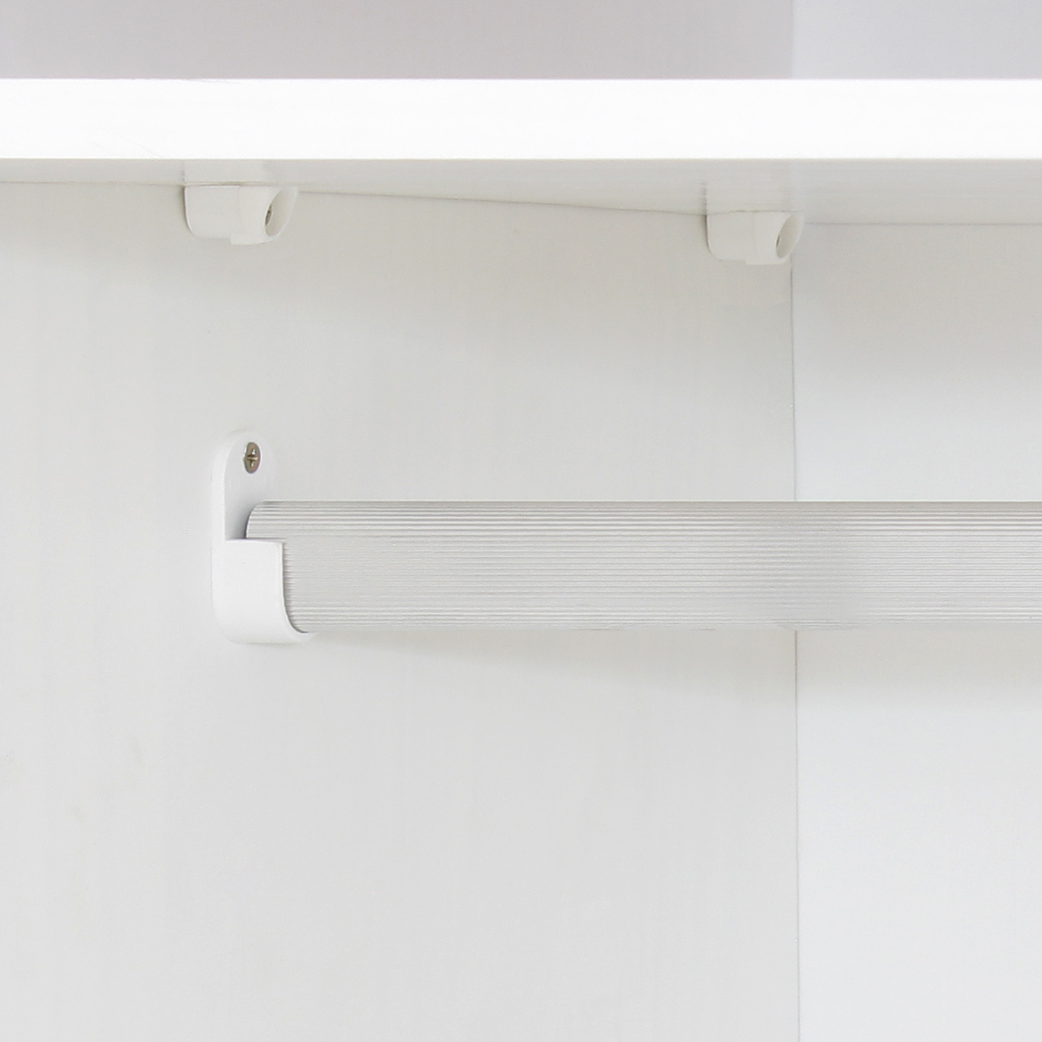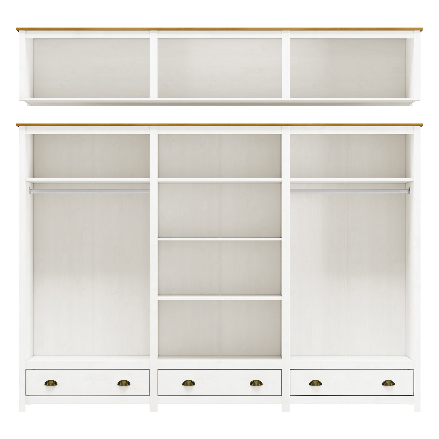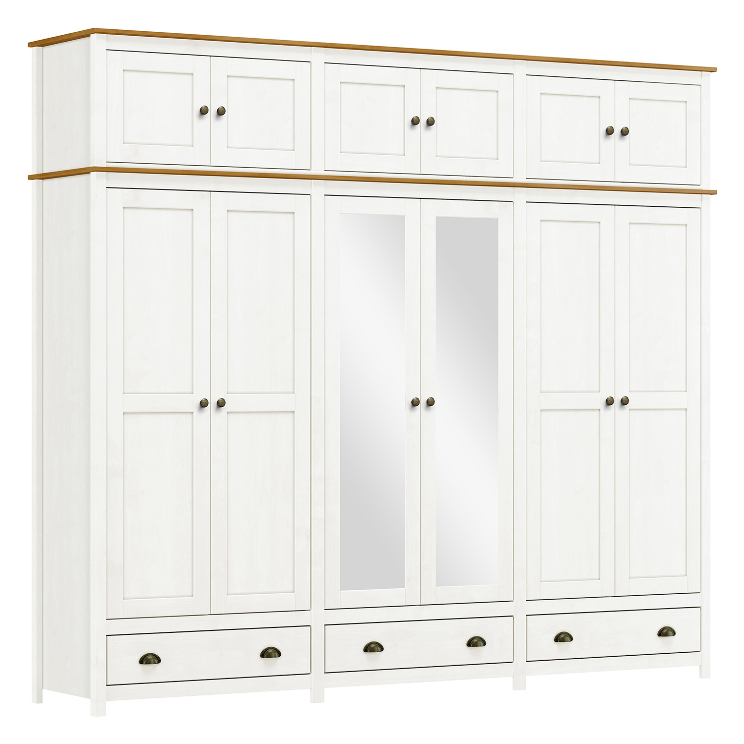 materiál masiv borovice, barevné provedení bílý / hnědý lak tři zásuvky s kovovými úchytkami a pojezdy v levé a pravé části 1 police a kovová šatní tyč, ve střední části 3 police, na dvou středních dveřích je zrcadlo nástavec je součástí dodávky