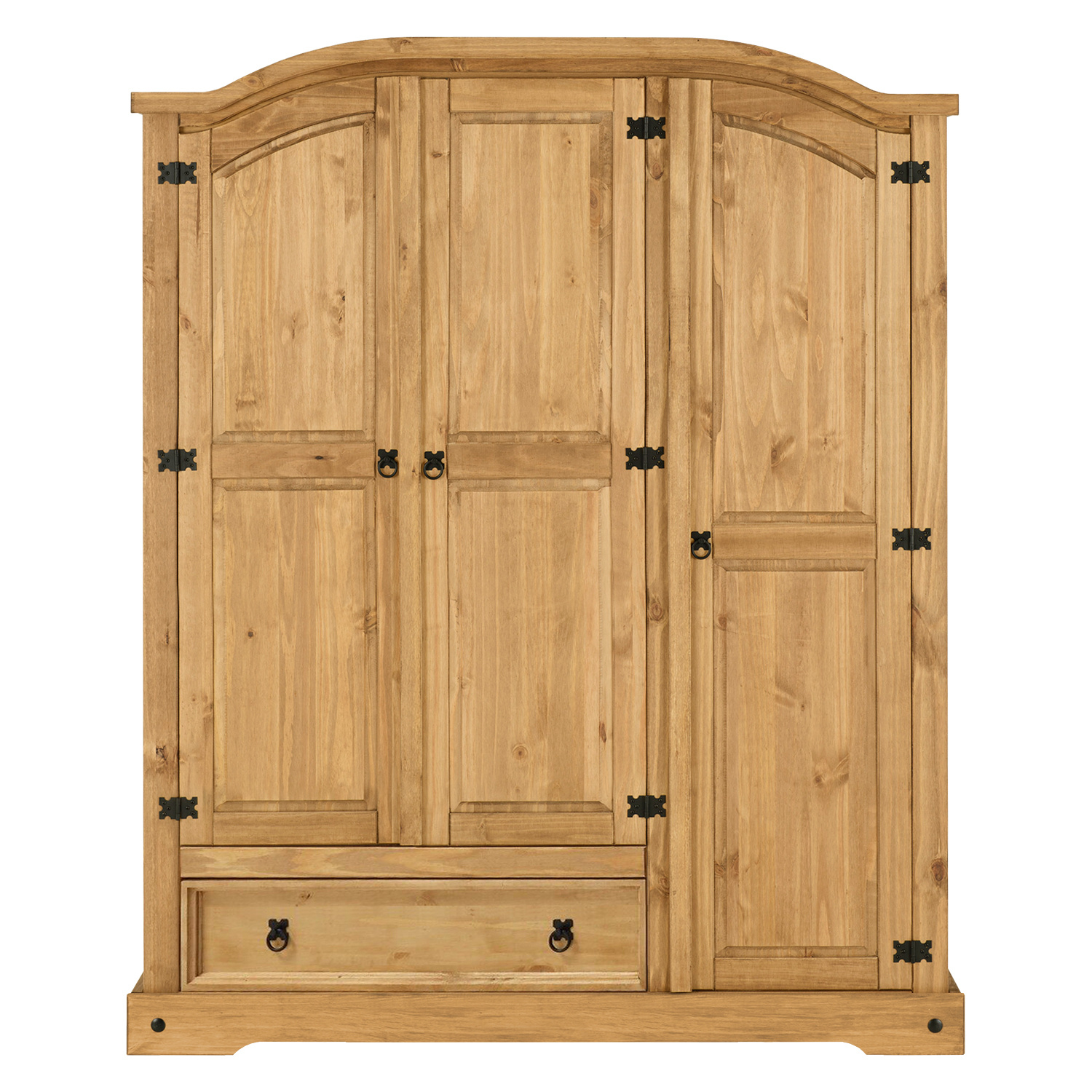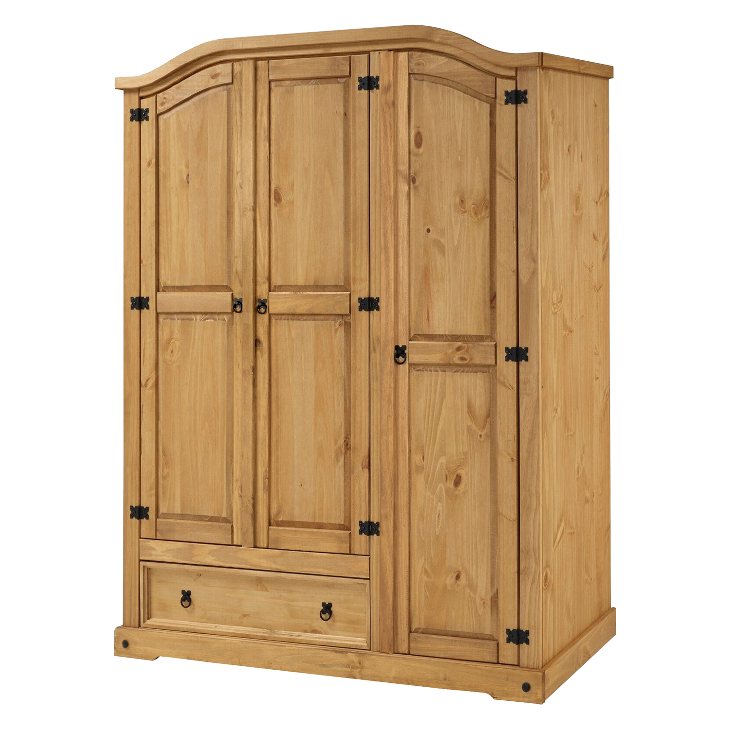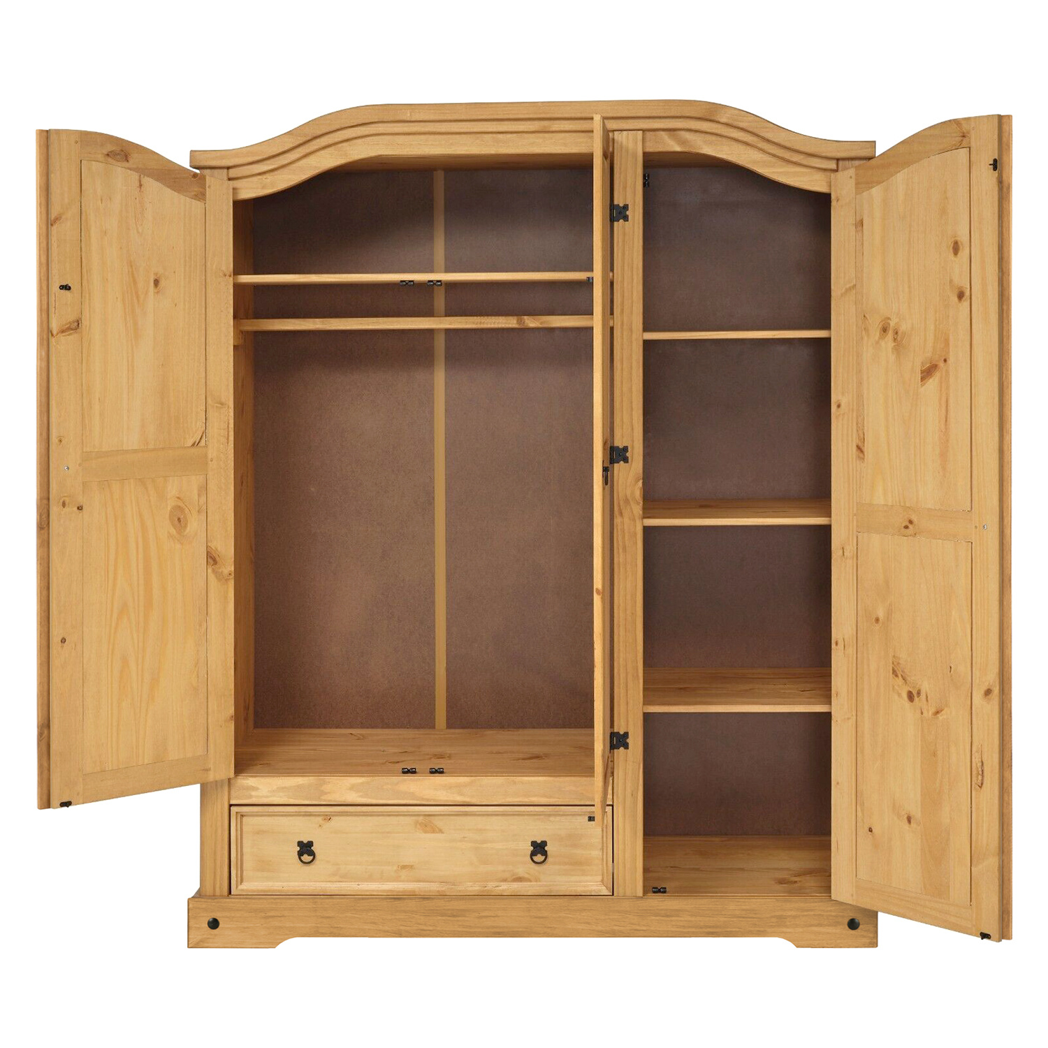 materiál masiv borovice voskovaná v medovém odstínu prostor dělený v poměru 2:1 širší část šatní tyč a police na klobouky, ve spodní části široká zásuvka užší část 3 police z toho 2 variabilní kovové ozdobné úchytky součást sestavy Corona