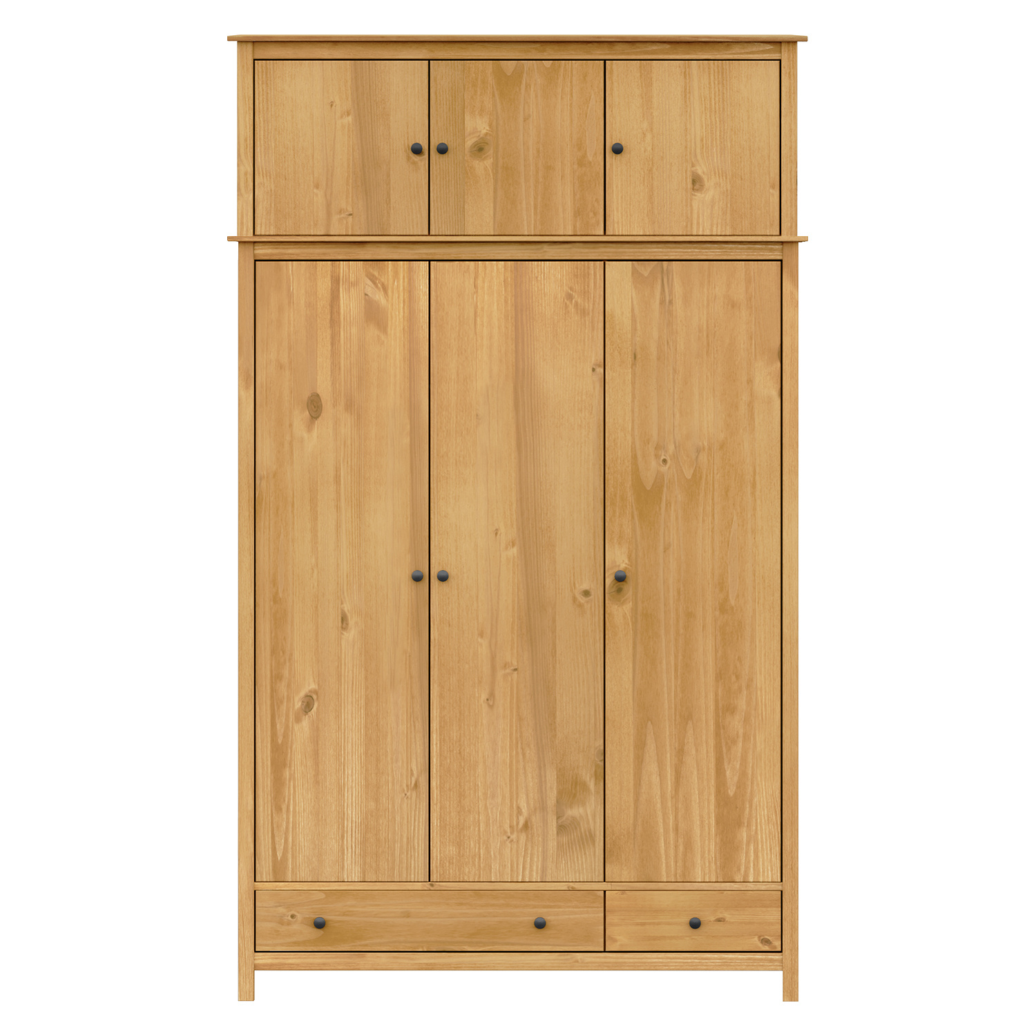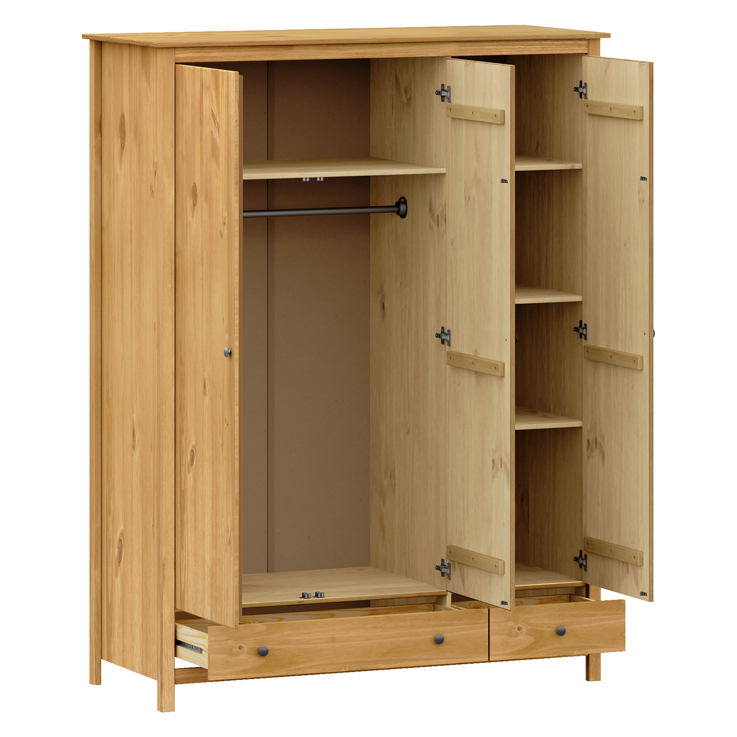 materiál masiv borovice voskovaná v medovém odstínu kovové úchytky v barevném provedení černěná mosaz prostor dělený v poměru 2:1 širší část šatní tyč a police, užší část 3 police ve spodní části 2 zásuvky s kovovými pojezdy doporučený nástavec 8189V