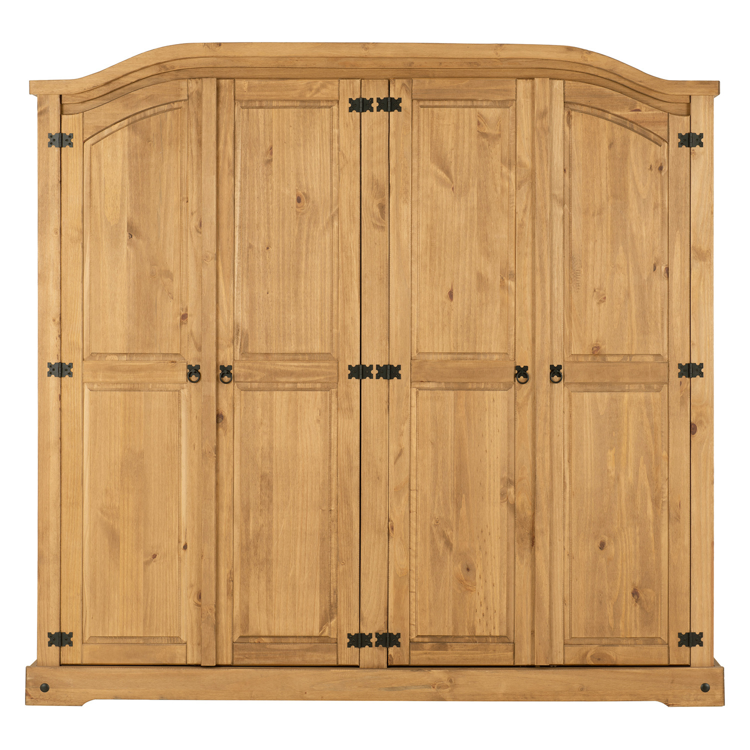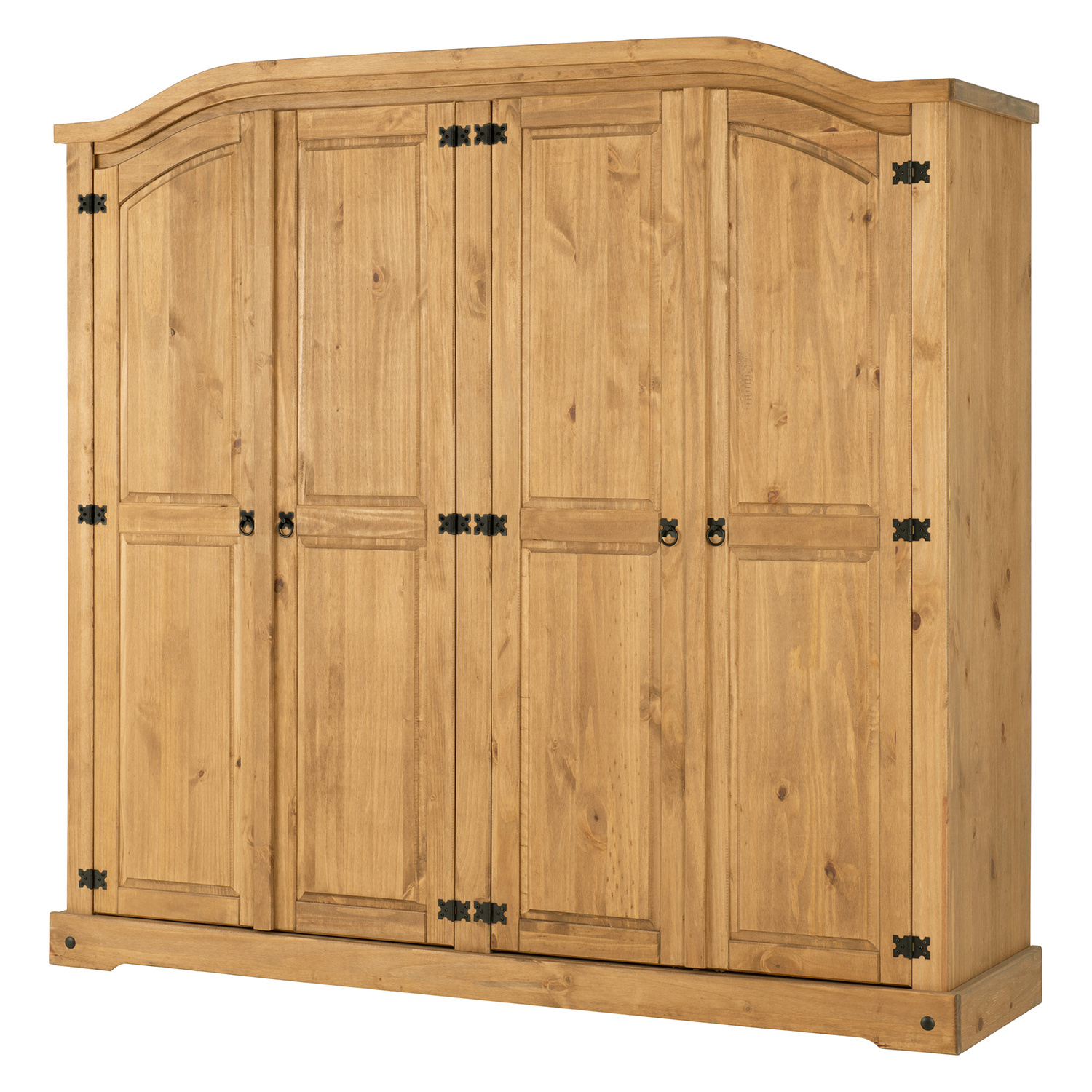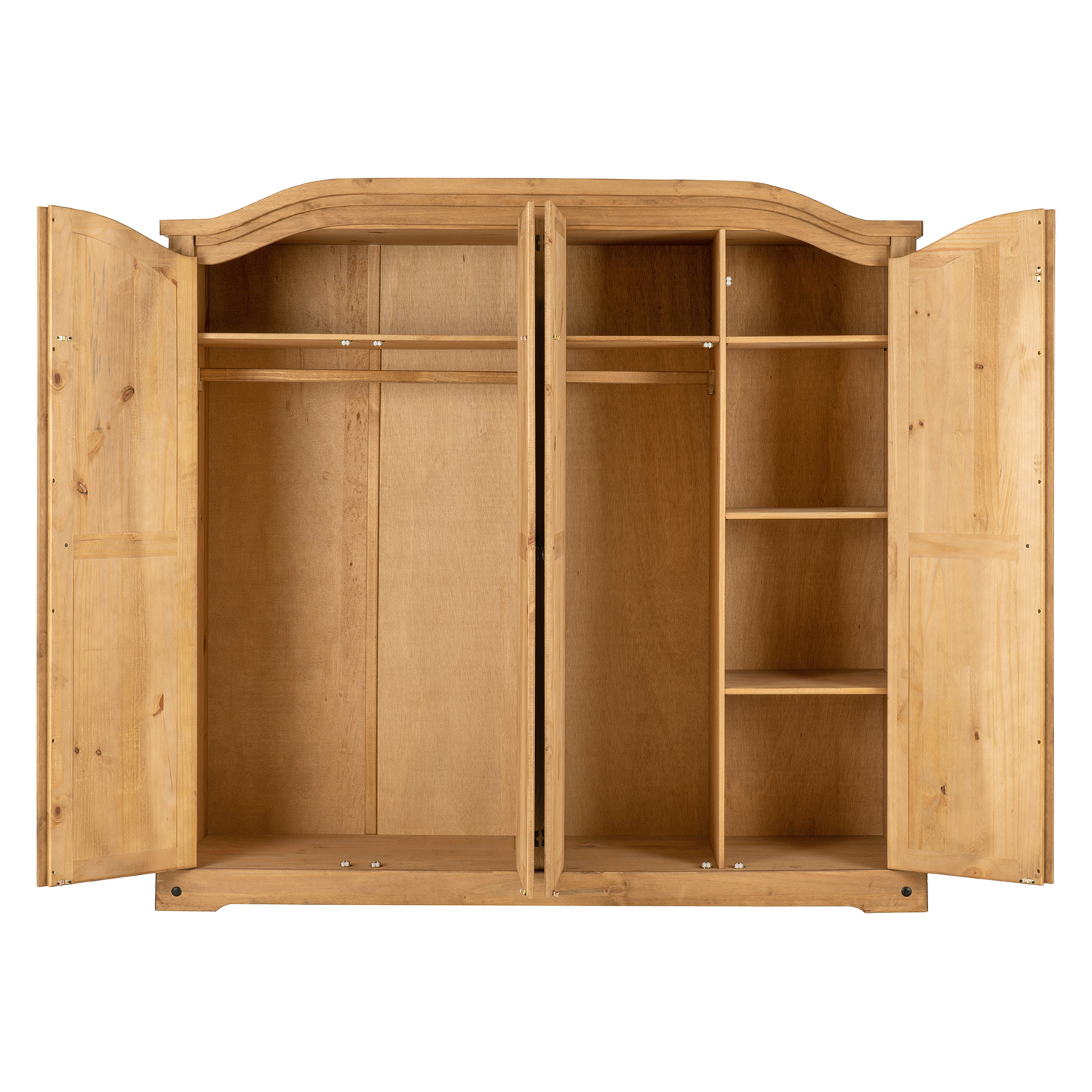 materiál masiv borovice voskovaná v medovém odstínu prostor dělený na polovinyv levé části šatní tyč a police na klobouky v pravé části vlevo šatní tyč a police na klobouky, vpravo 3 police z toho 2 variabilní kovové ozdobné úchytky součást sestavy Corona