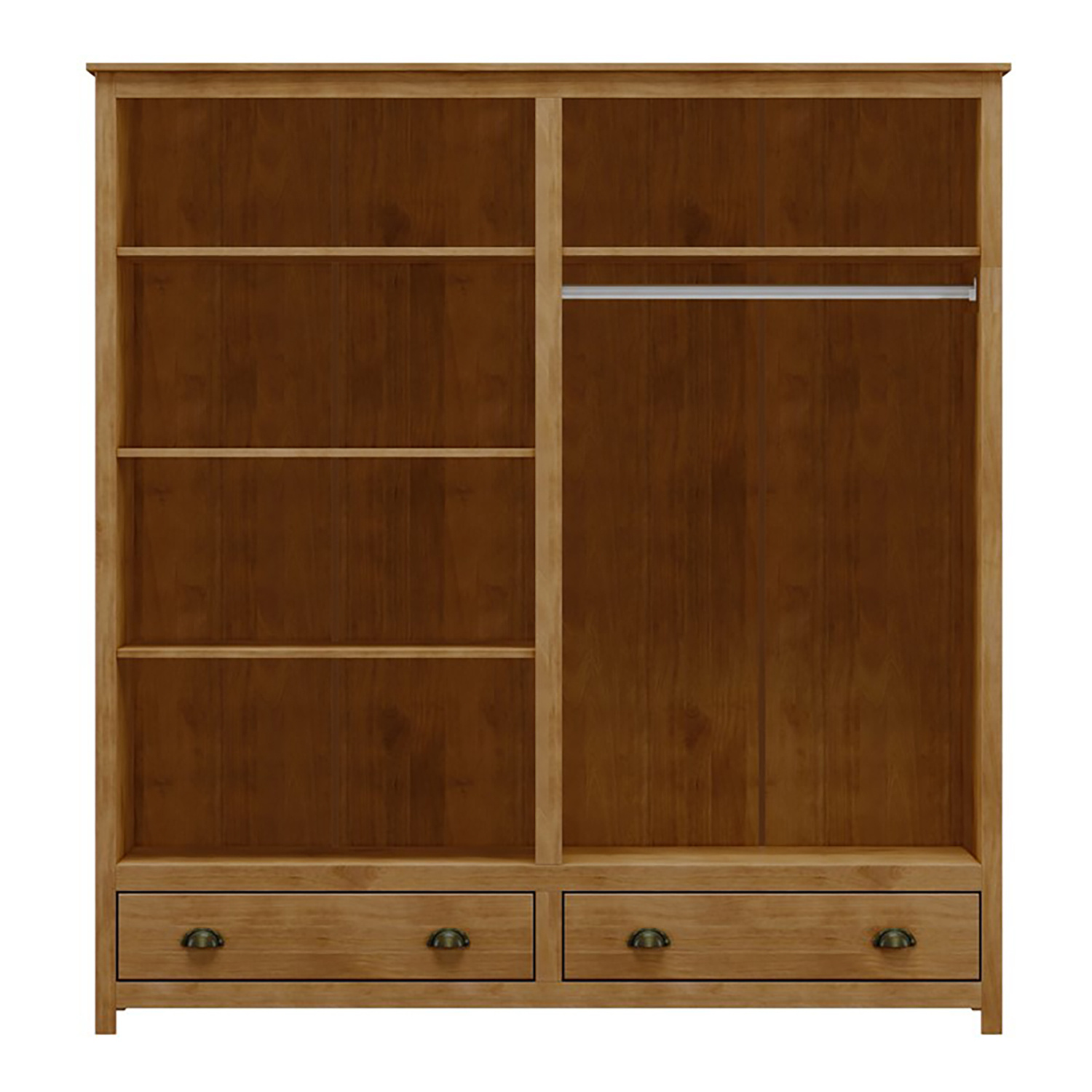 materiál masiv borovice, barevné provedení dub dvě zásuvky s kovovými úchytkami a pojezdy v levé části 3 police, v pravé části 1 police a kovová šatní tyč