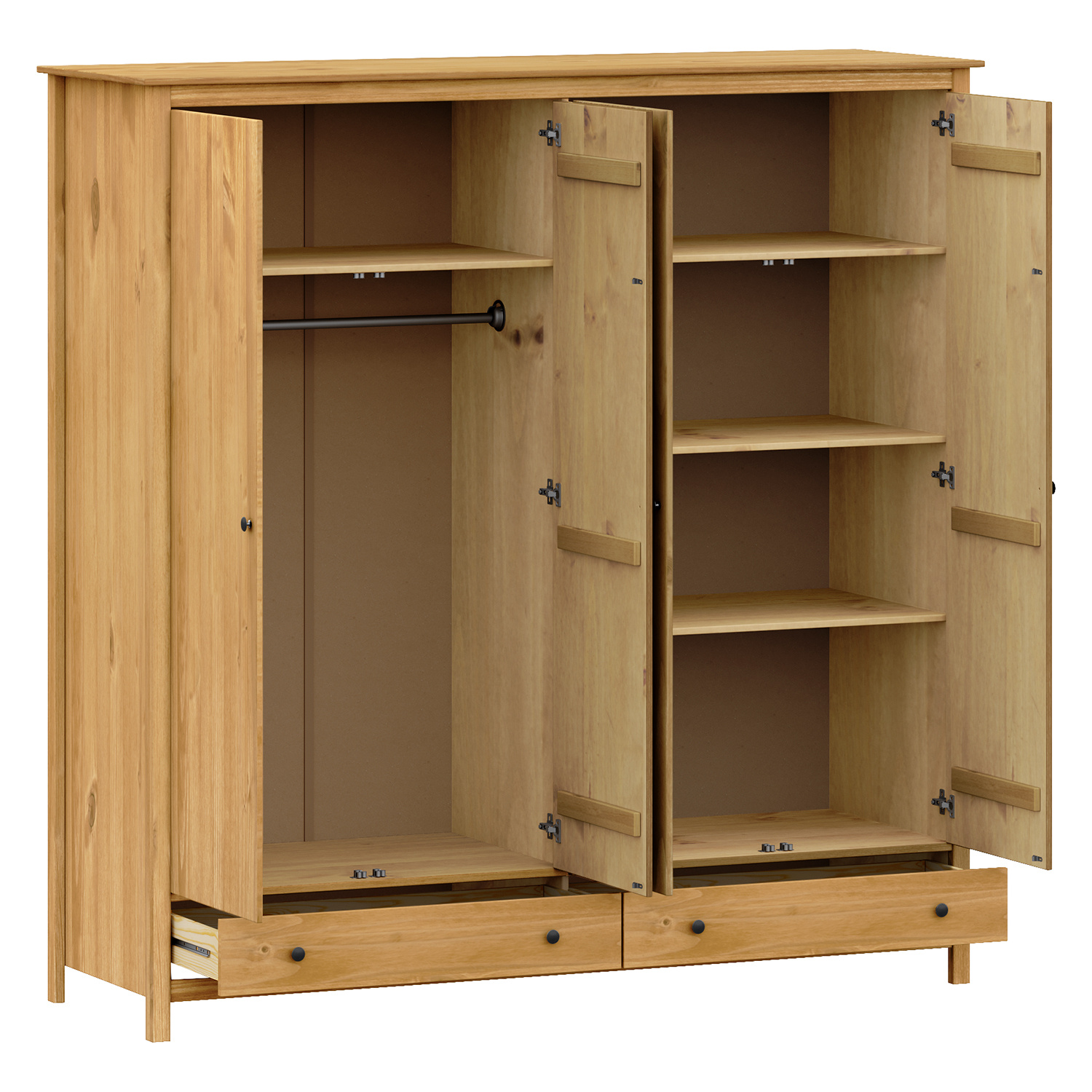 materiál masiv borovice voskovaná v medovém odstínu kovové úchytky v barevném provedení černěná mosaz prostor dělený na poloviny v levé polovině šatní tyč a police na klobouky v pravé polovině 3 police ve spodní části 2 zásuvky s kovovými pojezdy doporučený nástavec 8168V