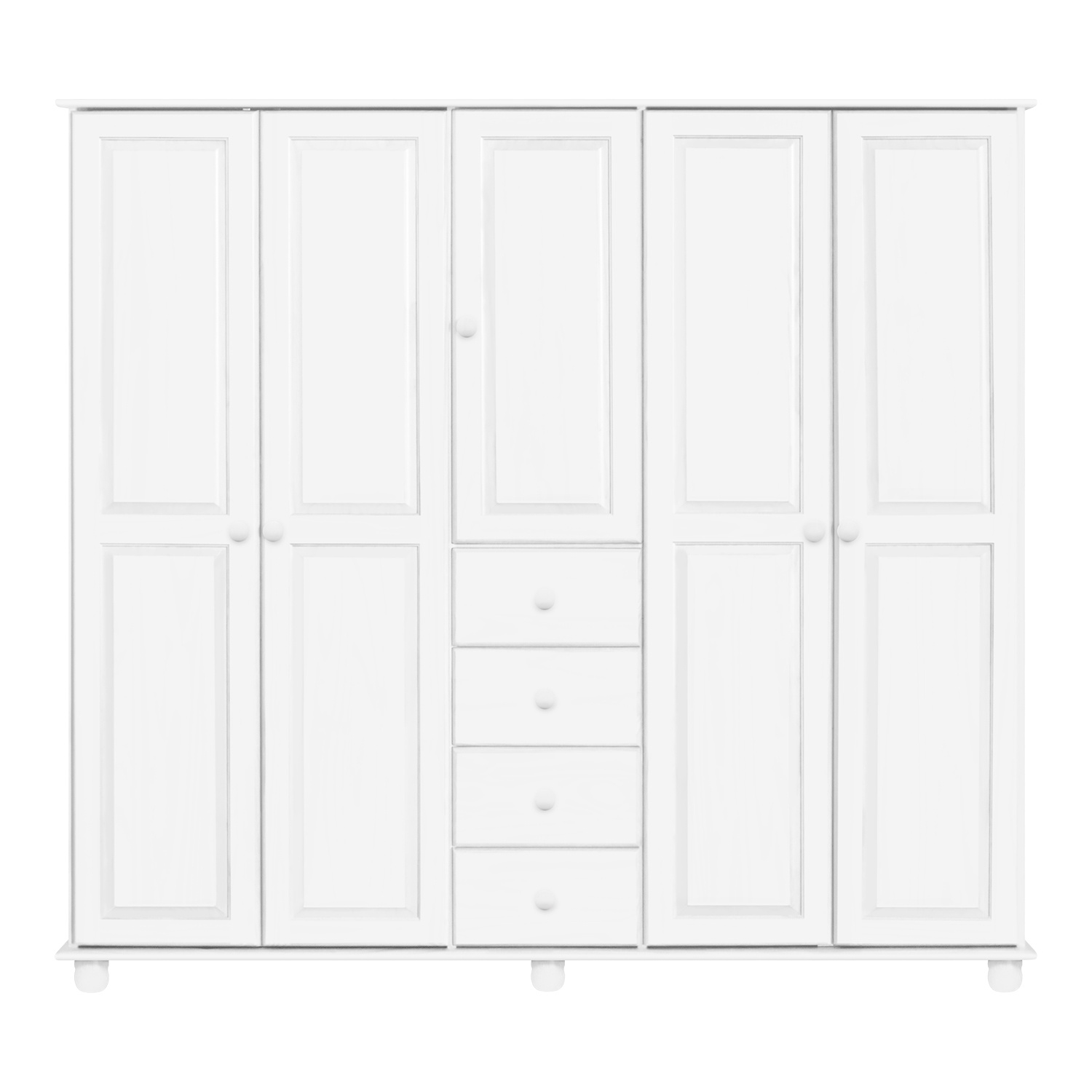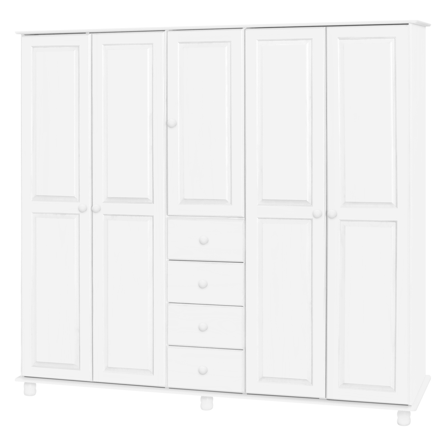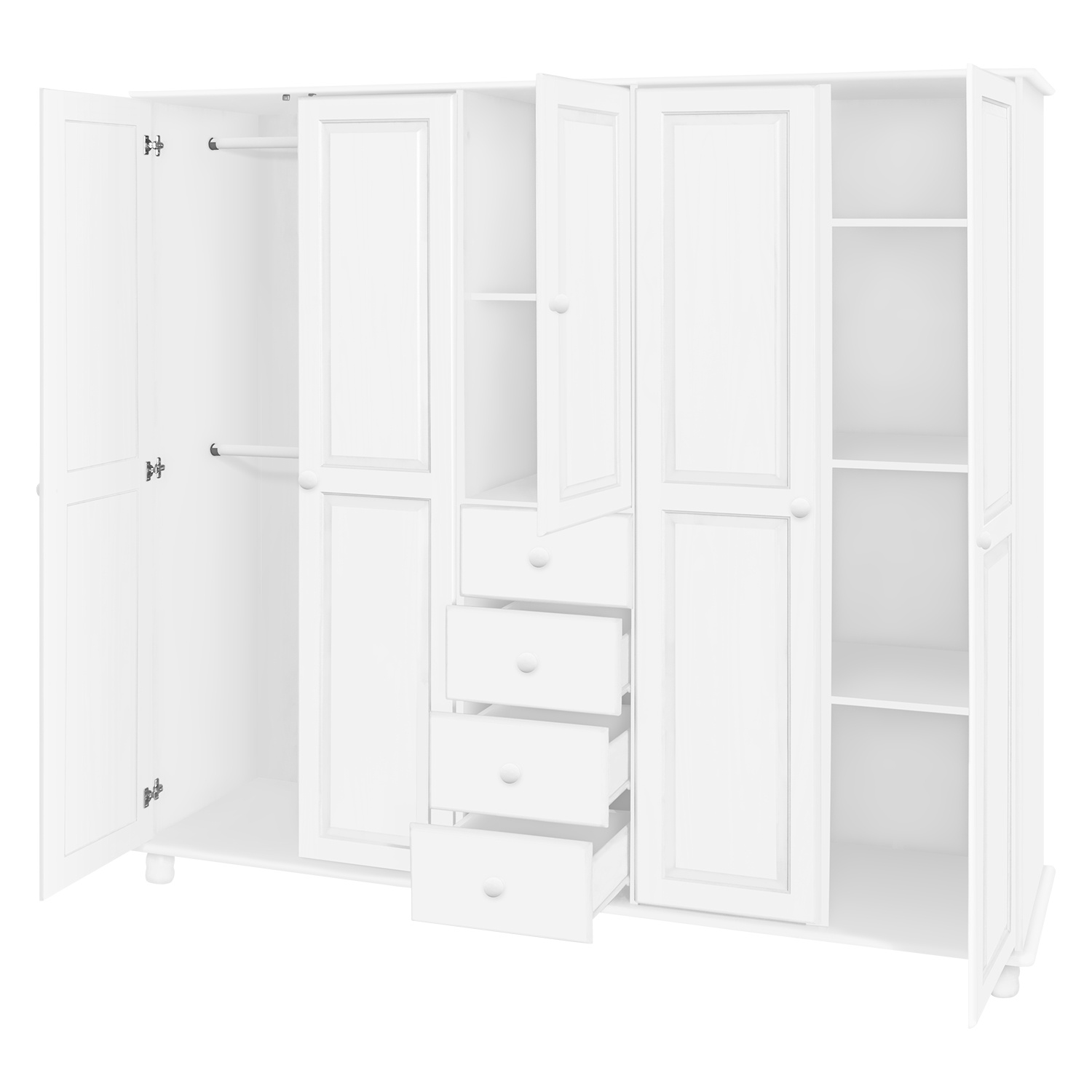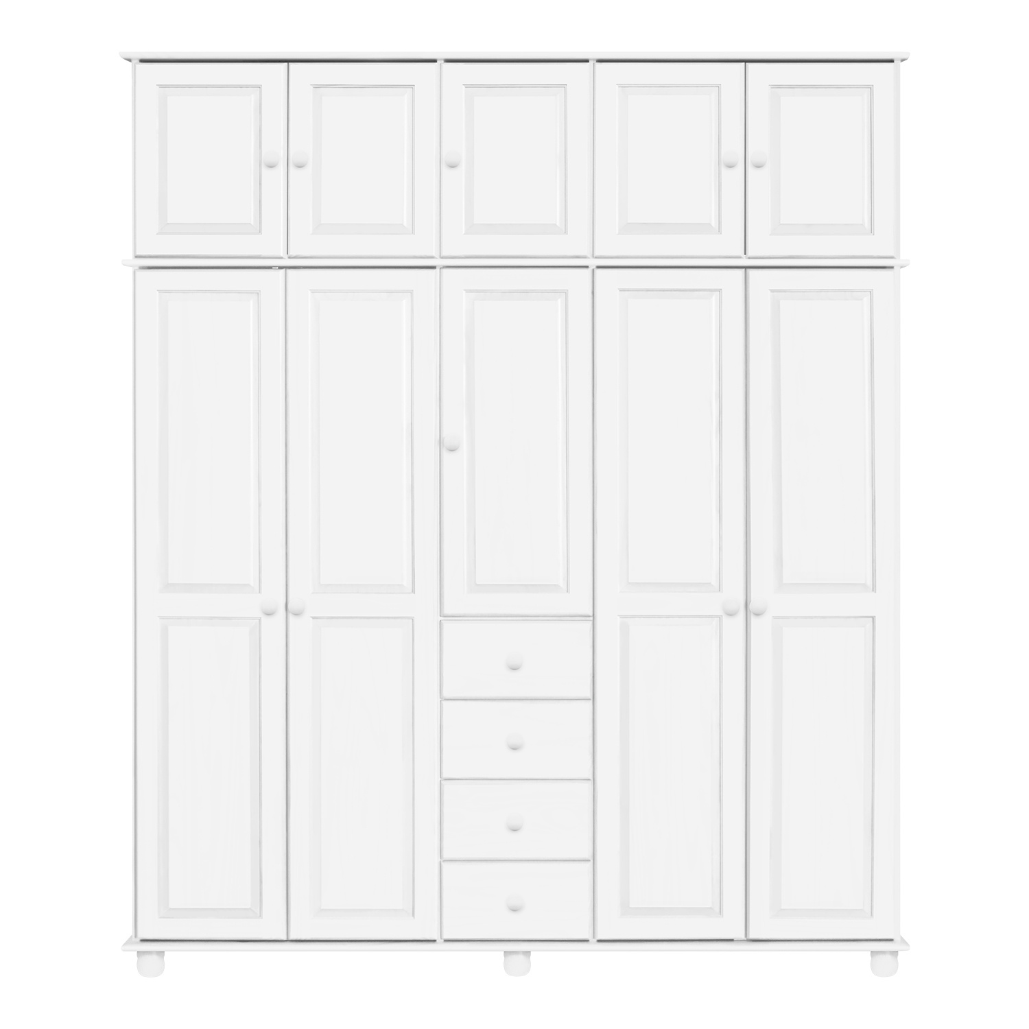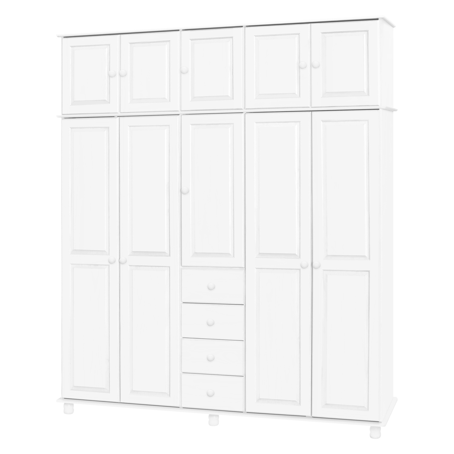 materiál masiv borovice, barevné provedení bílý lak čtyři zásuvky s kovovými pojezdy v levé části dvě šatní tyče, ve střední části 1 police a v pravé části 3 police doporučený nástavec 8855B