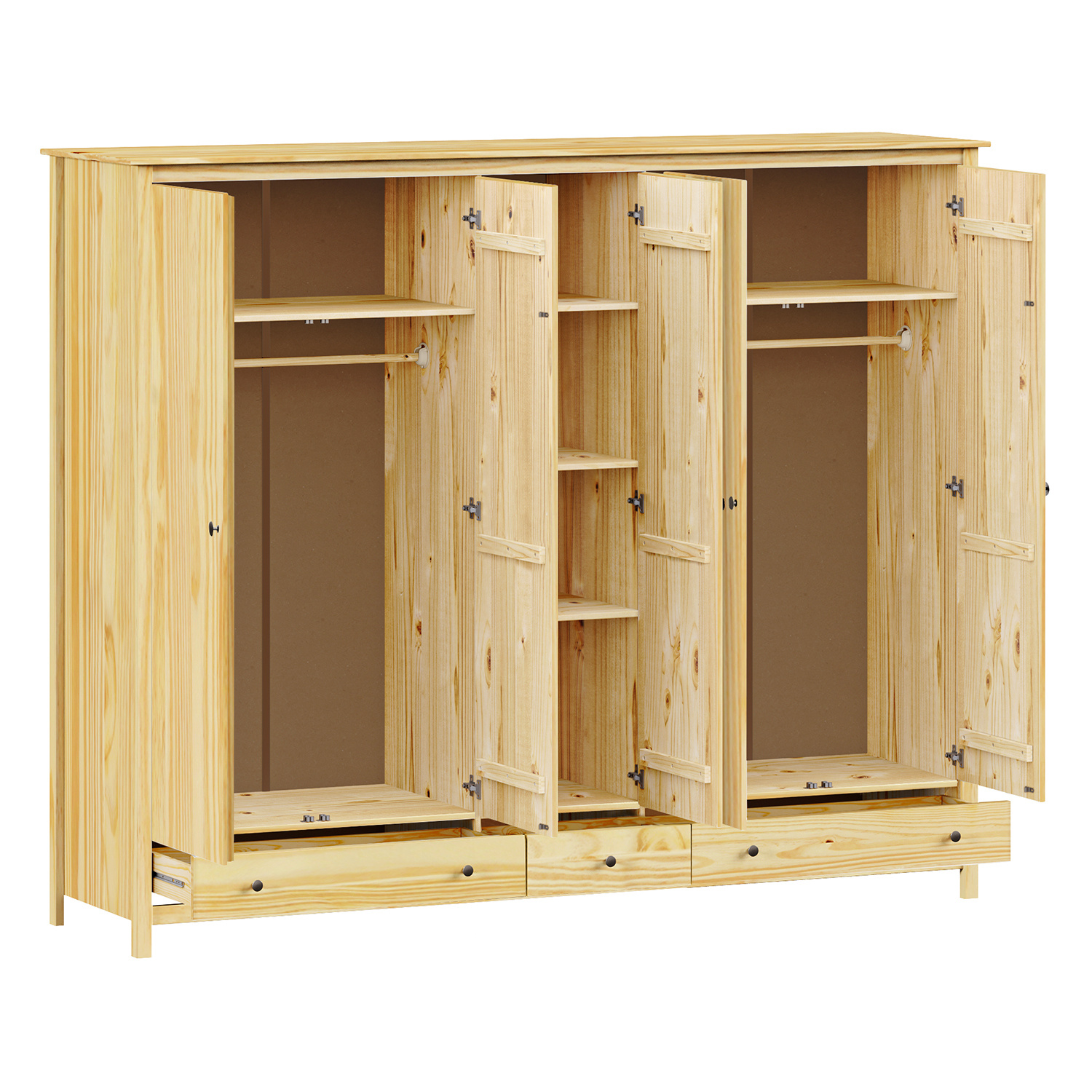 materiál masiv borovice, lakované provedení kovové úchytky prostor dělený v poměru 2:1:2 v levé a pravé širší části šatní tyč a police na klobouky ve střední úzké části 3 police ve spodní části 3 zásuvky s kovovými pojezdy doporučený nástavec 8169K