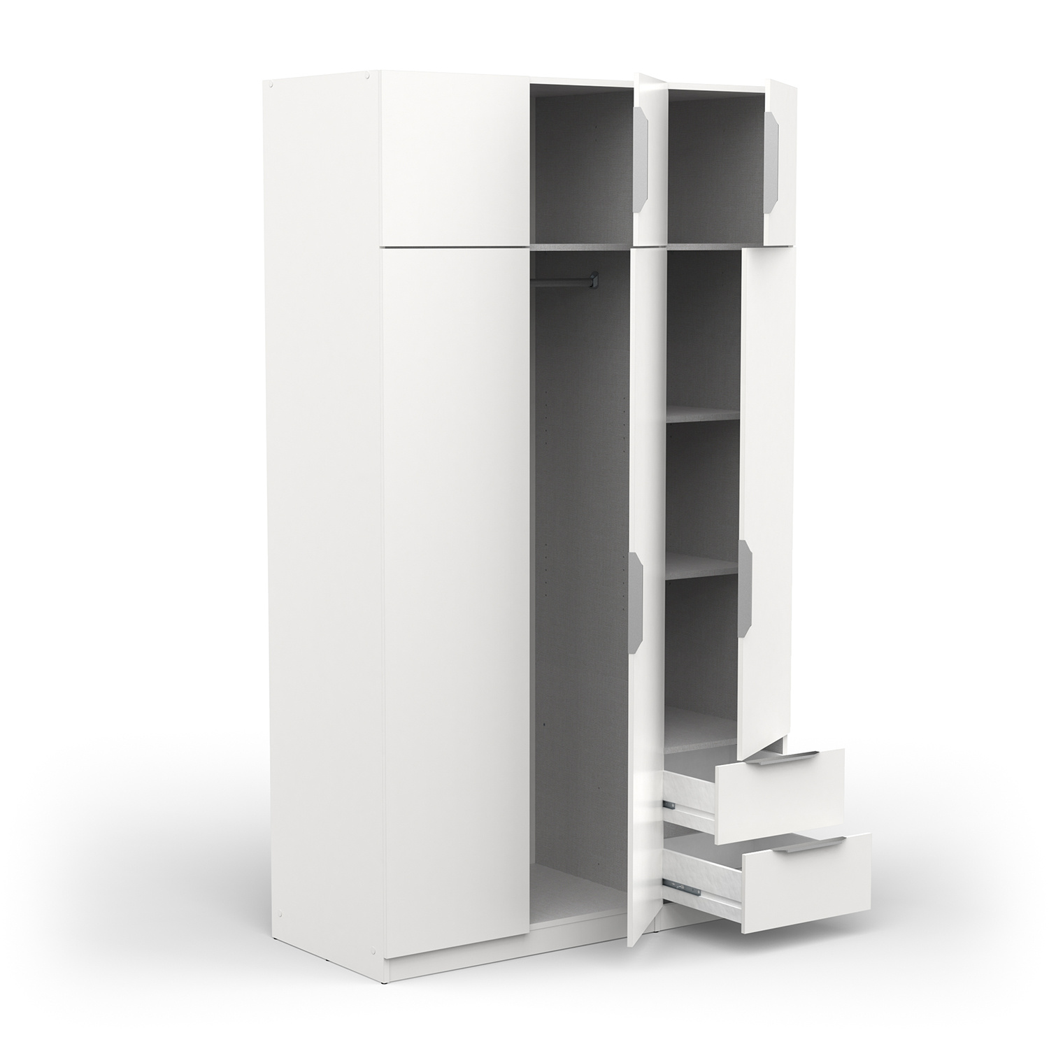 barevné provedení bílá prostor dělený v poměru 2:1, v levé části šatní tyč v pravé části 2 police a 2 zásuvky s kovovými pojezdy v horní části dva úložné prostory maximální nosnosti uvedeny v návodu k montáži