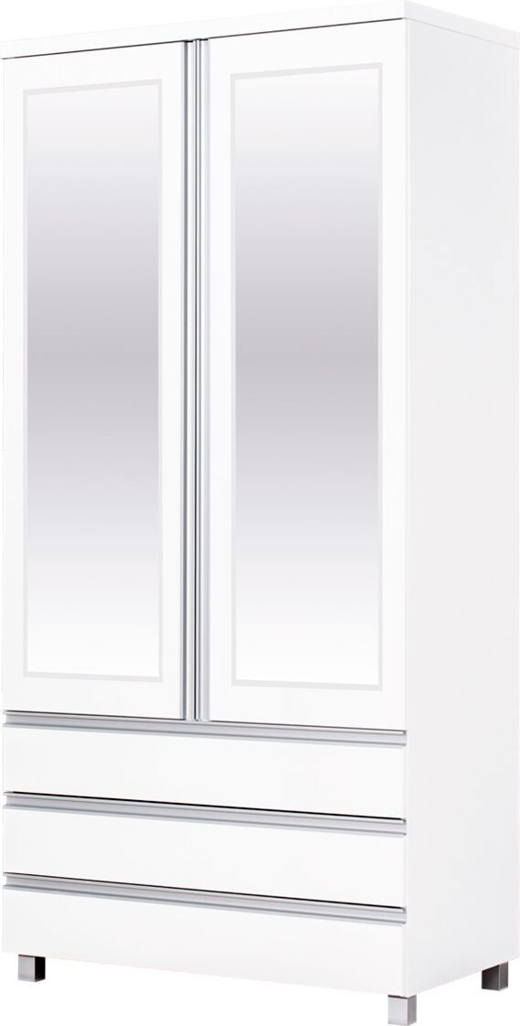 Prostorná dvoudveřová skříň se zrcadly a zásuvkami v barevném provedení bílá/ bílý lesk s otvíráním dvířek vlevo. Zboží dodáváme v demontu.