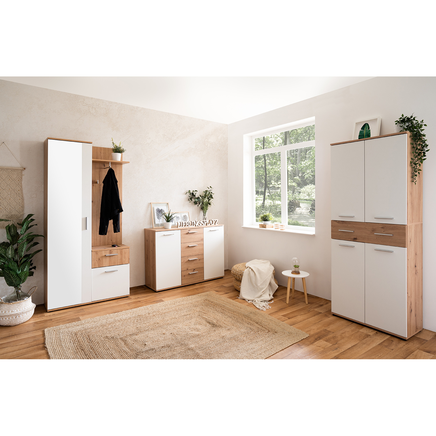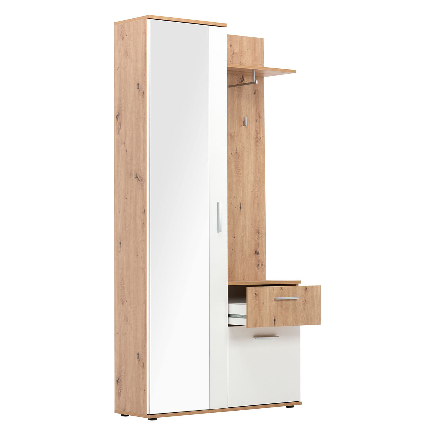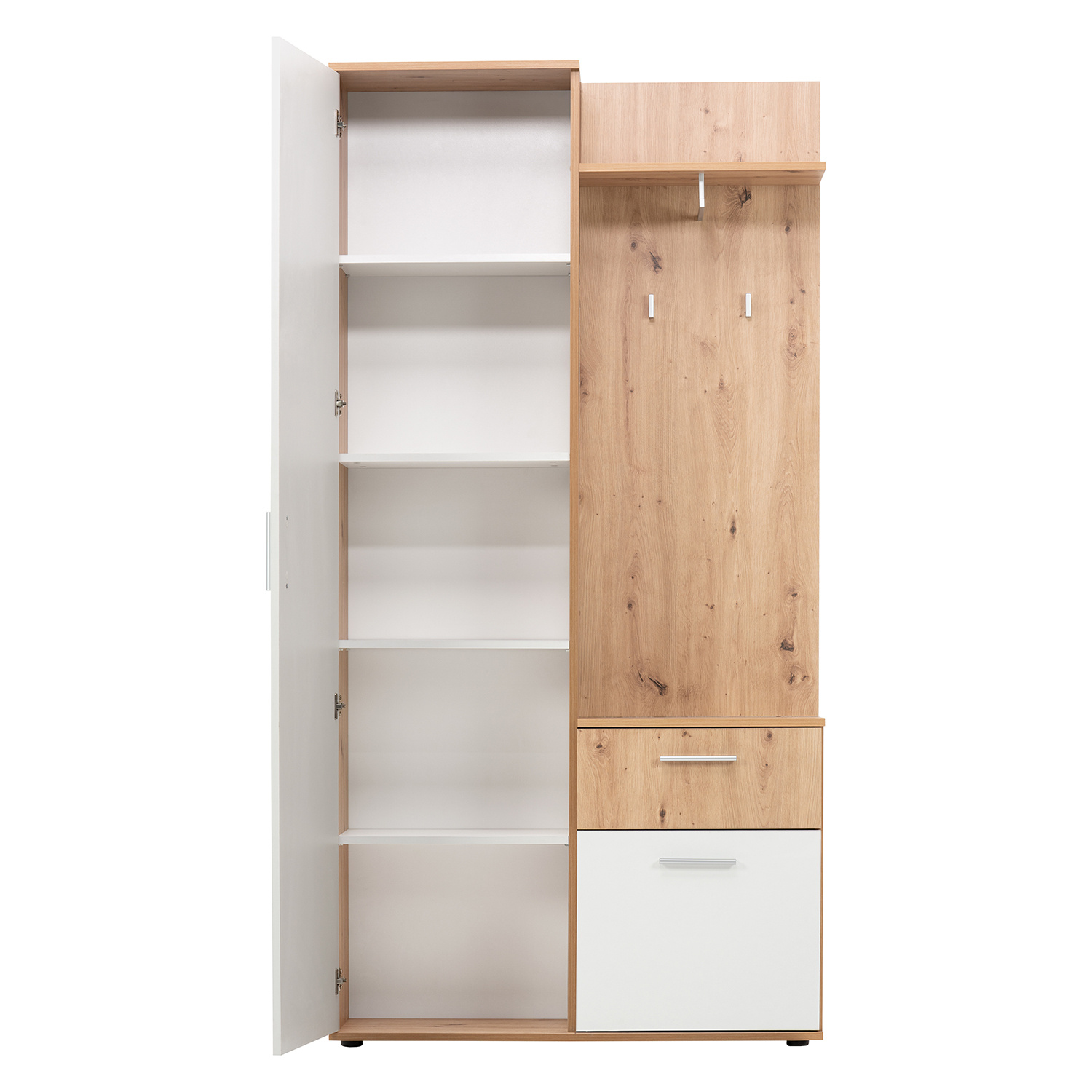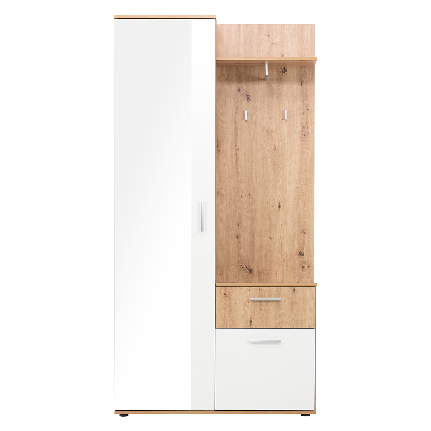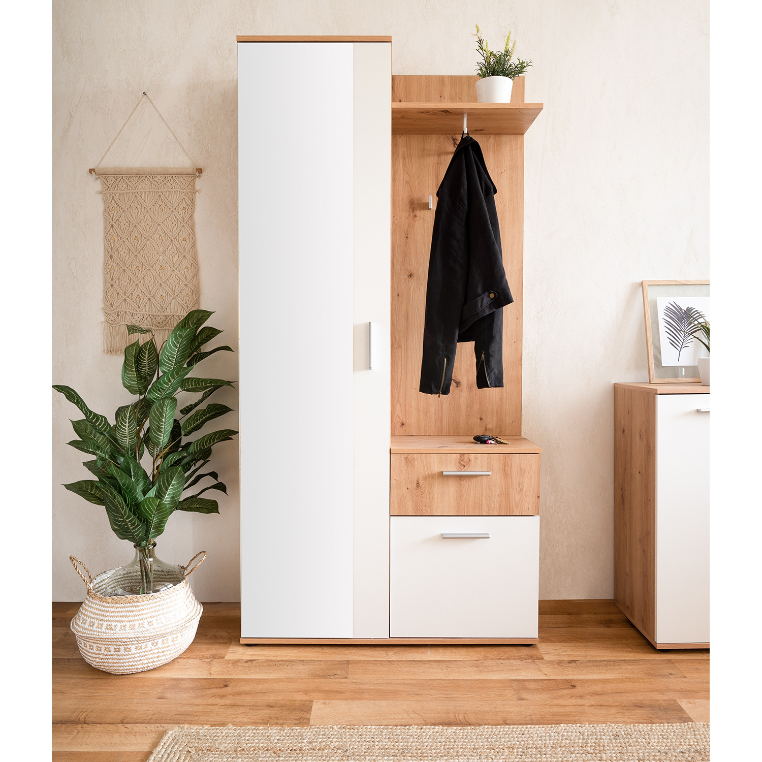 Skříň JACKY 40 v barevném provedení zlatý dub/bílá obsahuje vše, co je pro předsíň třeba. V levé části se nachází skříň, která obsahuje 4 police, 1 pevnou a 3 variabilní. Na přední straně dveří skříně naleznete téměř po celé ploše zrcadlo. V pravé části je malá skříňka a úzká zásuvka. Na zavěšení kabátu a doplňků pak poslouží stěna s tyčí na ramínka, police a háček. V mžiku tak budete mít prakticky vybavený celý prostor. Vysoká skříň pojme velké množství bot, lze ji využít i na kabelky a doplňky, zásuvka poslouží k uložení klíčů a malá skříňka na přezůvky. Na tyč na ramínka pověsíte bundy a kabáty a na háček lze pověsit deštník, na polici pak odložíte pokrývky hlavy. Ve velkém zrcadle zvládnete konečné úpravy a můžete vykročit vstříc novým zážitkům. Nábytek v provedení zlatý dub/bílá bude vypadat skvěle v každé předsíni.