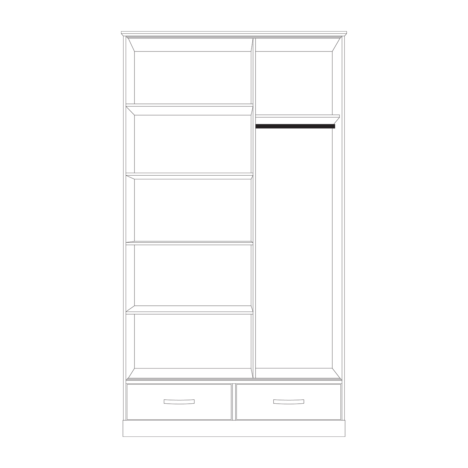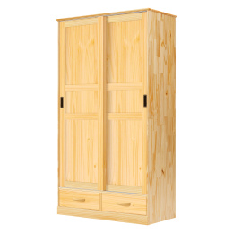 Šatní skříň je vyrobena z masivního borovicového dřeva v lakovaném provedení. Za posuvnými dveřmi naleznete v levé části 4 police, v pravé části 1 police a kovová šatní tyč. Ve spodní části skříně se nacházejí zásuvky s kovovými pojezdy.Díky svému vybavení nabízí dostatek úložného prostoru. Zboží dodáváme v demontu.