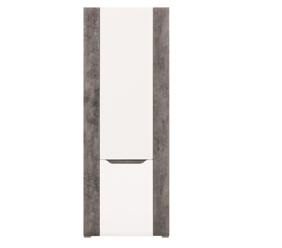 Policová skříň Brando v dezénu bílý lesk/ beton. Korpusy a vrchní desky mají sílu lamina 16mm, hrany chrání ABS 0,5mm. Dvířka se systémem tichého dovírání a zásuvky jsou z MDF o síle 18mm potažené folií (PVC). Nožky jsou plastové, úchyty frézované. Zboží dodáváme v demontu.