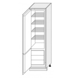 Tato skříň je určena pro vestavnou ledničku. Korpus skříňky je vyroben z lamina nejvyšší kvality o tloušťce 18 mm v dezénu dle výběru. Možnost výběru provedení dvířek z dub artisan  nebo dub artisan/ černá. Panty blum clip. Zadní část skříňky je vyrobena z materiálu sololit v bílé barvě. Nosnost polic je max 15-25kg. Dolní skříňky jsou dodávány bez pracovní desky. Dolní skříňka je součástí kuchyně Fiuggi, která se dá sestavit dle vašeho přání. Zboží dodáváme v demontu.